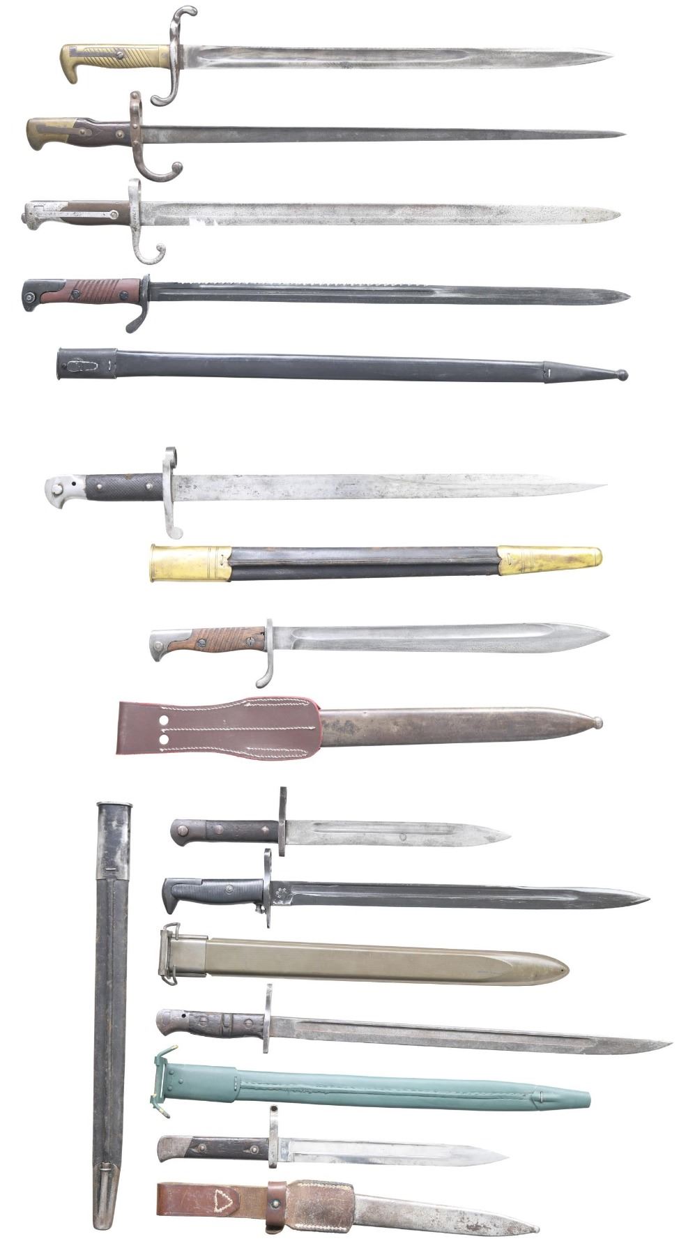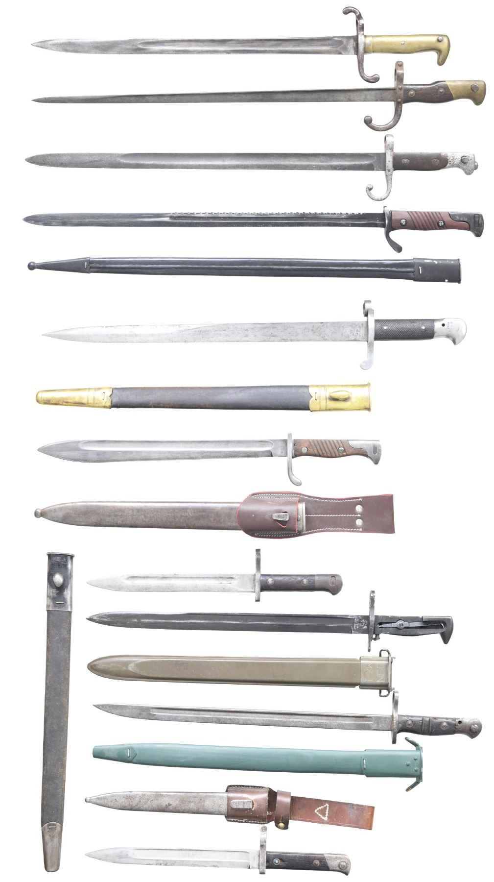 This lot consists of the following varied bayonets: 1) US M1917 Bayonet. Remington made M1917 bayonet with repainted leather scabbard. Bayonet has grooved hardwood handles. Scabbard has reapplied gray paint. CONDITION: metal is an overall dull gray patina with scattered oxidation & pitting. Handles show dings, chipping & handling wear. Scabbard shows some scattered light flaking paint. 2) German 98/05 Butcher Bayonet. 1914 dated Simson 98/05 with scabbard & repro leather frog. Grooved wooden handles. CONDITION: metal parts of bayonet are mostly a gray patina with some oxidation & light pitting. Grip panels show some dings & a couple light chips. Scabbard is a gray patina with scattered oxidation & some dents. Repro scabbard is in very good condition. 3) French 1874 T-Back Gras Bayonet. No scabbard present. CONDITION: metal is mostly a dull gray patina with oxidation & dings. Wooden handles show some dings & handling marks. 4) Italian 1870 Vetterli Bayonet. No scabbard present. Blade has Terni arsenal marking. CONDITION: metal is an overall silvery-gray color with oxidation & scattered pitting. Handles have a dark appearance with some handling wear. 5) German 1898 Sawback bayonet. Bayonet is unmarked & likely repro. Leather scabbard present. CONDITION: good to very good with some light edge & storage wear. 6) British Pattern 1888 Bayonet. Leather scabbard present. Blade has Wilkinson markings with 1893 date. Pommel has Nepalese "NEP" marking. Checkered rubber grips. CONDITION: metal parts of bayonet remain partially bright with scattered fading to gray, oxidation & dings. Handles show heavy checkering wear with some dings. Scabbard shows scattered flaking & crazing. 7) Austrian 1888 Export Bayonet. Crossguard has export "IQ" marking & is missing a screw. Steel scabbard & leather frog present. CONDITION: blade & crossguard have been cleaned to bright with some oxidation & pitting. Grips have a dark appearance with some some chips , dings & flaking. Frog shows white staining & crazing. Scabbard is a silvery-gray color with some oxidation. 8) Turkish 1935 Bayonet. Pommel marked "ASFA". No scabbard present. CONDITION: blade appears cleaned with a silvery-gray appearance, some oxidation & scratches. Other metal parts are a dull gray color. Wooden handles area dark color with some small cracks, chips & dings. 8) German 1871 Mauser Bayonet. No scabbard present. Crossguard has unit marking that appears to be for the 54th reserve infantry regiment. Blade has V Jung Suhl maker's marking. Brass grip panels. CONDITION: steel parts of bayonet are a dull gray color with some bright areas, scattered oxidation & some dings. Brass handles are a dull yellow patina with oxidation staining & dings. 10) Repro US M1905 Bayonet. Modern "US 1942" & "USMC" markings on blade. One grip panel missing. USN MK1 scabbard present. Bayonet does not stay in scabbard. CONDITION: good to very good. 11) British scabbard that appears to be for a P14 or SMLE. CONDITION: fair to good with age wear. (02-24433/MJC). $300-600 for lot.