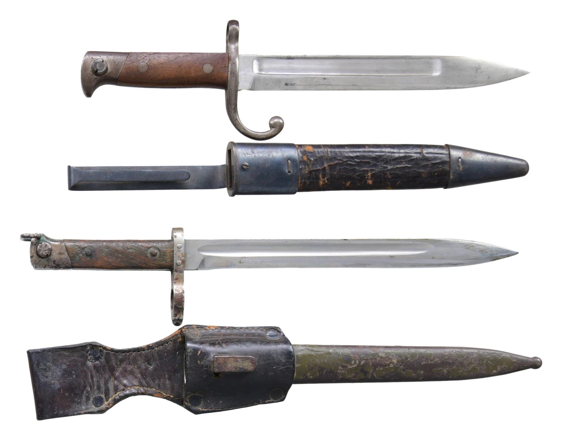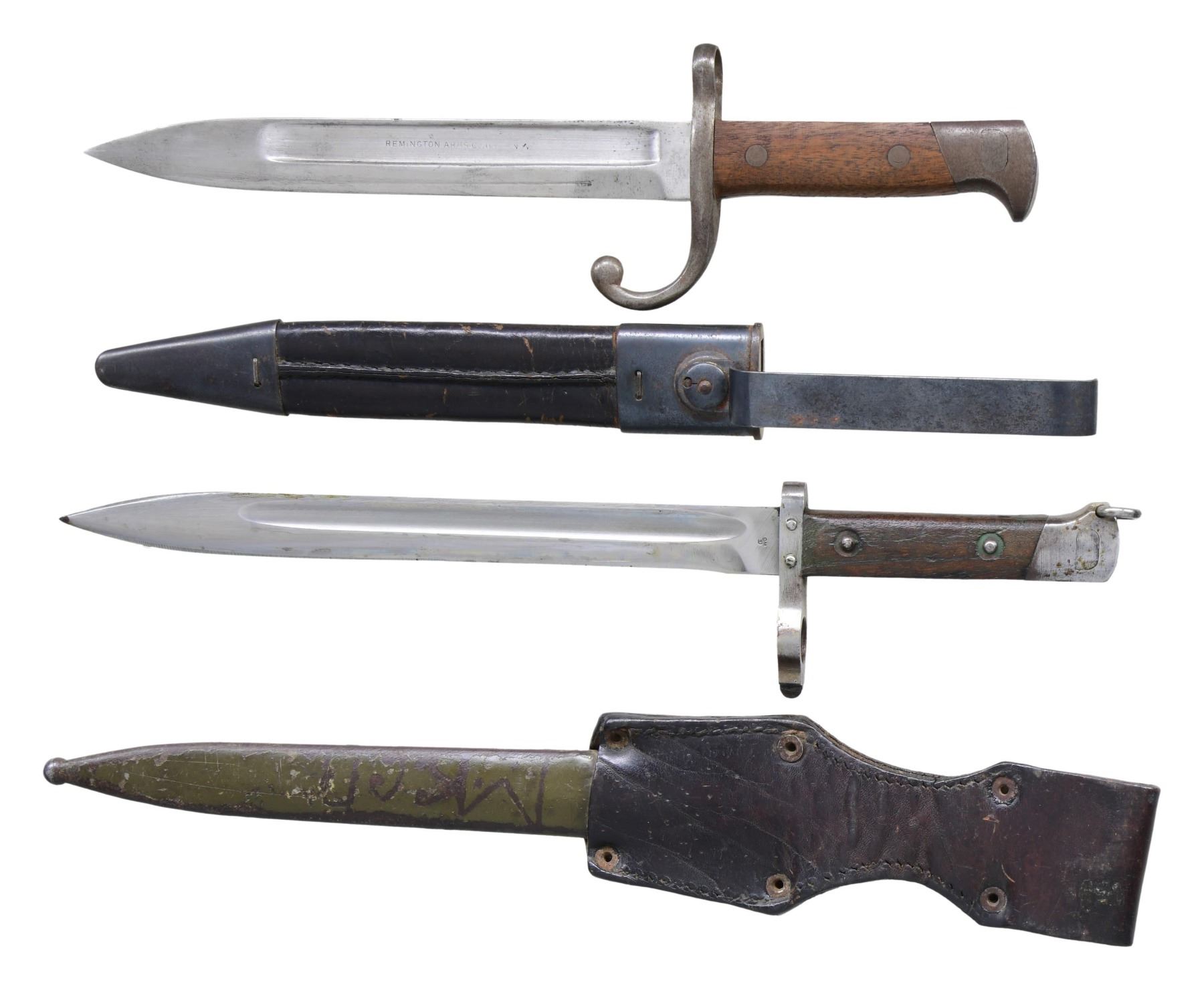 This lot consists of the following bayonets: 1) SCARCE REMINGTON 1899 LEE BAYONET. Bayonet for the Remington Lee 1899 rifle with leather scabbard & steel throat. Blade has partially faint Remington Arms marking. CONDITION: blade appears lightly cleaned with some light oxidation. Other metal parts of bayonet are a gray patina with a couple areas of light pitting & oxidation. Wooden handles show some handling wear. Scabbard shows some crazing & flaking. 2) AUSTRIAN 1895 MANNLICHER NCO BAYONET. NCO bayonet with hook on pommel. Blade has Steyr OWG marking on one side & Austrian eagle on the other. Crossguard numbered "44". Hardwood handles. Steel scabbard with green paint that appears to have indiscernible initials & leather frog. CONDITION: blade remains mostly bright with some light oxidation & dried grease. Other metal parts of bayonet are turning gray with scattered oxidation. Wooden grip panels show heavy handling wear with some dings. Scabbard shows overall flaking green paint & some oxidation Scabbard shows scattered crazing, & some flaking. (02-24431/MJC). $600-1000 for pair.