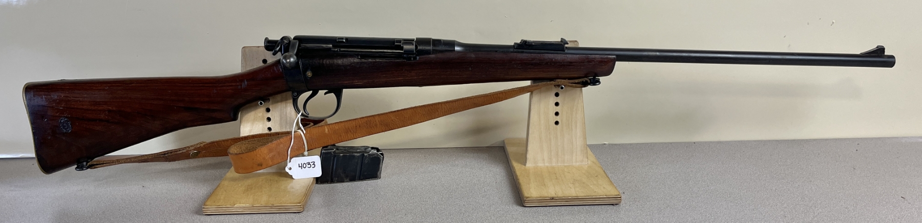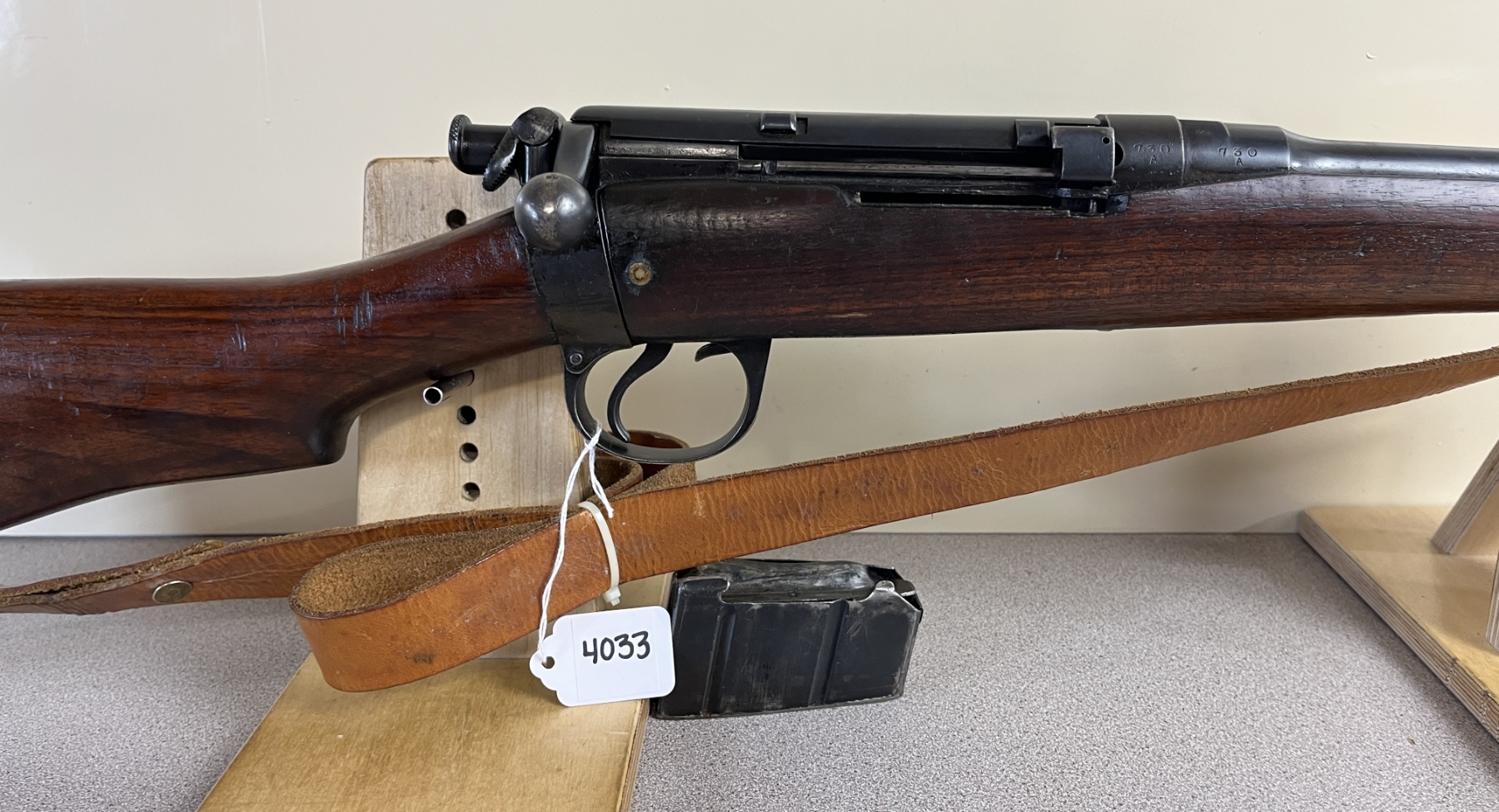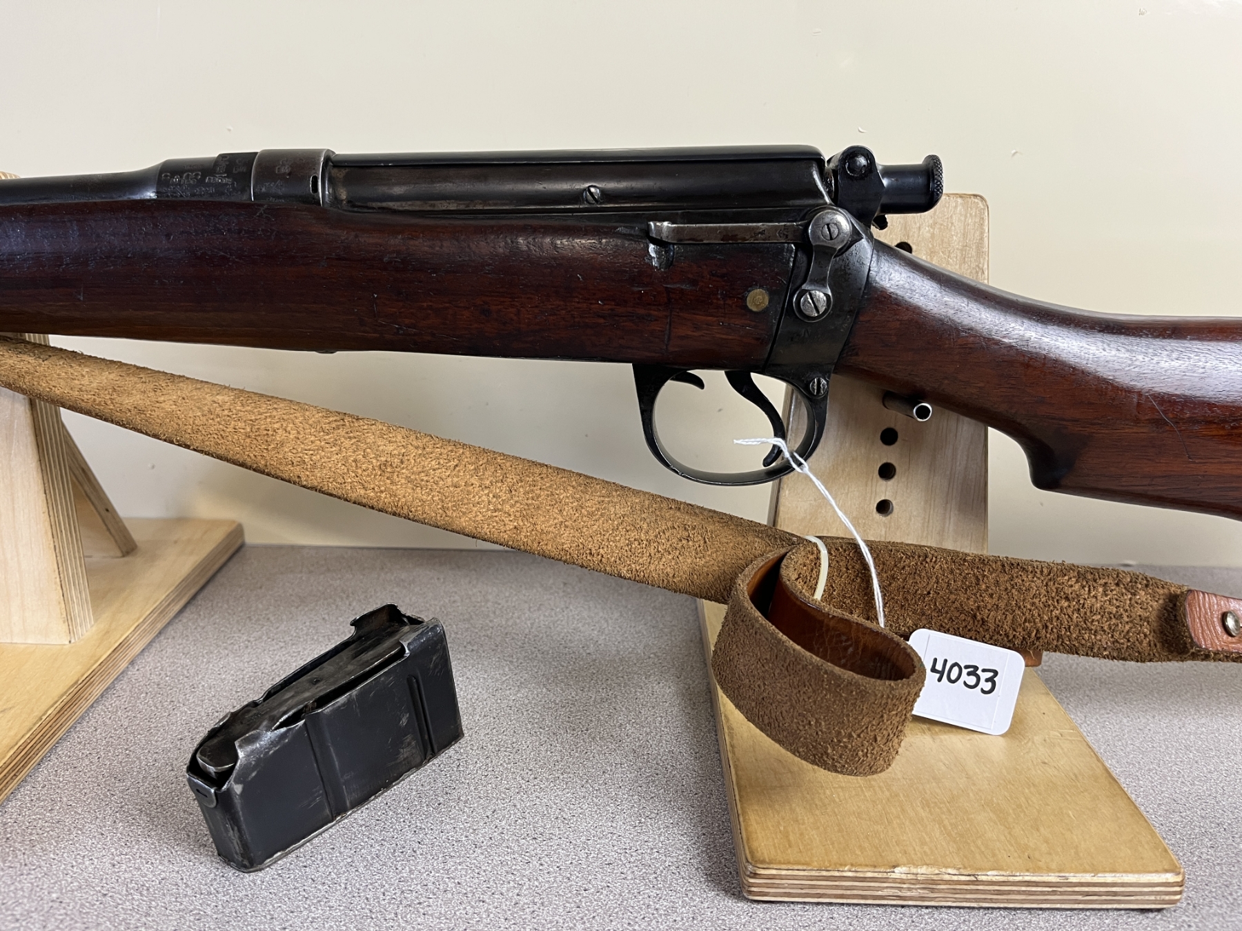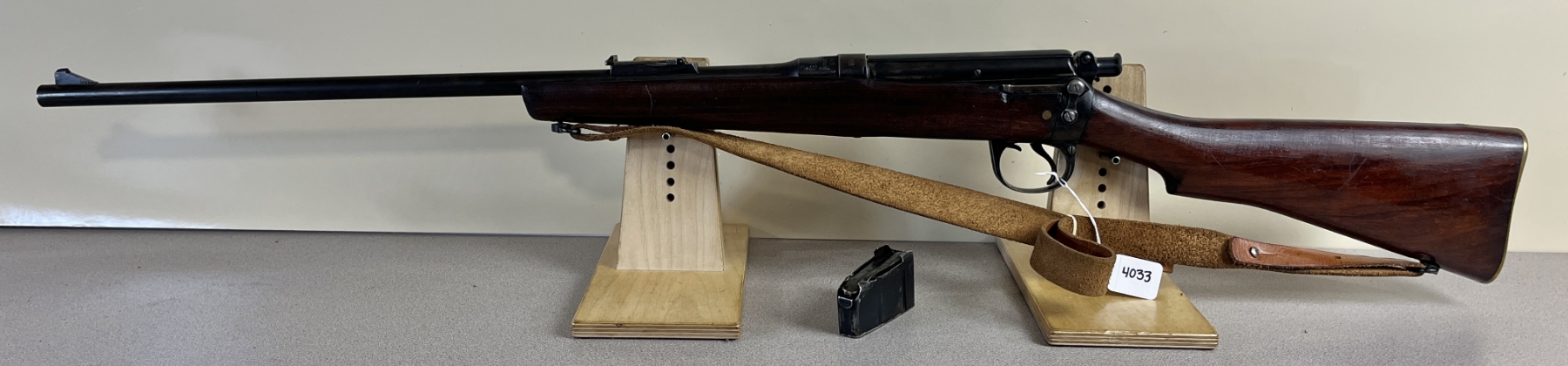 CONDITION: F OVERALL. BORE P. SPECS: 24 1/4IN BBL. INCL 1X SPORTERIZED MAG. EXTRAS: LEATHER SLING. S/N: 730A.