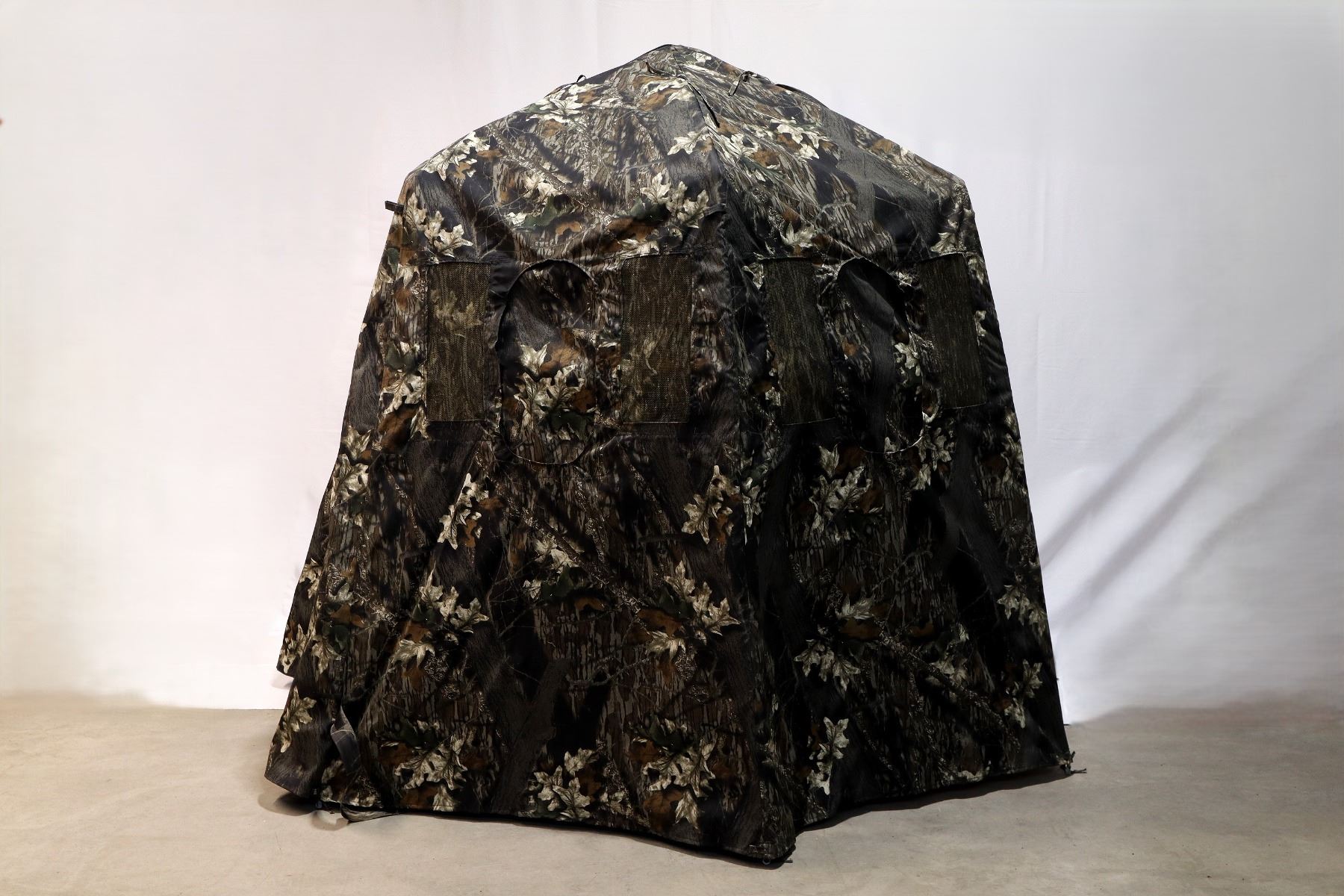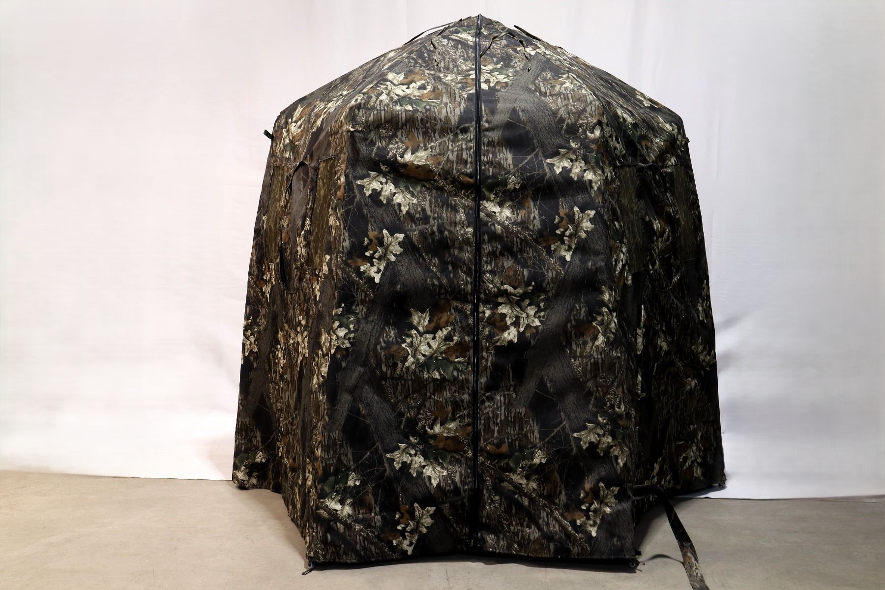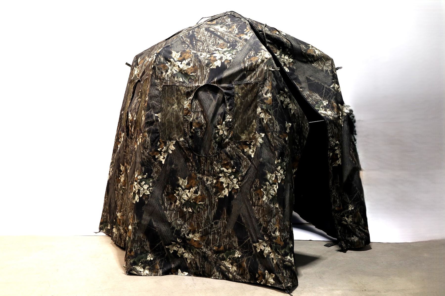 LOT INCLUDES; (1) LUCK'S HUNTING BLIND, MOSSY OAK CAMO, ZIPPERED DOOR, (5) OPEN WINDOWS WITH VELCRO COVERS, (10) SCREENED WINDOWS WITH VELCRO COVERS, ALUMINUM FRAME, (6) TENT STAKE LOOPS, (6) TIE LOOPS, APPROX. OAL 84"X84"X72", SHOWS WEAR AND TEAR FROM USAGE, SEE PHOTOS.