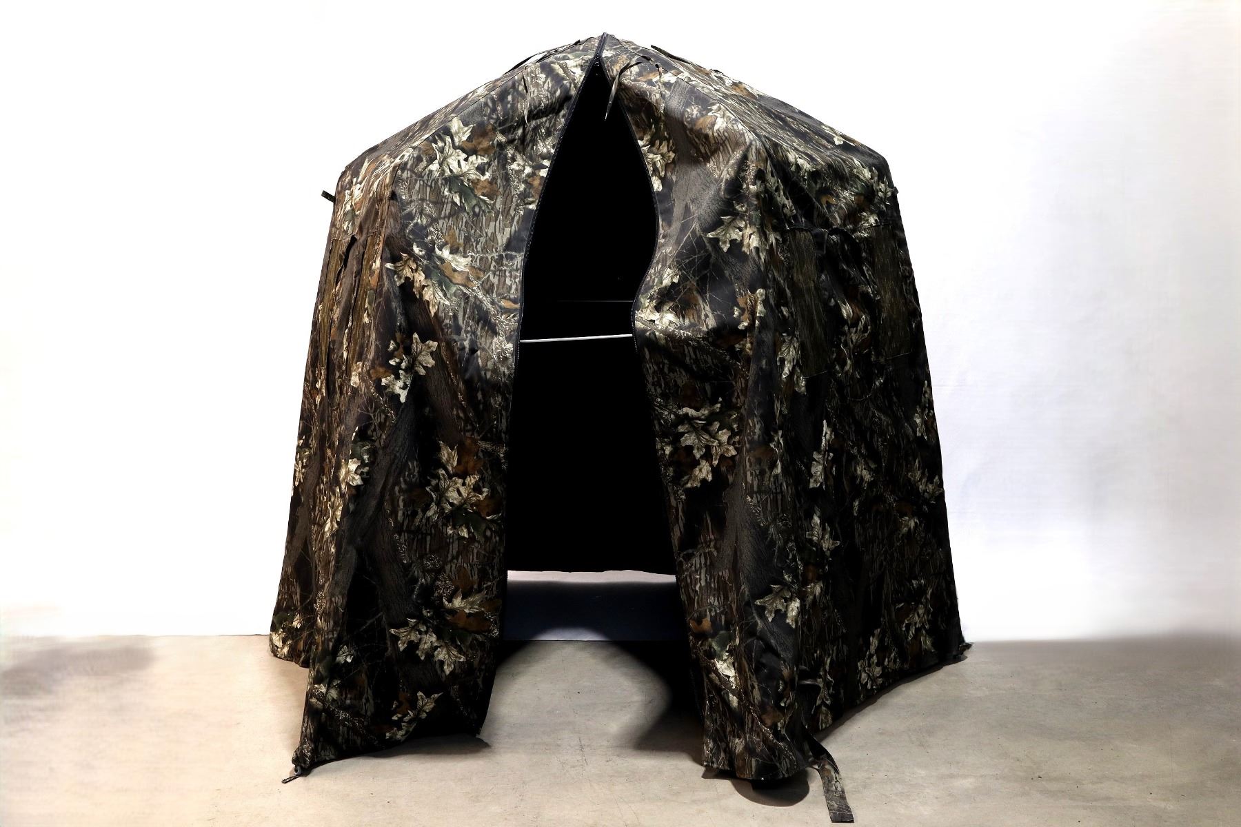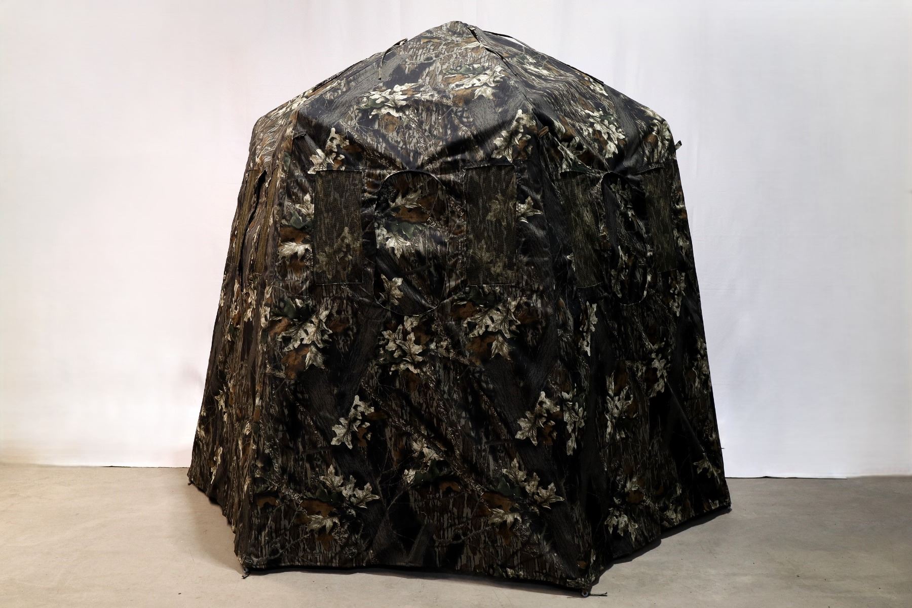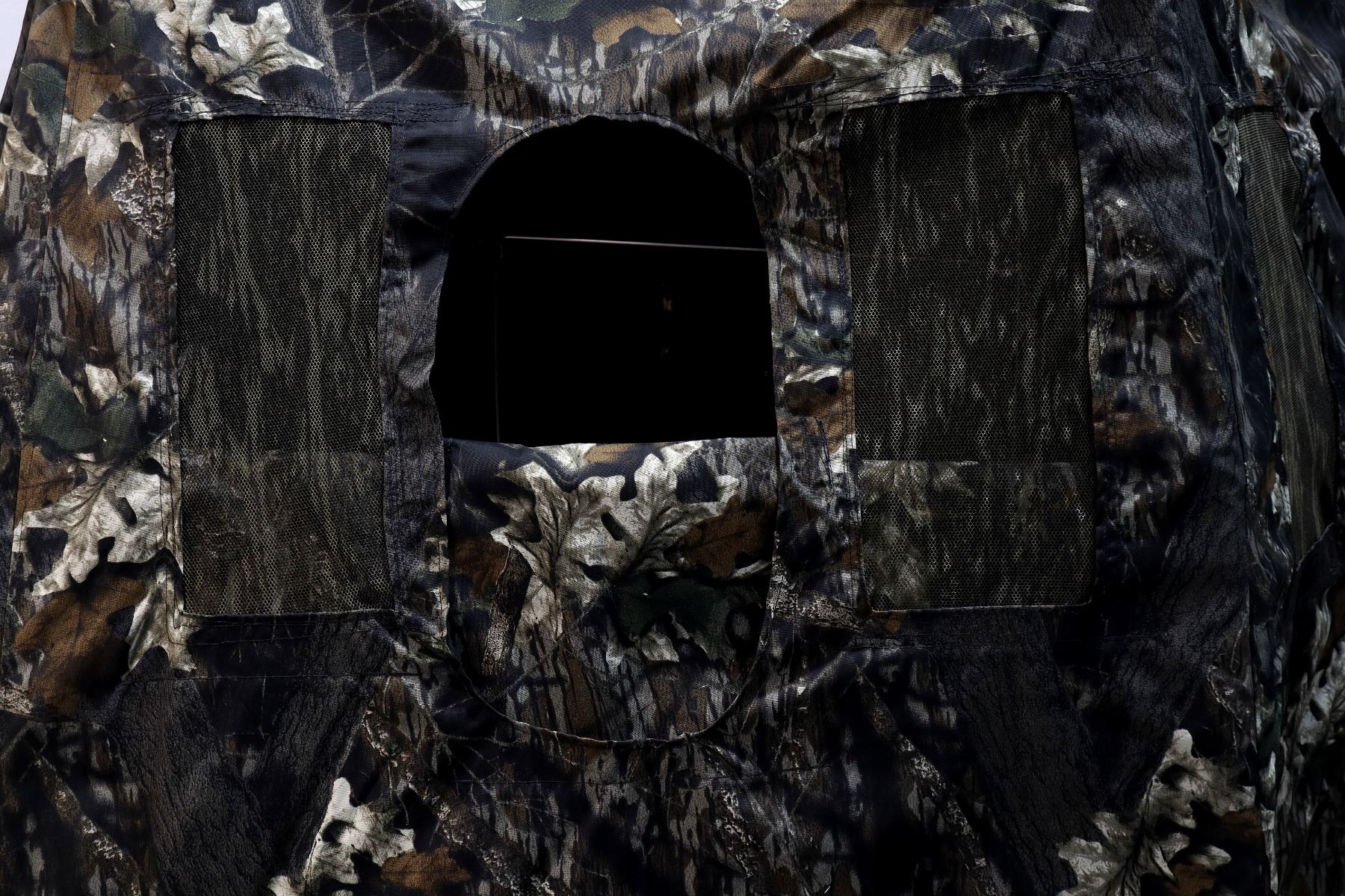 LOT INCLUDES; (1) LUCK'S HUNTING BLIND, MOSSY OAK CAMO, ZIPPERED DOOR, (5) OPEN WINDOWS WITH VELCRO COVERS, (10) SCREENED WINDOWS WITH VELCRO COVERS, ALUMINUM FRAME, (6) TENT STAKE LOOPS, (6) TIE LOOPS, APPROX. OAL 84"X84"X72", SHOWS WEAR AND TEAR FROM USAGE, SEE PHOTOS.