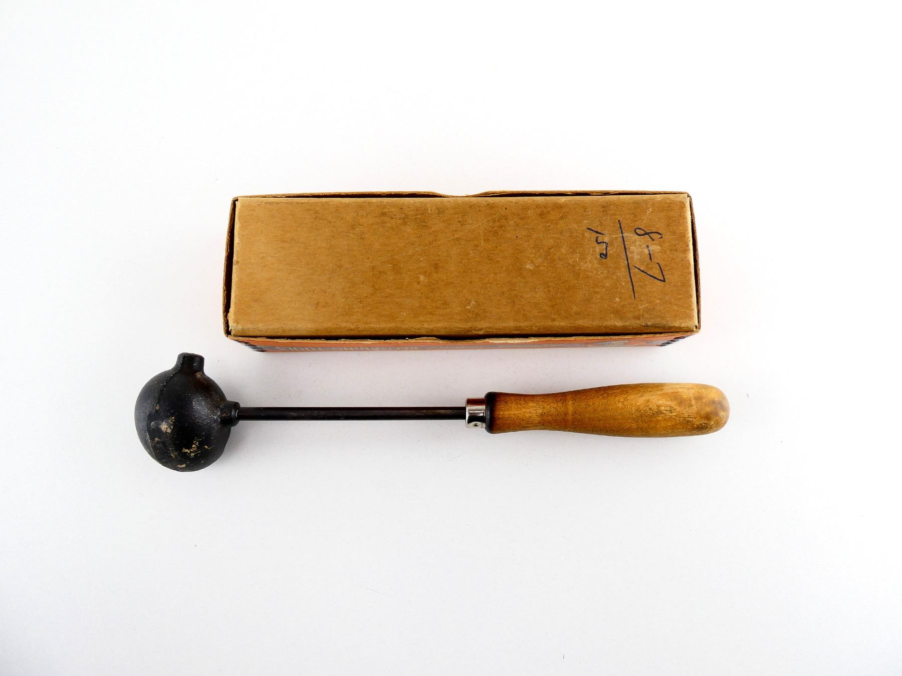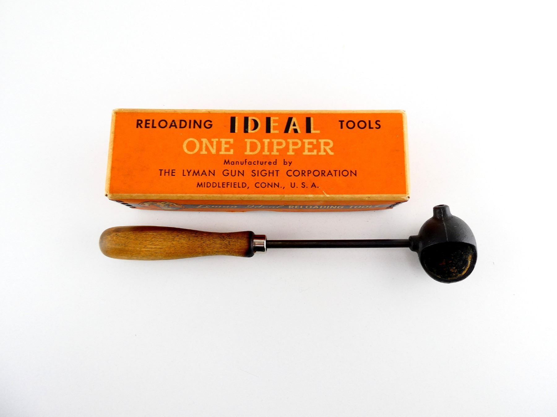(1) LEAD DIPPER WITH WOODEN HANDLE & ORIGINAL PACKAGING, DIPPER OVERALL LENGTH APPROX. 9 3/8". SEE PHOTOS.
