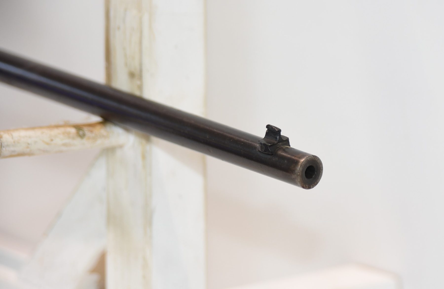 Metal shows finish wear, light corrosion on barrel, there are areas of light patina; condition is fair.