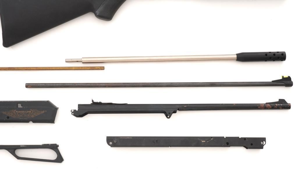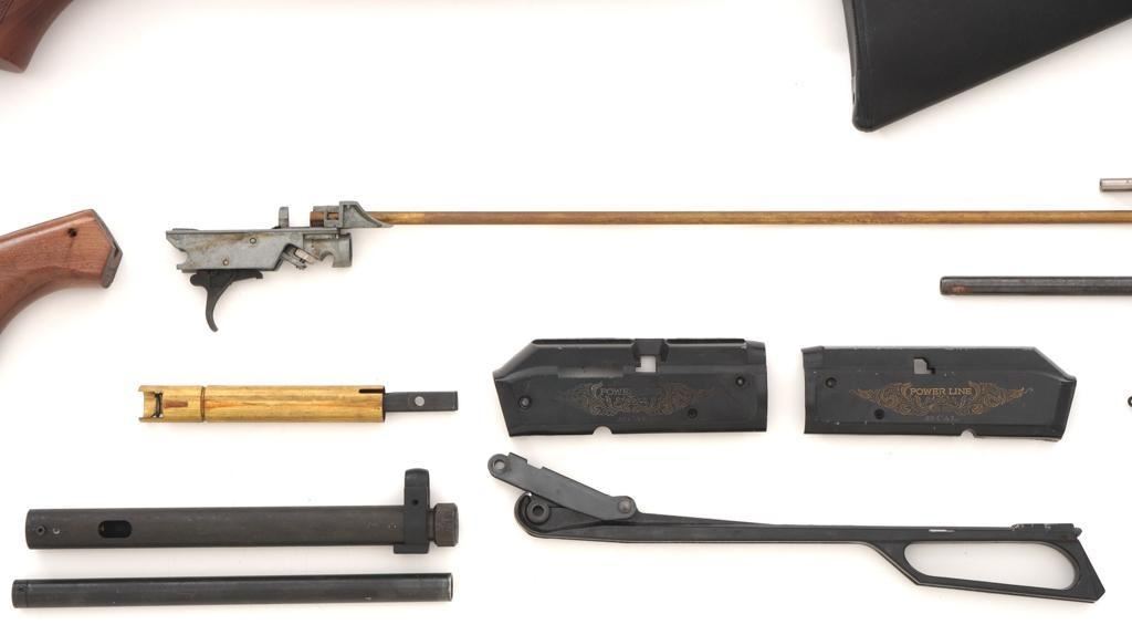 Large Lot of Misc. Air Rifle Parts & Accessories, including five (5) full stocks, buttstock, .177 cal. barrel with muzzle brake, .177 cal. barrel with trigger, .22 cal. barrel with front sight. Also included are misc. charging arms, barrel shroud, side plates, and CO2 housing. Unknown makers others than the side plates, which are marked "Powerline", thirteen cans of misc. caliber pellets (eight are unopened), grips, five (5) Umarex #2252500 8-shot rotary pistol magazines, another unmarked magazine, two (2) holsters, and other misc. parts. Most items range from fair to very good condition. Est.: $200-400/lot.