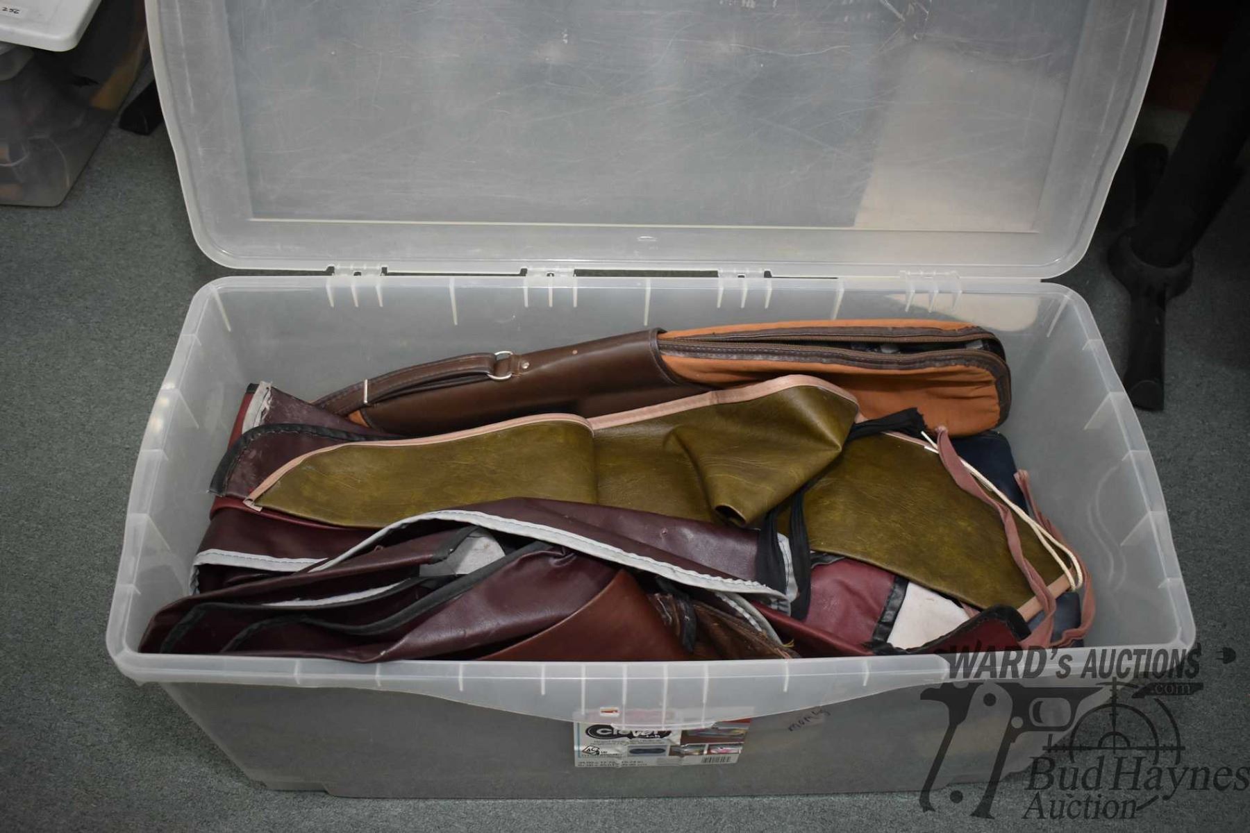 Large plastic tub w/ approx. 25 soft gun cases and socks