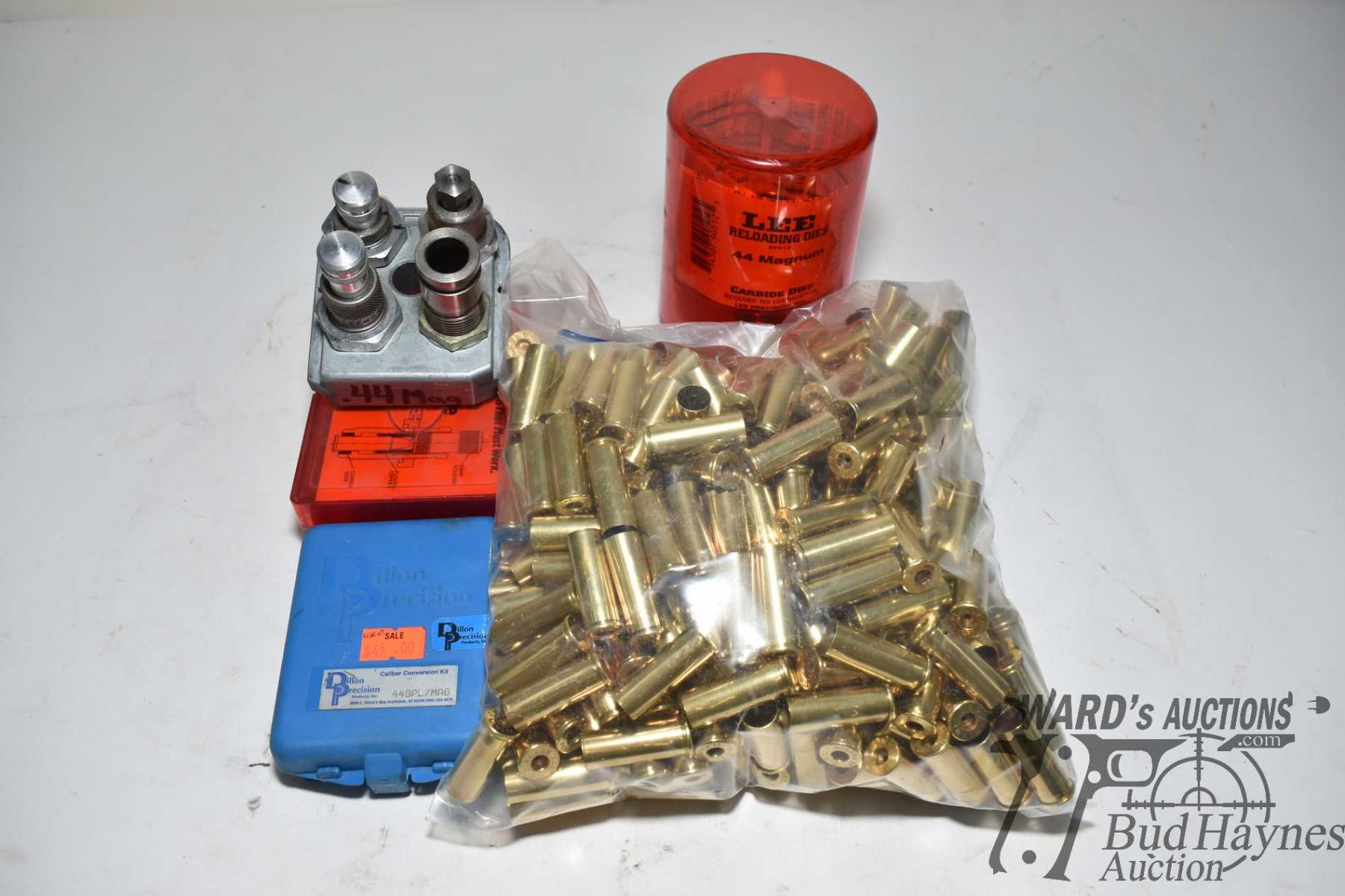 Lee .44 mag die set in Dillon tool block, caliber conversion kit and a 330 count bag of .44 mag brass