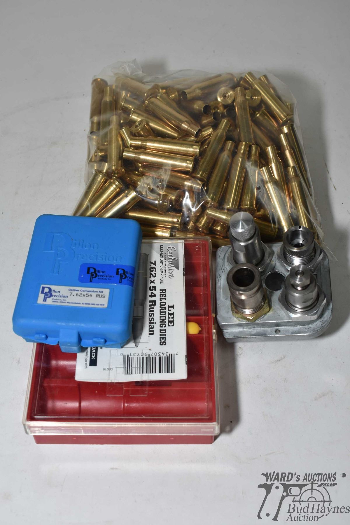 Lee 7.62 x 54 Russian die set in Dillon tool block, caliber conversion set and 160 count bag of brass