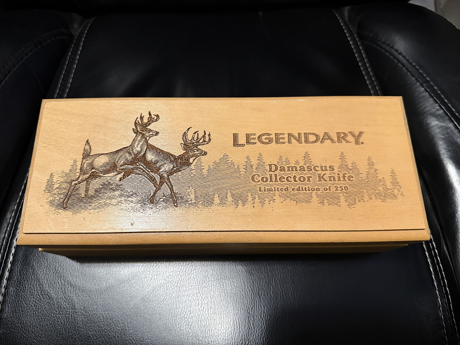This solid wood display box features engraved artwork of two deer on the lid, “Legendary Damascus Collector Knife – Limited Edition of 250” engraved text, smooth natural finish with brass-style hinges. Inside lid includes the full etched description of the knife series. Interior is designed to hold a collector knife securely.