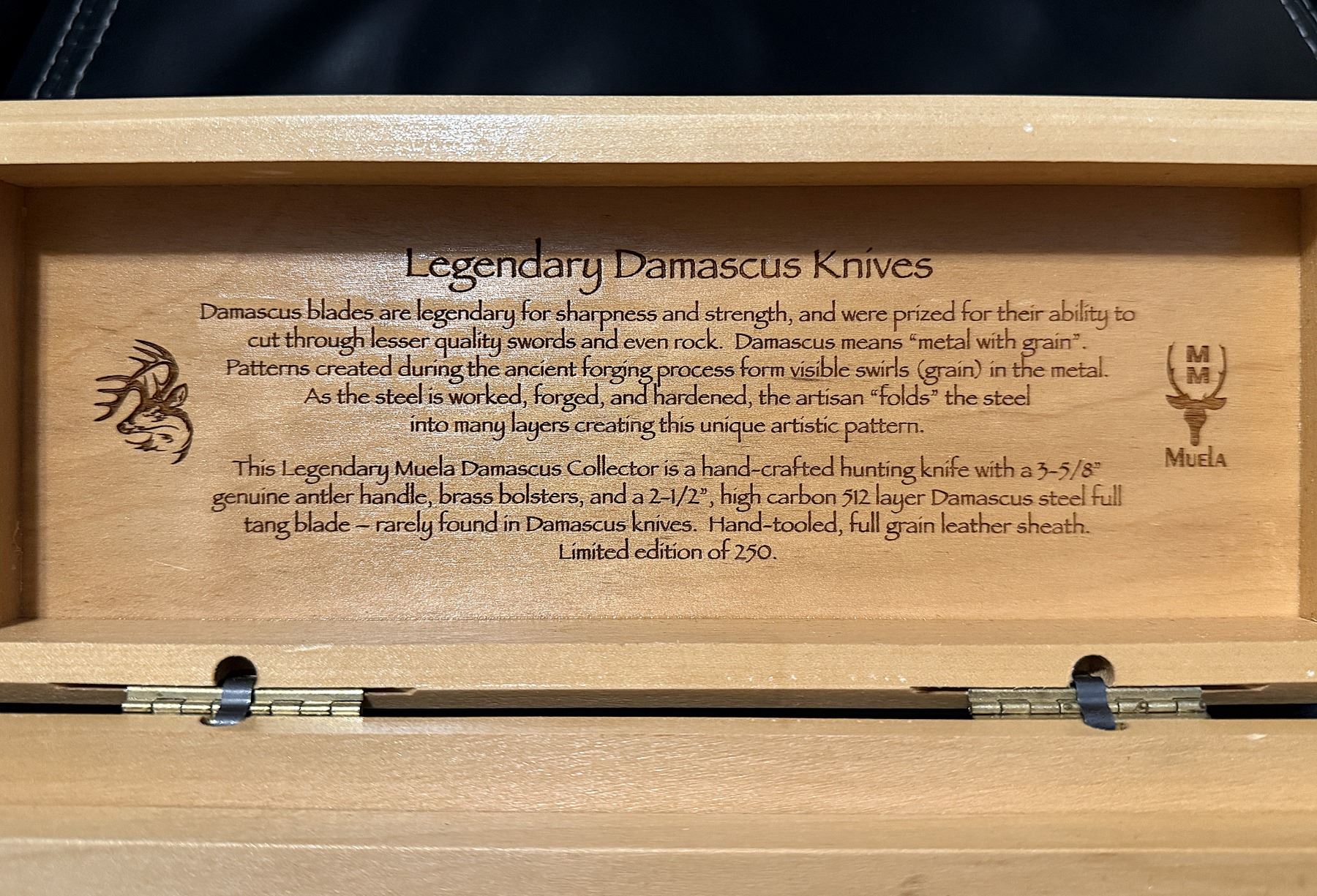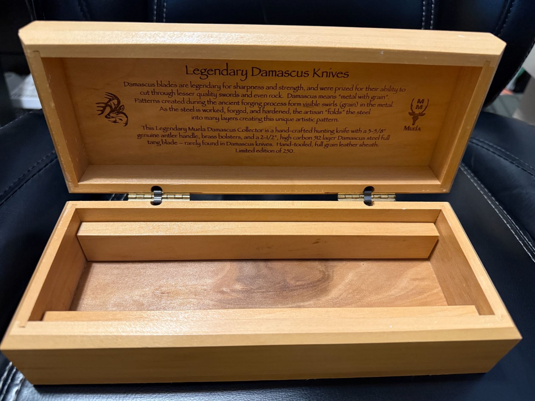 High-quality wooden presentation box originally made for the Legendary Muela Damascus Collector Knife, limited edition of 250. This listing is for the box only — no knife included.