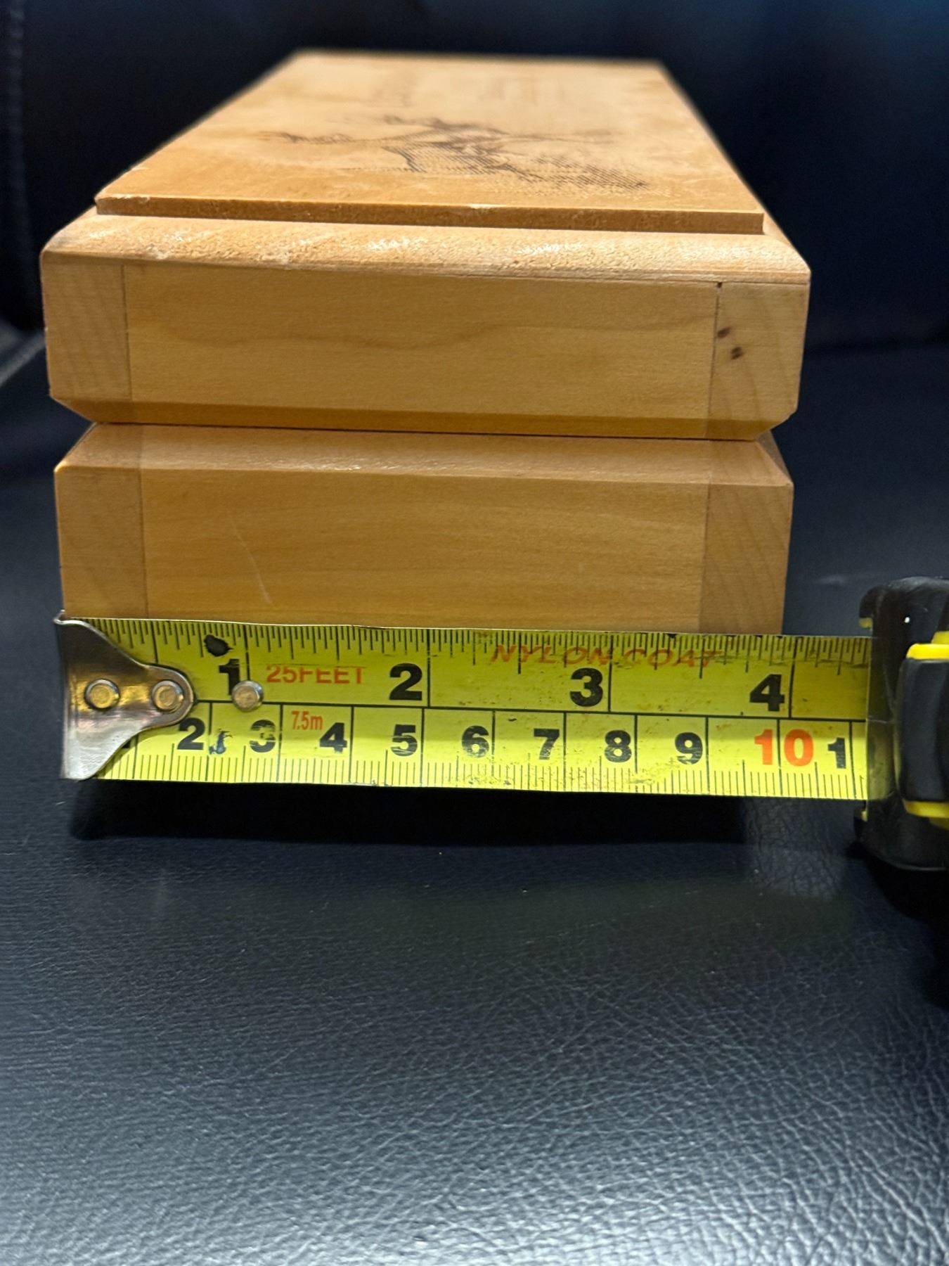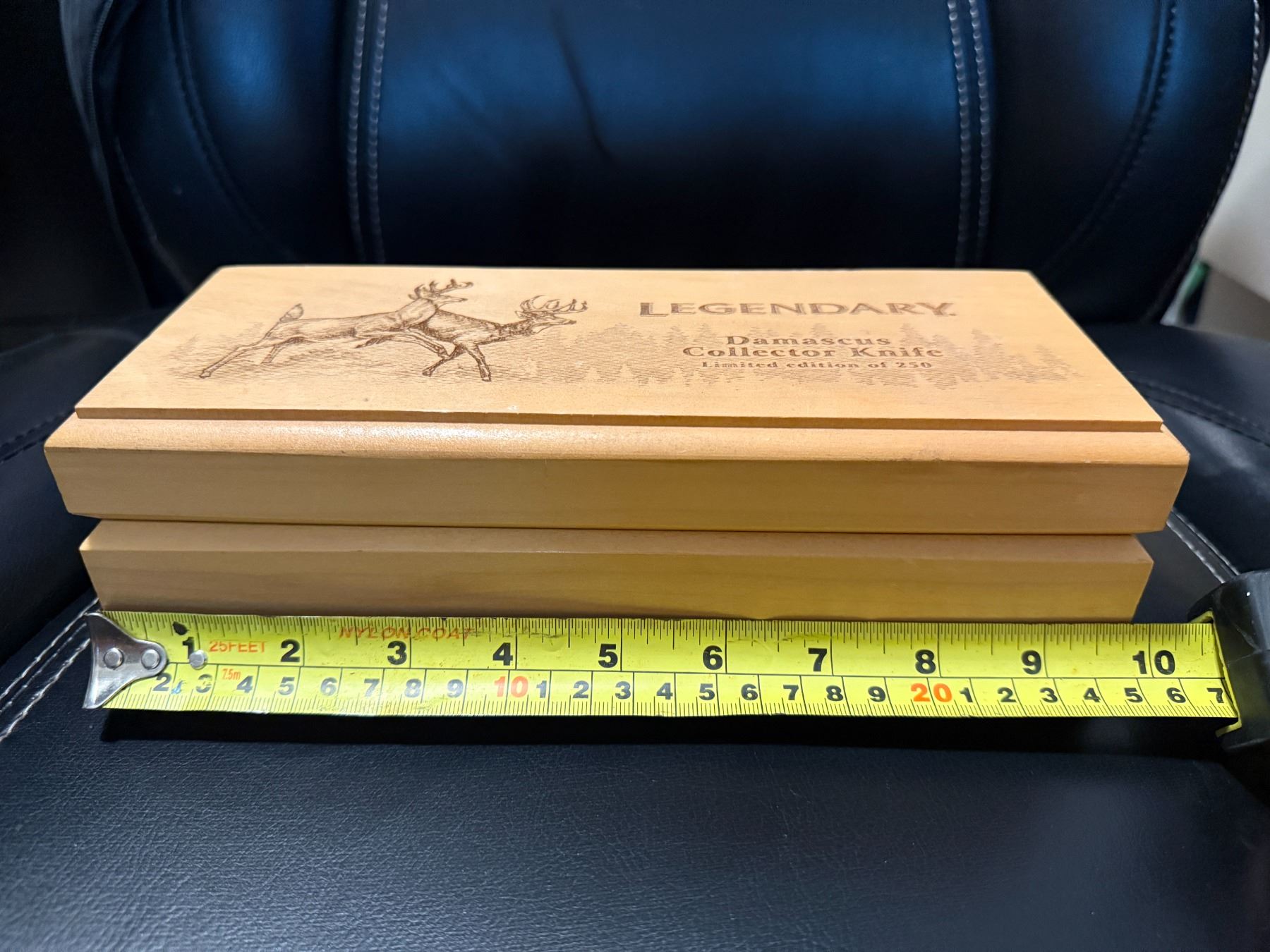The box is in good overall shape, showing light wear from storage and handling but no major damage. Hinges work properly and the lid opens and closes smoothly. Great for collectors, Damascus knife enthusiasts, display, replacement if you already own this limited-edition knife, or anyone needing a quality wooden presentation box.