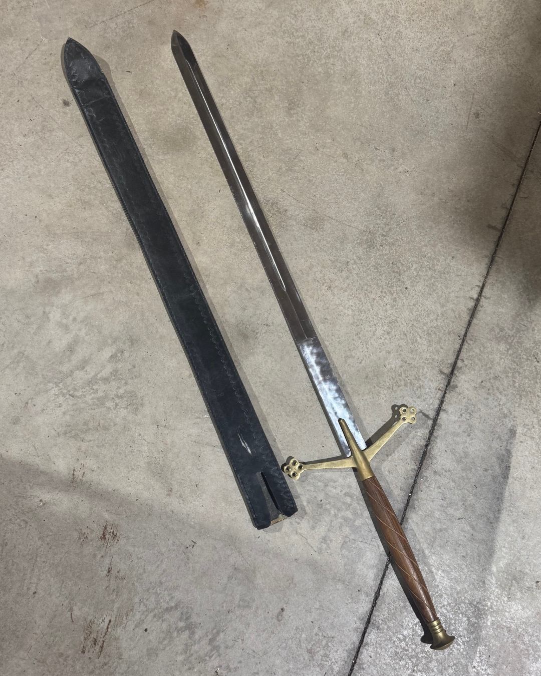 Long sword with wooden handle and scabbard, 51 inches long