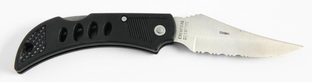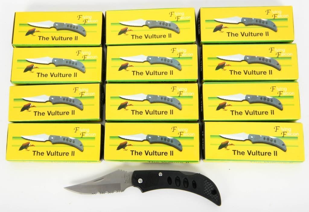 Lot of 12 Brand New Frost Cutlery Vulture II Folding Knifes. (Approx.) 3" Closed Lockback Folding Knife Stainless Steel Blade 1/2 Serrated Blade Black ABS Vented Handle with Lanyard Hole