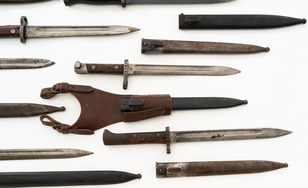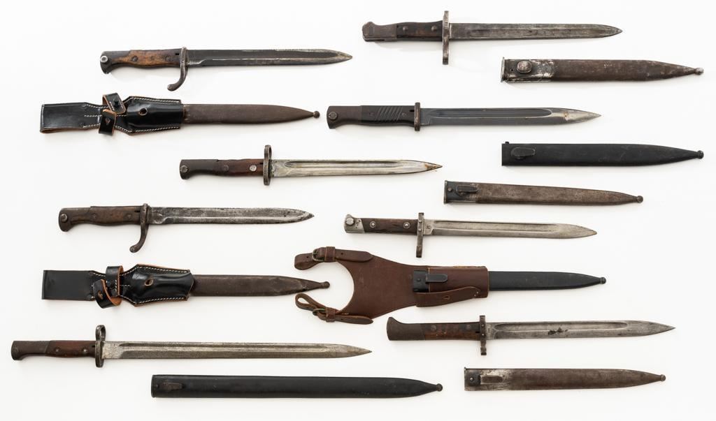 Lot of Eight (8) Bayonets with Scabbards: 1.) German Kar 98k (M1884-98), marked "F1ccf" and "3196"on the blade, "0082"on scabbard. Blade is unsharpened. Condition is good overall. Scabbard with a few moderate dents. 2.) Modified/Shortened German SG 98-05, marked "WAFFENFABRIK/MAUSER A.G./OBERNDORF a.N". Condition is fair showing heavy use to bayonet and scabbard. Comes with a reproduction black leather frog in excellent condition. 3.) Shortened/Modified German SG98-05, marked "WAFFENFABRIK/MAUSER A.G./OBERNDORF a.N". Condition is fair showing heavy use to bayonet and scabbard. Comes with a reproduction black leather frog in excellent condition. 4.) Belgian Export type long bayonet, marked "6307" on end of the pommel, 15.1"blade. Condition is fair with patina and sharpening to blade. Dark patina to pommel. Scabbard with scattered dents and patina. 5.) Turkish Mauser Model 38, marked "3855" on the cross guard. Condition is poor with heavy use and wear to bayonet and scabbard. Pins are missing and throat is loose inside scabbard. 6.) Yugoslavian M1948, marked "NPEAY3EKE 44". Matching numbered scabbard. Condition is fair with darkening to blade and cracks to handle. Scabbard with dents and patina. Blade will not seat fully into scabbard. 7.) Czech VZ.22, marked "E(rampart lion)23" and "ZSQ", with"3015"on the pommel. Condition is about good with patina to the metal and handling marks and darkening to the grips. 8.) Austrian M1895, marked with "(Austro Hungarian eagle)" and "F.G./GY." Condition is fair with wear, sharpening, and nicks to blade. Comes with a Swedish brown leather frog, in good condition. Est.: $250-$400/lot.