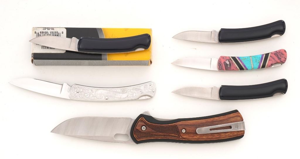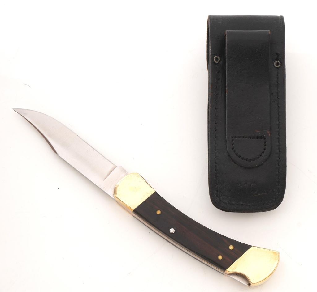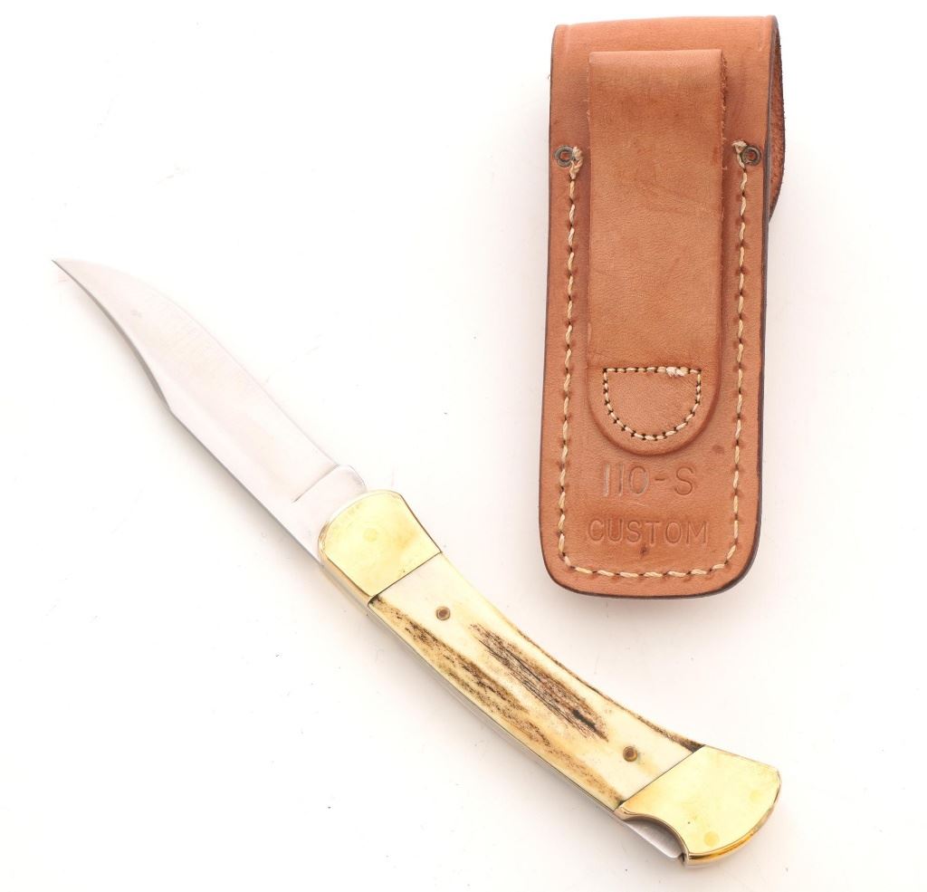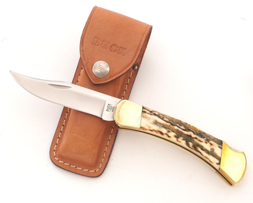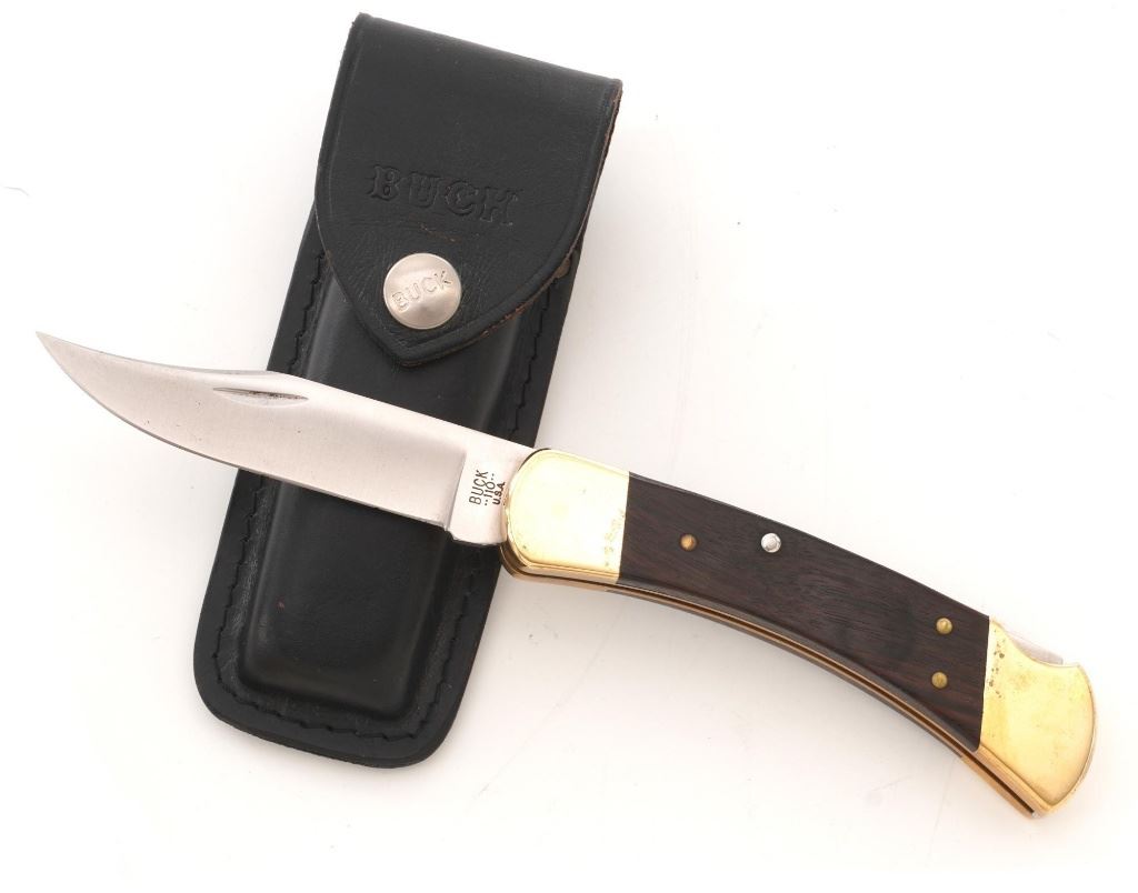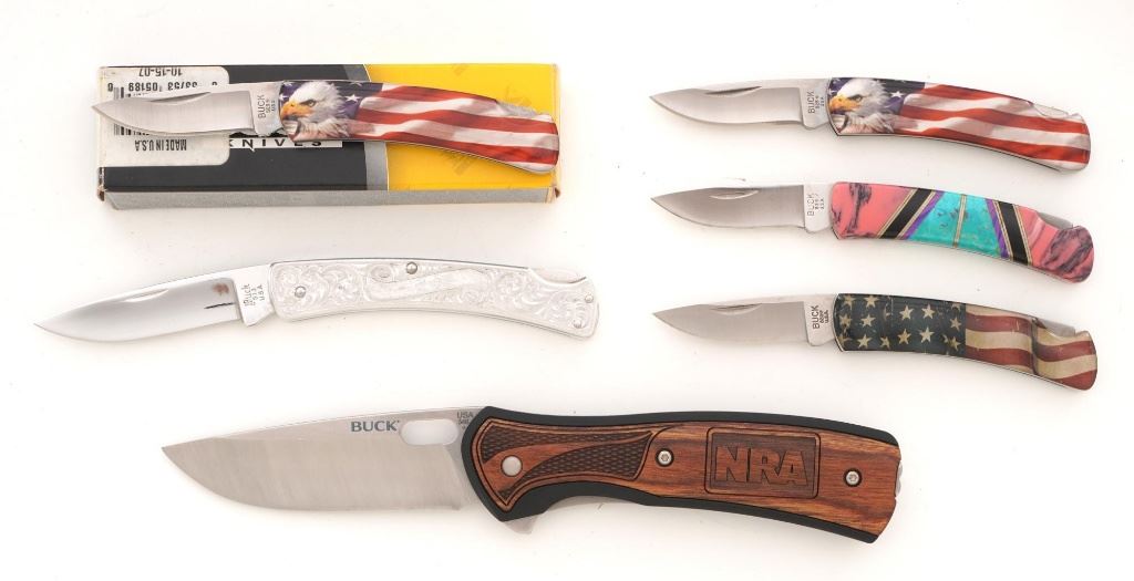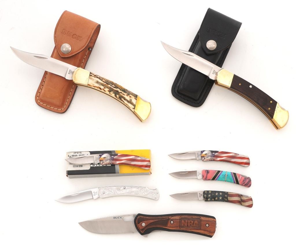 Lot of Eight (8) Buck Folding Knives: 1.) Model 346 Vantage, NRA edition, mfgd 2014. In excellent condition. 2.) Model 513 Classic III with scroll engraved aluminum handles, each side with the initials "R.B." In near excellent condition. 3.) Model 110 Folding Hunter, stag handles, mfgd circa 1972-1986, with original tan leather "Buck Custom" sheath. In near excellent condition, with light marks and toning to the brass bolsters. 4.) Model 110 Folding Hunter, wood handles, mfgd 1972-1986, with black leather Buck sheath. In very good+, lightly used condition. 5-6.) Model 525 Gent, American eagle handles, one with box. Both are in excellent condition. 7.) Model 525, American flag handles. In excellent condition. 8.) Model 525 Gent turquoise handle. In excellent condition. All knives retain the factory edges. Est.: $350-$500/lot.