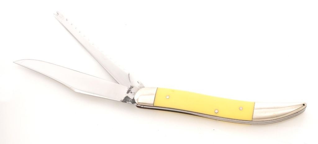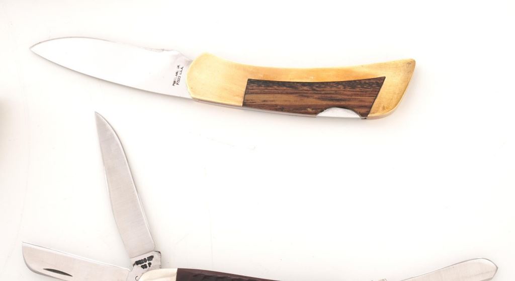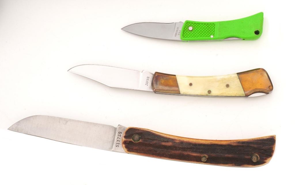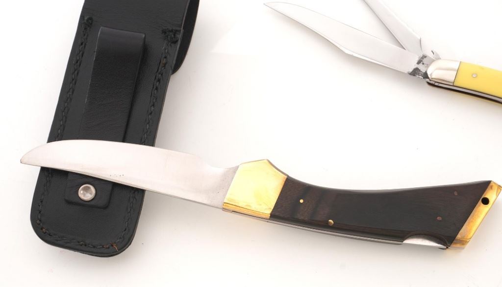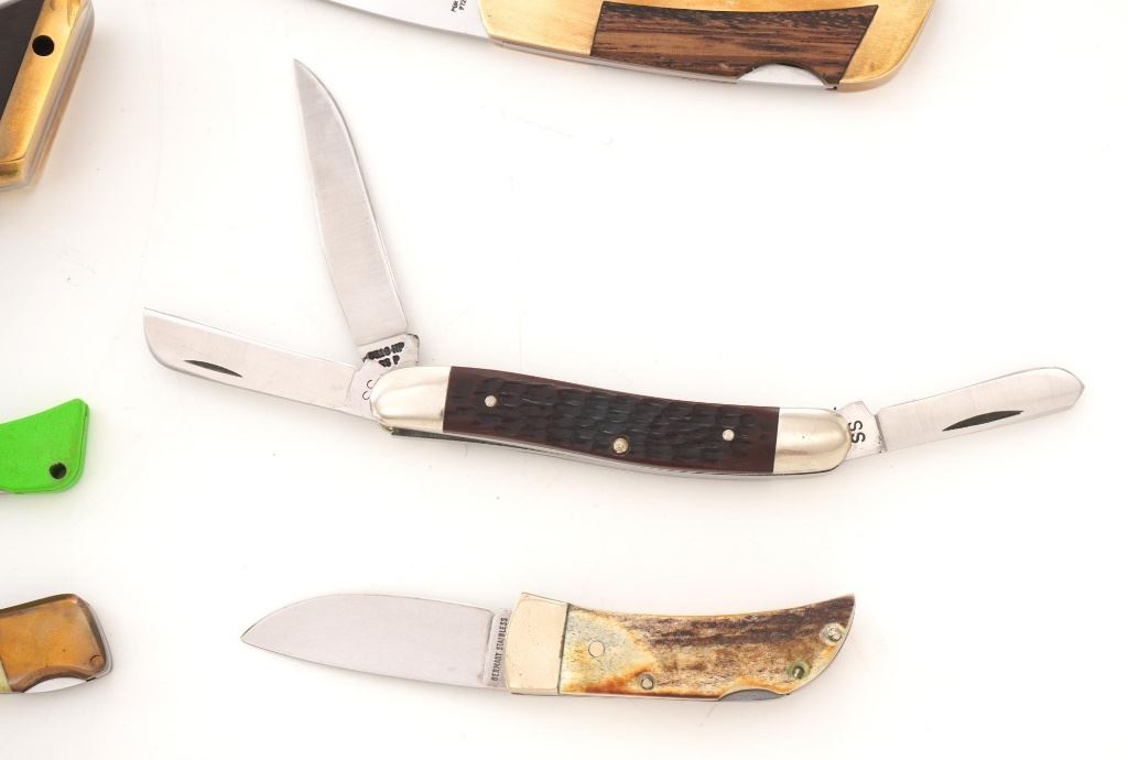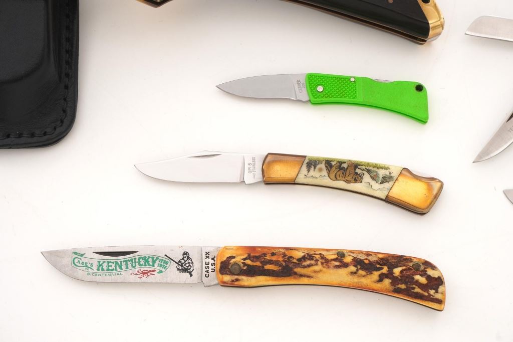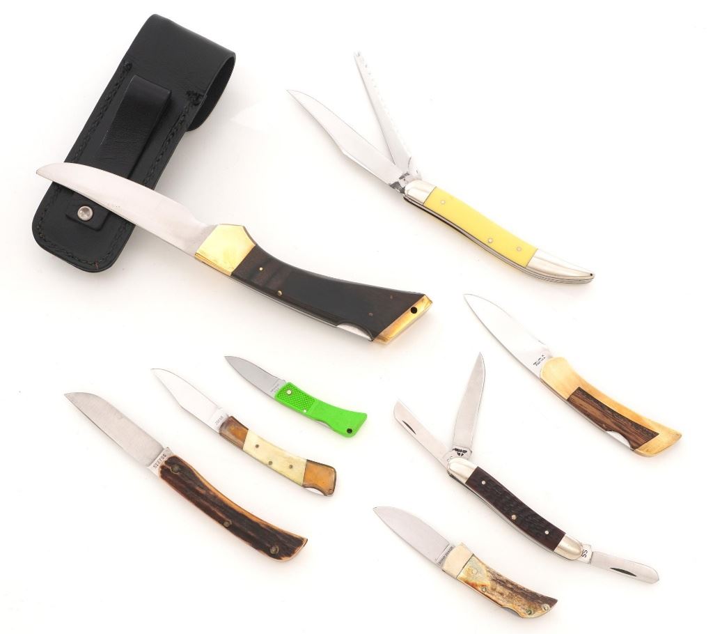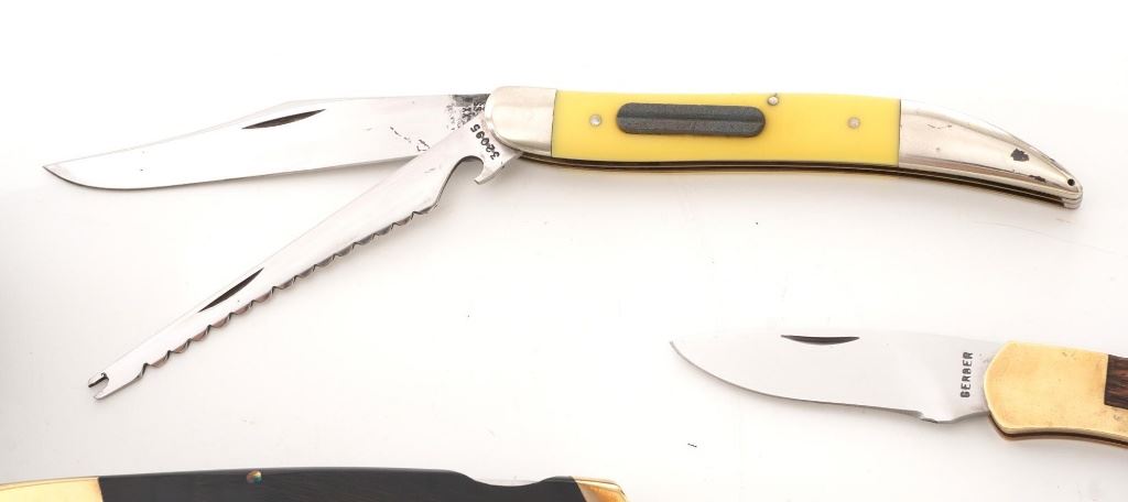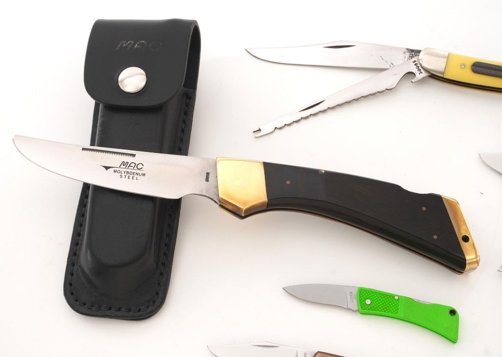 Lot of Eight (8) Folding Knives by Case, Gerber, Boker, etc. 1.) Boker lockback, bolster engraved "RHB". In very condition, with light handling marks. 2.) Made in Japan Model GPI, lockback, with bear scrimshawed on the handle. In very good condition with light scratching on the bolsters. 3.) Gerber Model 200 lockback. In excellent condition. 4.) Case slipjoint fishing knife with yellow Delrin scales. In good condition, with some corrosion on the blade, near the makers mark. 5.) Gerber (Portland) Model FS-1, lockback. In very good condition, showing light scratching and handling marks to the frame. 6.) Case Model 6310 Stockman, slipjoint, mfgd 1940-1964. In very good condition. 7.) Case #5137SS Kentucky Bicentennial, slipjoint. In near excellent condition. 8.) Circa 1980s MAC (Japan), lockback hunter, with black sheath. In very good condition, with scratching to the brass bolsters. All knives retain the factory edges. Est.: $200-$300/lot.