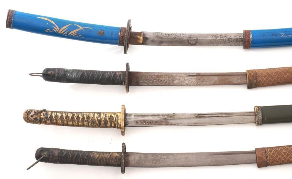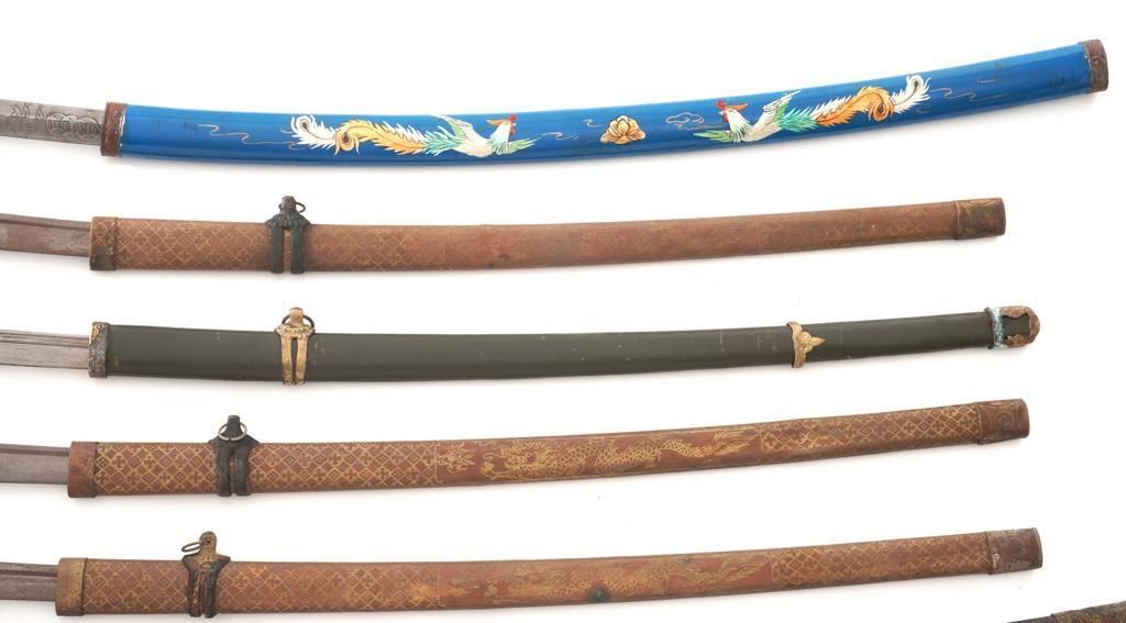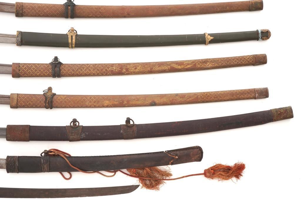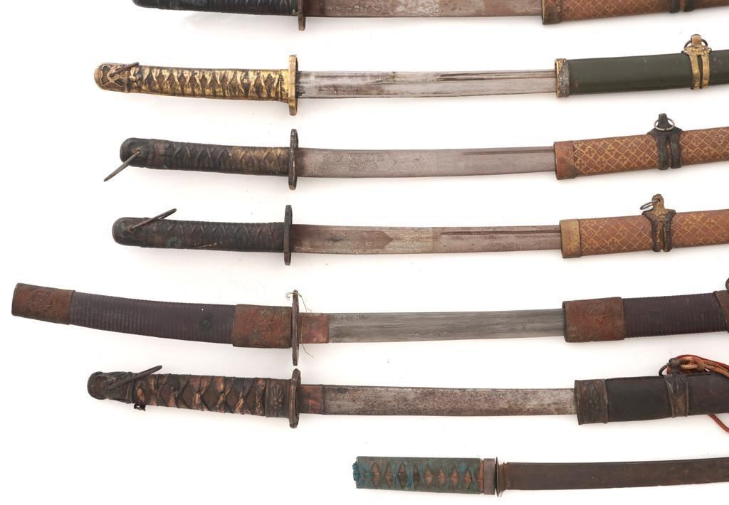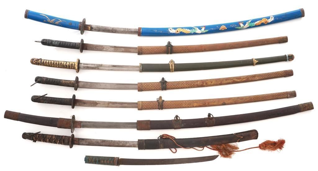 Lot of Eight (8) Reproduction Japanese Style Swords, most likely Chinese manufacture, blade lengths range from 17" to 29.50", and have a light to moderate amount of surface rust, and intermittent small nicks. Scabbards are made from either lacquered wood, leather, or metal. Scabbard conditions vary, some having small cracks, missing pieces, or loose hardware. The smallest sword does not have a sheath. Est.: $200-$300/lot.