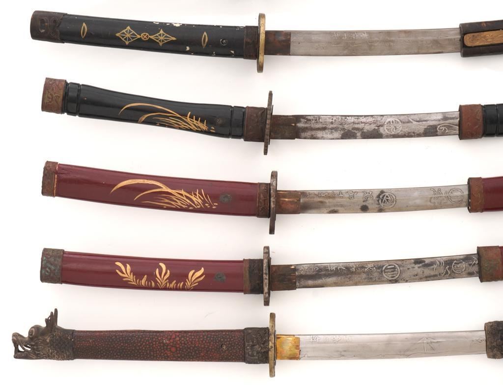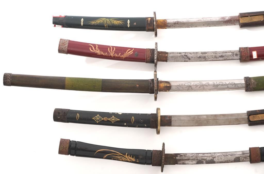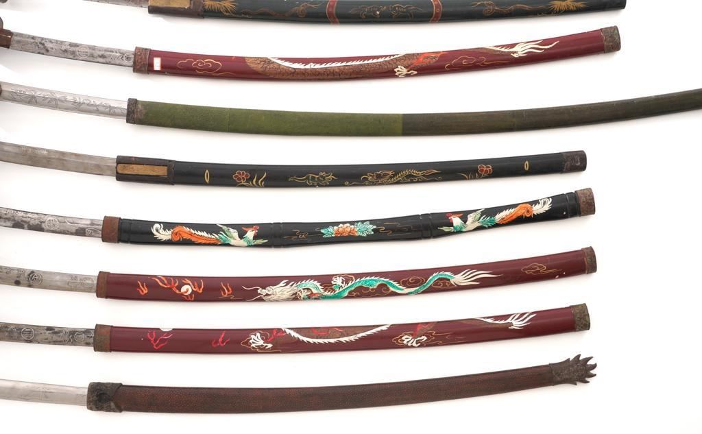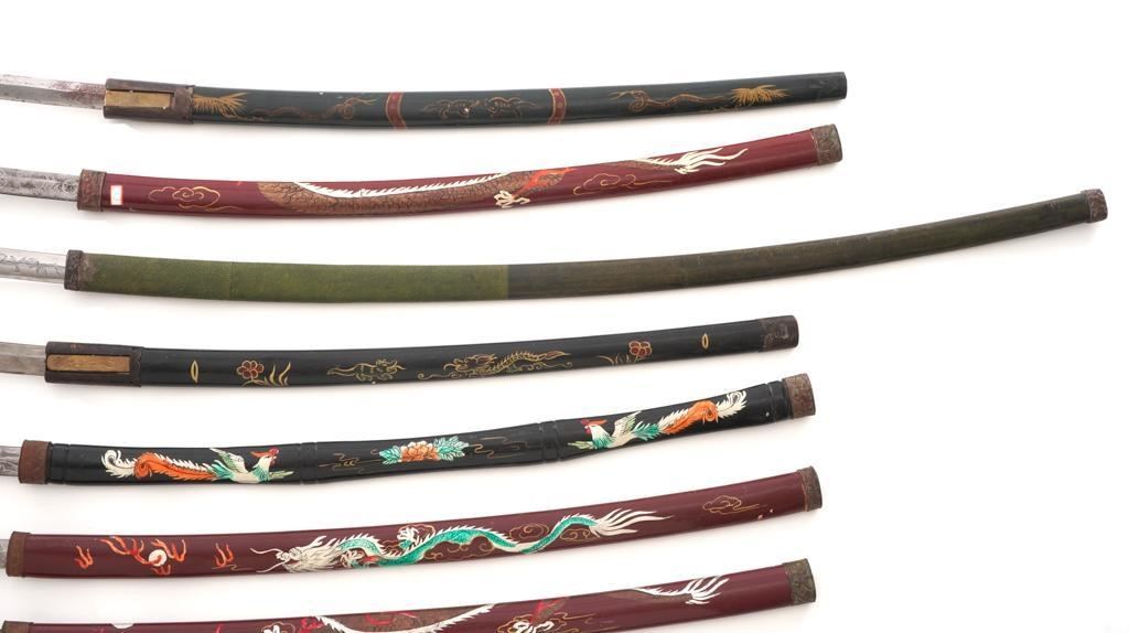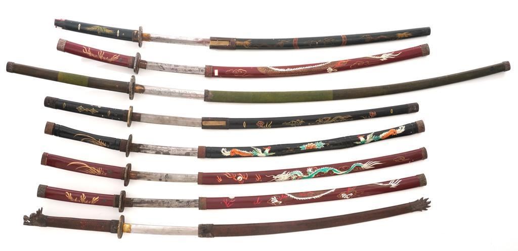 Lot of Eight (8) Reproduction Japanese Style Swords, most likely Chinese manufacture, blade lengths range from 29" to 41". All blades show varying degrees of surface rust that ranges from light to moderate, as well as a few small nicks. Tip on the longest blade is bent. Scabbards show no visible cracks, but lacquer finishes do have chips and loose hardware. One of the handles and sheaths are missing pieces. Est.: $200-$400/lot.