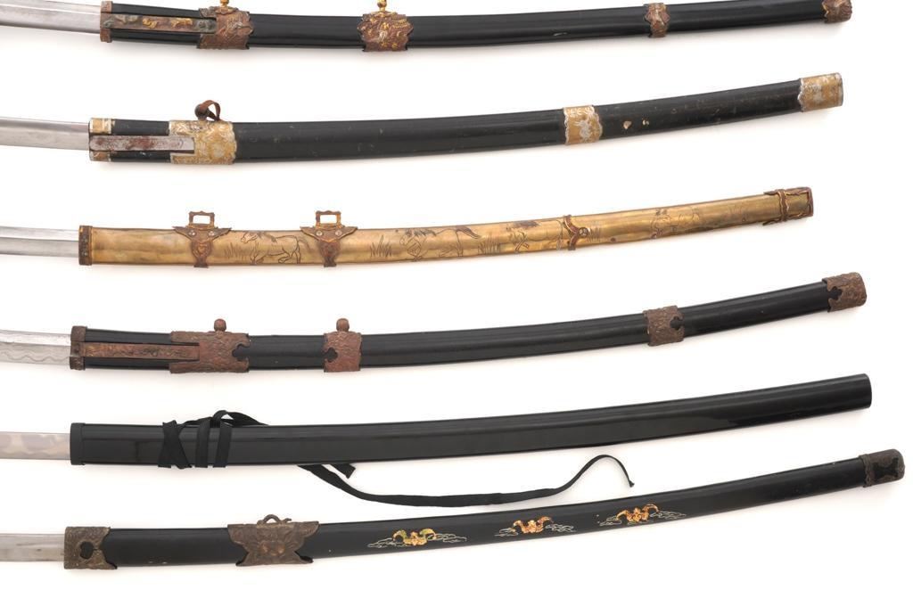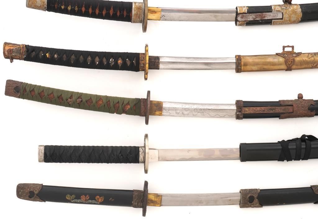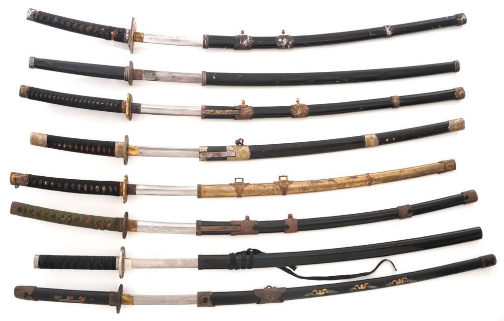 Lot of Eight (8) Reproduction Japanese Style Swords, most likely Chinese manufacture, except for one which is marked "Taiwan", blade lengths range from 27.5" to 30.50". Conditions range from good to very good. Blades conditions range from having light handling marks and finger prints, small nicks, and some with light surface rust. Scabbards are lacquer and one is brass, show no visible cracks, but finishes do have chips and loose hardware. Est.: $200-$400/lot.