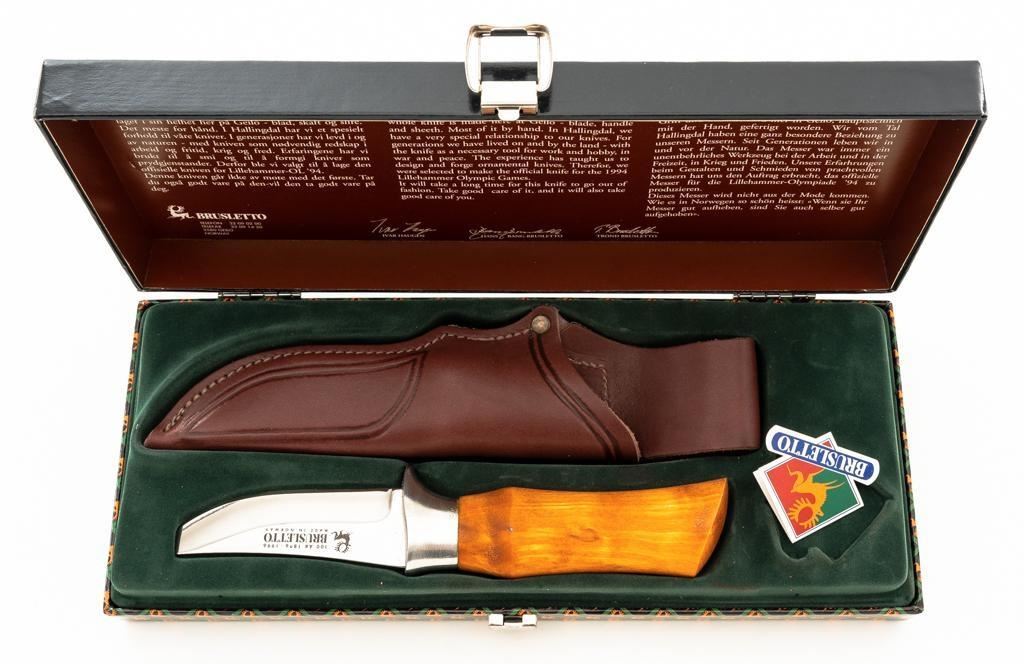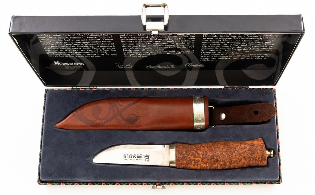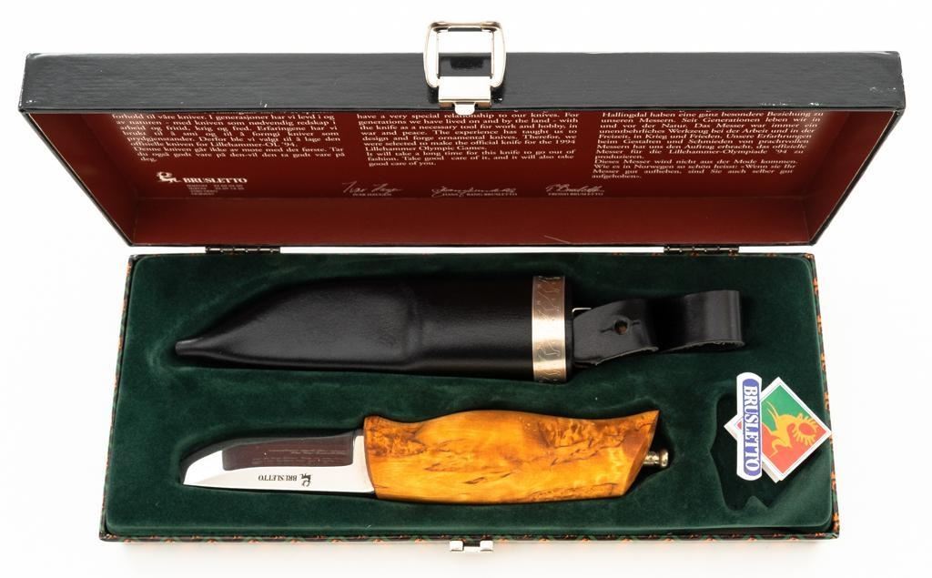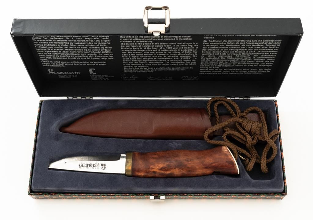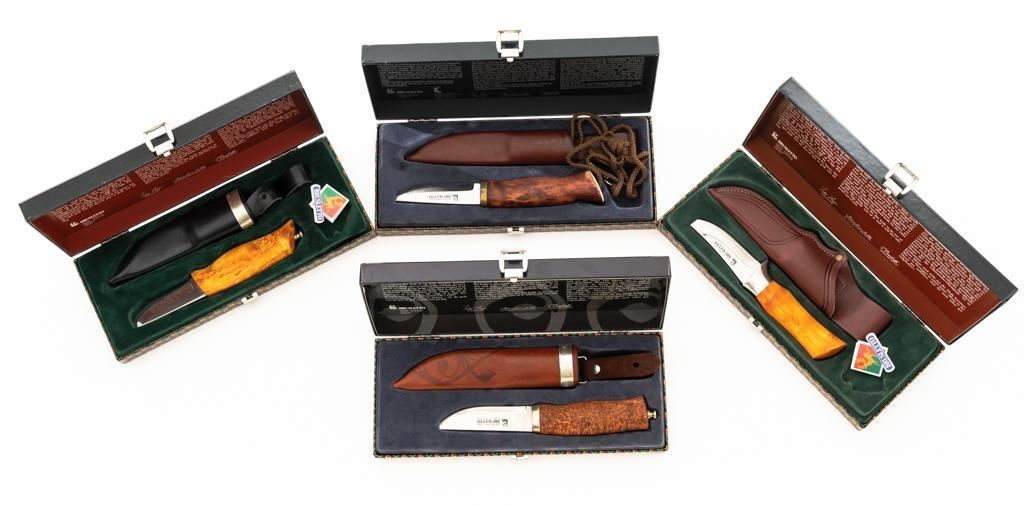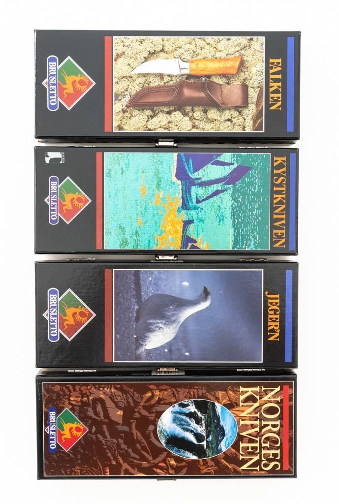 Lot of Four (4) Brusletto Fixed Blade Knives, made in Norway. Models include Jegern, Norges Kniven, Falken, and Kystkniven. All are in their individual factory clam shell boxes and includes the factory leather sheaths. Stainless steel blades and birch handles. Blade lengths range from 3"-3.75". All are in near excellent overall condition and have minor cosmetic issues resulting from storage, such as light tarnish on metal parts and verdigris between the leather and metal surfaces. Est.: $300-$500/lot.