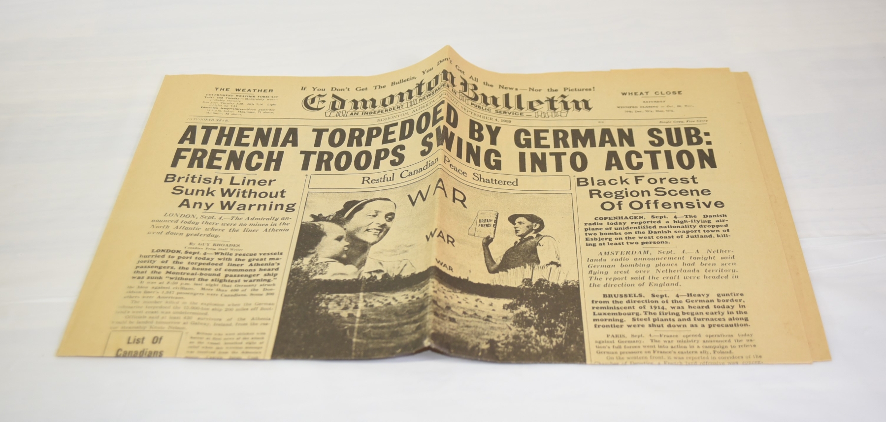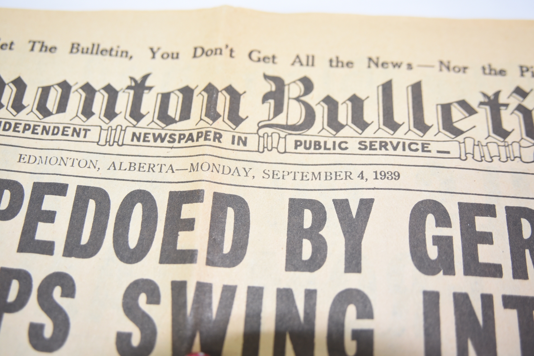 1939 Edmonton, Alberta newspaper kept in sleeve- in pristine condition