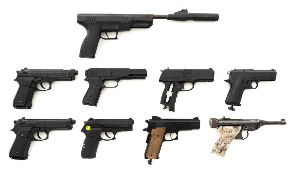 Lot of Nine (9) Air Pistols. 1.) Hy Score Target Model,.177 cal., 10.25" barrel, blued finish. Pistol is in good overall condition. Bluing has thinned and faded. There is light surface rust in areas. 2.) Benjamin Model BBP77,.177 cal., 11.25" barrel, blued finish. Pistol is in good overall condition. There is light to moderate surface rust throughout. 3&4.) Daisy Model 340, .177 cal., 3.5" barrel, black plastic slide, and frame. Both are in very good condition, with only minor marks from handling and use. 5.) Daisy Model 15XT,.177 cal., 4.5" barrel, black plastic slide, and frame. Pistol is in very good condition with only minor marks from handling and use. 6-9.) Gamo PT80, Marskman Repeater, Crossman 1088, and Daisy 92. These are all missing parts and are for parts only. None of the guns in this lot have been test fired. Est.: $200-$300/lot.
