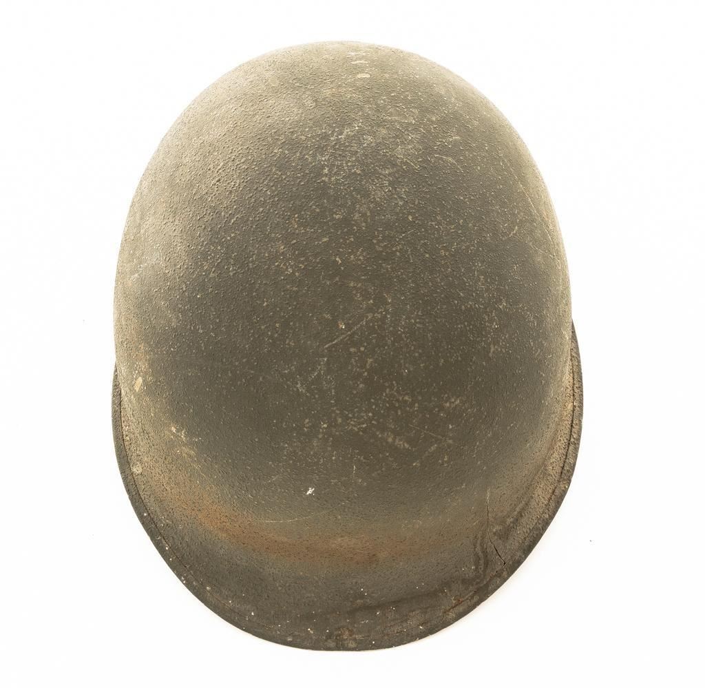 Lot of Seven (7) U. S. M1 Helmets: 1.) WWII steel helmet with cloth cover, sewn chin straps, and WWII liner with all straps. In very good condition, the leather chin strap is crazed and head band shows use. Subdued U.S. Navy badge is attached. 2.) Steel helmet, no liner, joined at the front, with a 2" crack at right of center, and very good paint. 3.) Steel helmet, no liner, joined at the front, with a 3" crack at right of center, paint is very good. 4.) Steel helmet, joined at the front, with circa 1960s chin strap, and circa 1950s liner with torn webbing at the back. Steel shows heavy use and rust. 5.) Steel helmet, circa 1960s, with torn cloth cover, liner is very good but missing the head band and nape strap. 6.) Steel helmet, missing chin straps, and circa 1950s liner with worn headband. Painted black and has scattered moderate surface rust. 7.) Steel helmet circa 1960s-1970s, with torn cloth cover, liner is missing the head band and nape strap. In good condition. Est.: $350-$550/lot.
