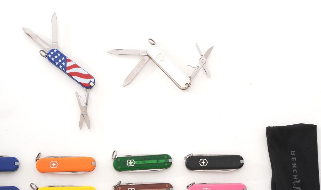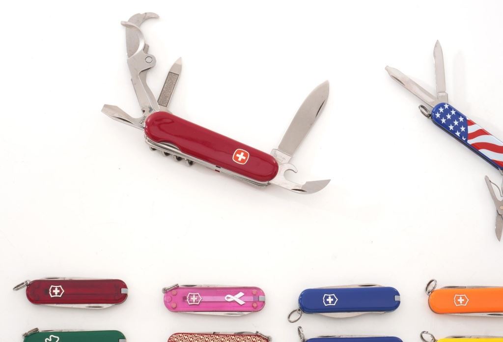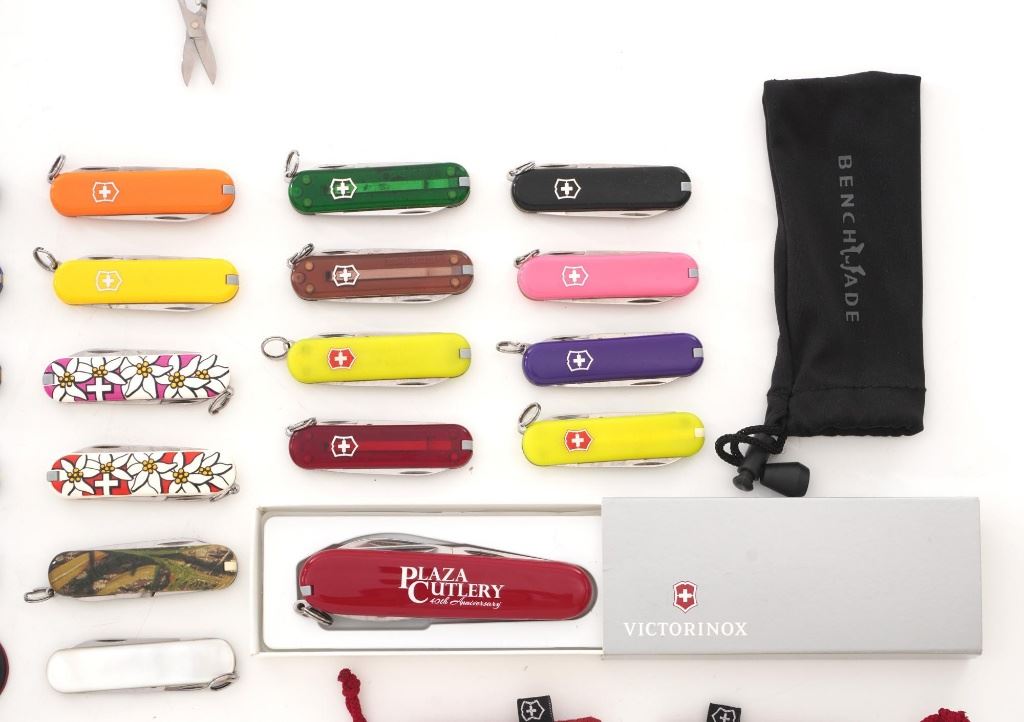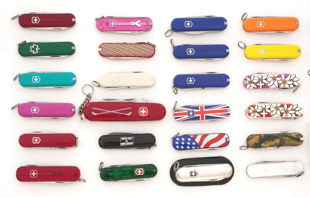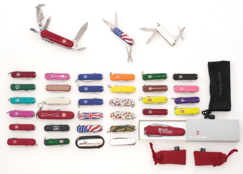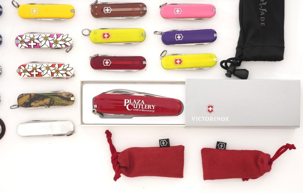 Lot of Thirty-Six (36) Swiss Army Knives, almost all are manufactured by Victorinox and are the Classic SD model with small knife blade, nail file, scissors, toothpick, and tweezers. Three (3) with lights. Featuring a wide variety of handle colors, a few with custom company branding/logos. Includes a medium sized 40th Anniversary Plaza Cutlery branded knife, new in the box. Two (2) medium sized Wenger Delemont multi-function knives. Ranging from lightly used and very good, to new condition. Est.: $200-$400/lot.
