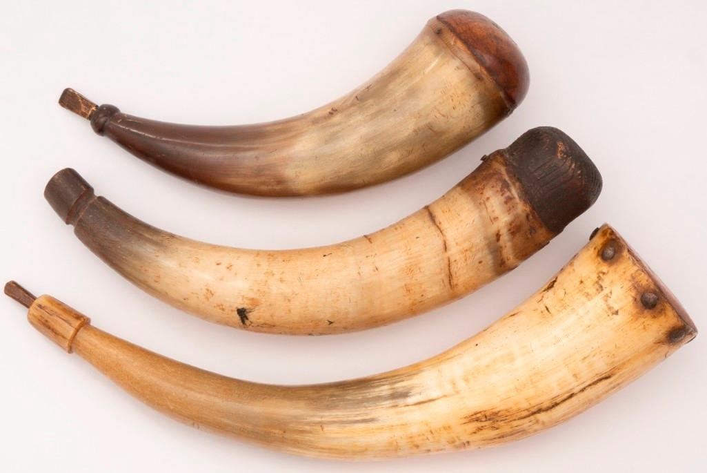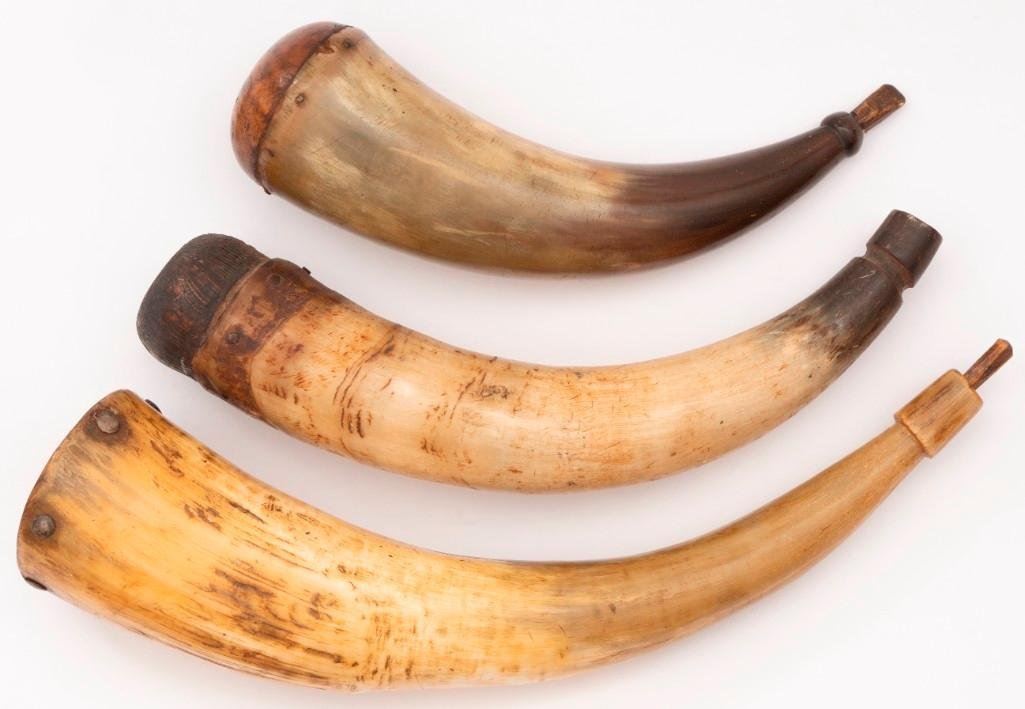 Lot includes three powder horns, the largest measuring 12.75" on the longest side. Wooden plugs secured with iron pins, some examples of carving and decoration. **Good condition overall. Some scratching and wear from age.** $50-$150