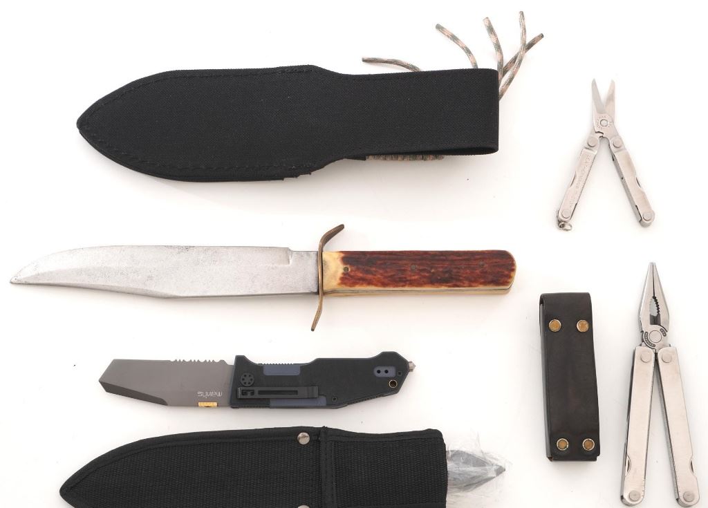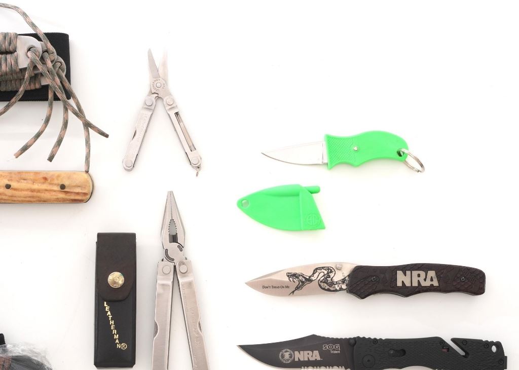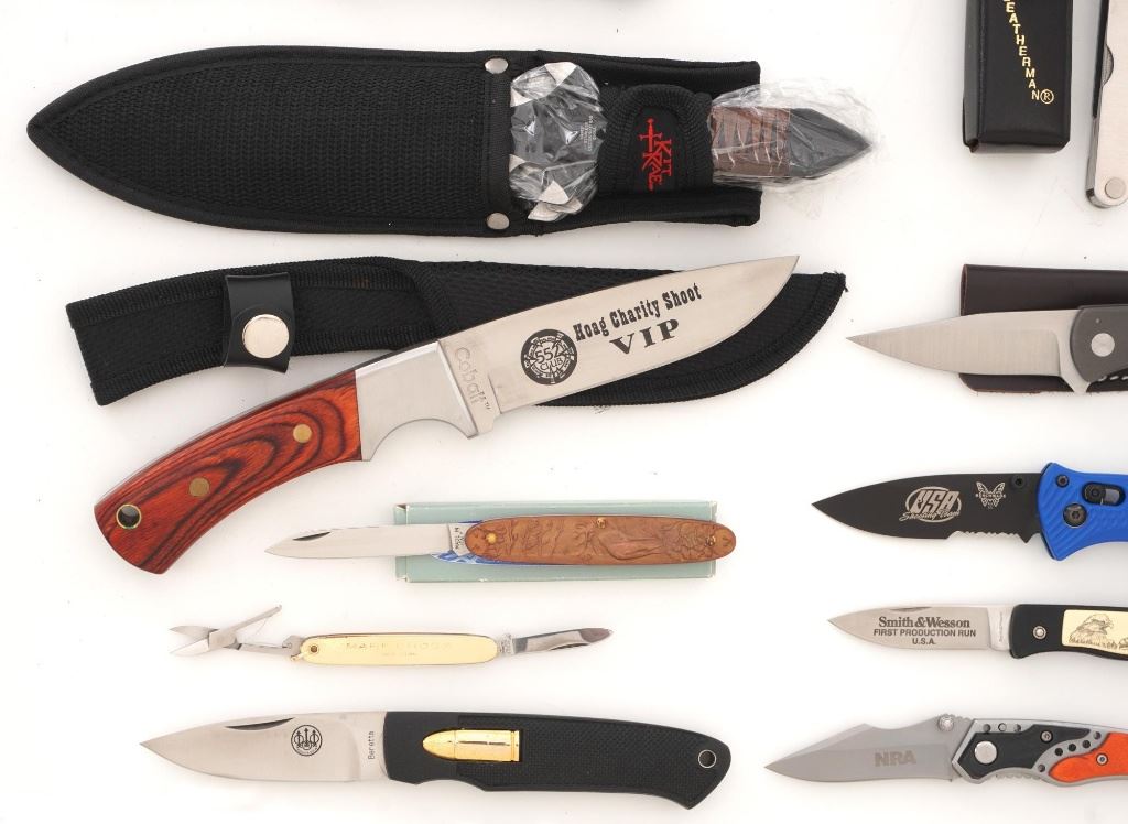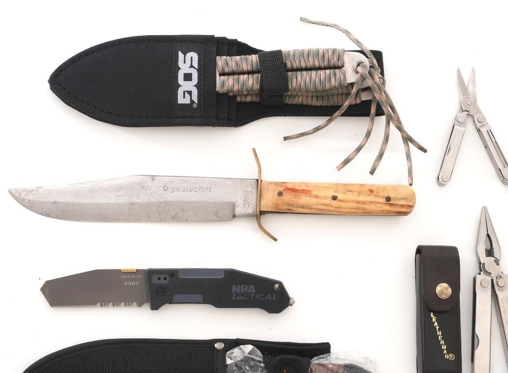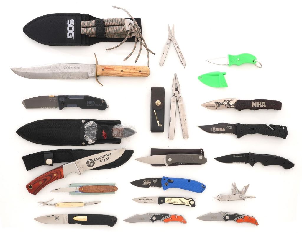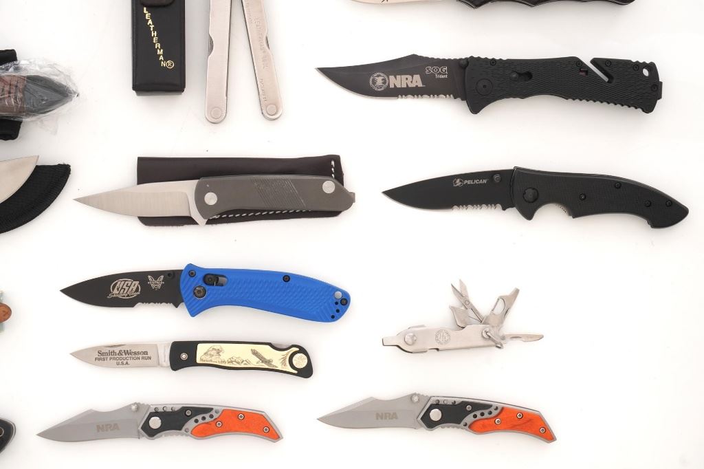 Lot of Twenty (20) Folding and Fixed Blade Knives by SOG, Leatherman, Beretta, Benchmade, Smith & Wesson, etc. Includes a Benchmade Mel Pardue design with USA Shooting Team logo on the blade. SOG Trident, 1st Production Run Smith & Wesson with faux scrimshawed ivory handle, set of SOG throwing knives, Kit Rae throwing knives, Leatherman tool with original carry case, Leatherman Micra, Bear Ops NRA "Vigilance" folding knife, and many others, some are unbranded. Almost all are in excellent, unused condition. The most noticeable exception is the "Original Bowie Knife", which has considerable cleaned pitting on the blade. Est.: $350-$550/lot.