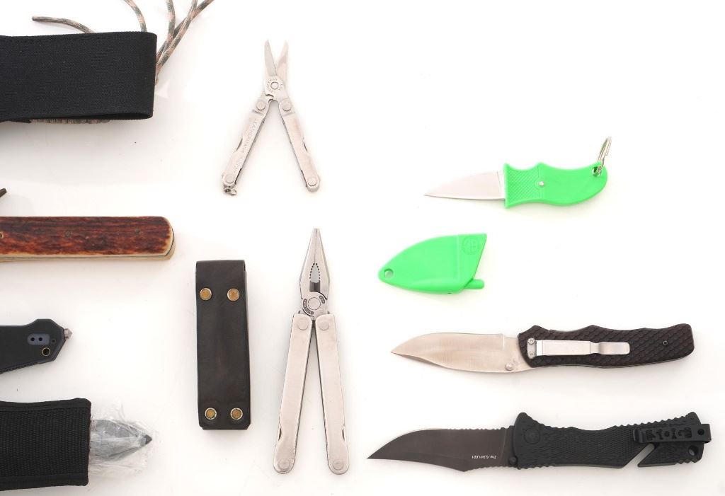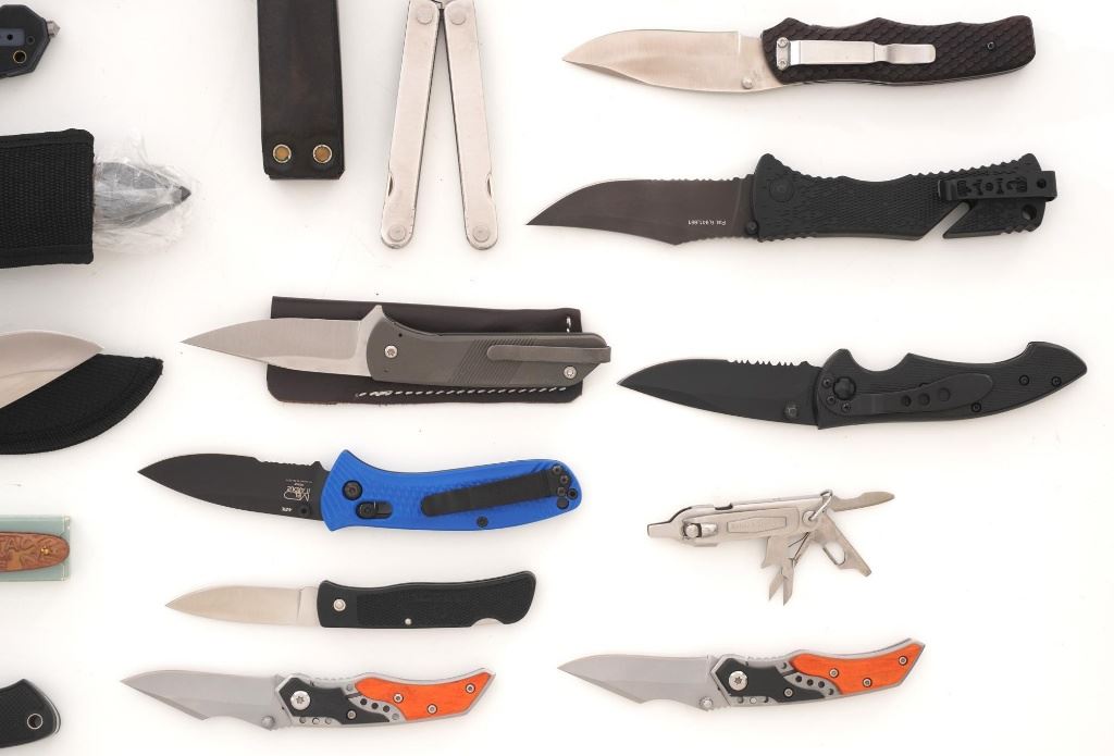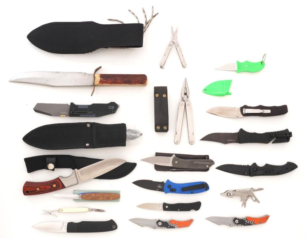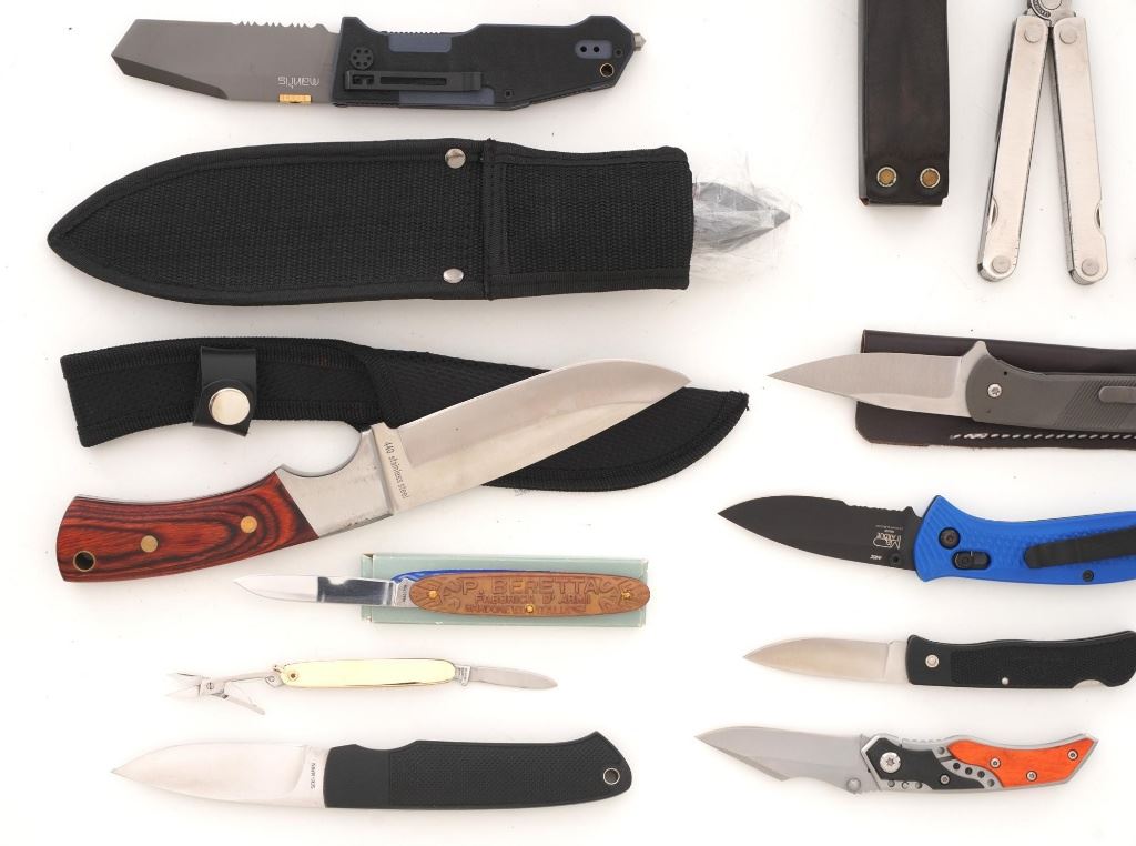 Lot of Twenty (20) Folding and Fixed Blade Knives by SOG, Leatherman, Beretta, Benchmade, S&W, etc