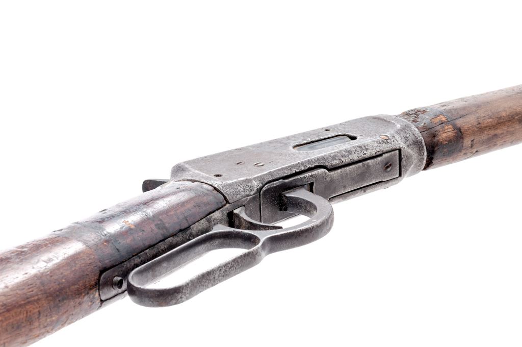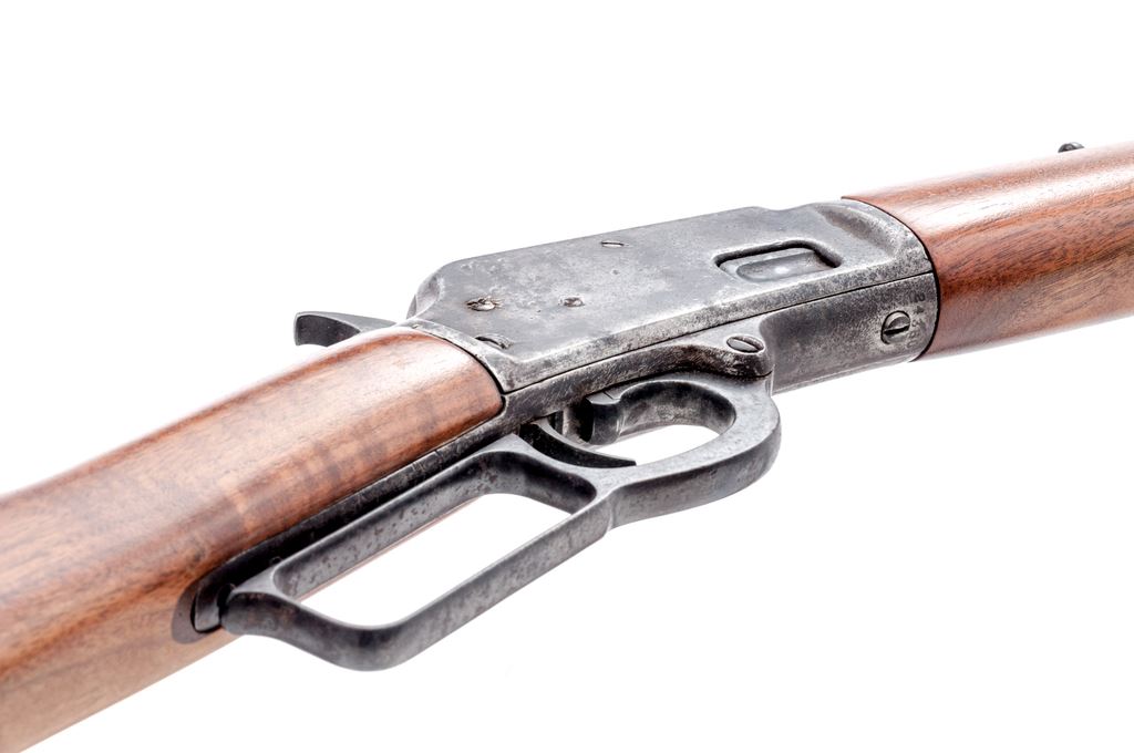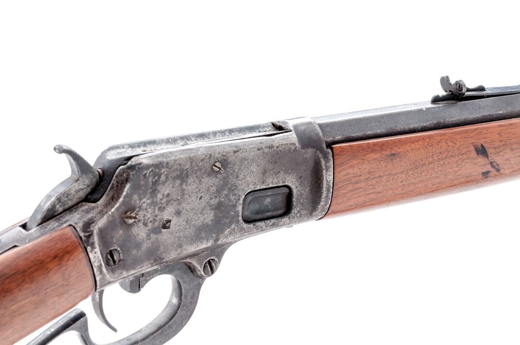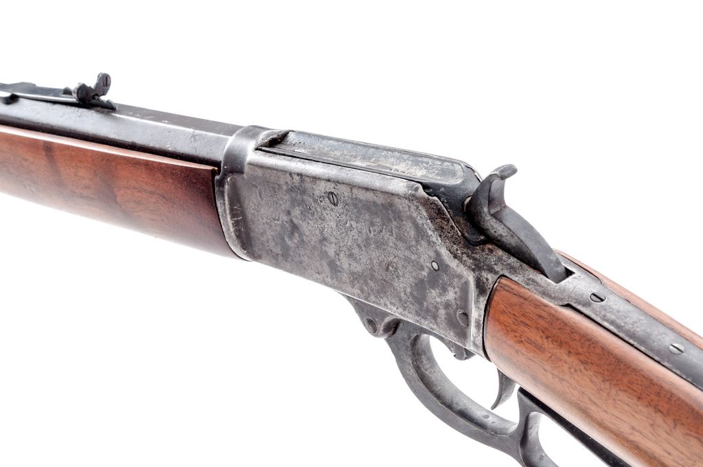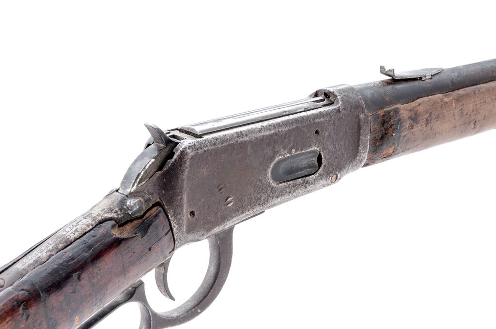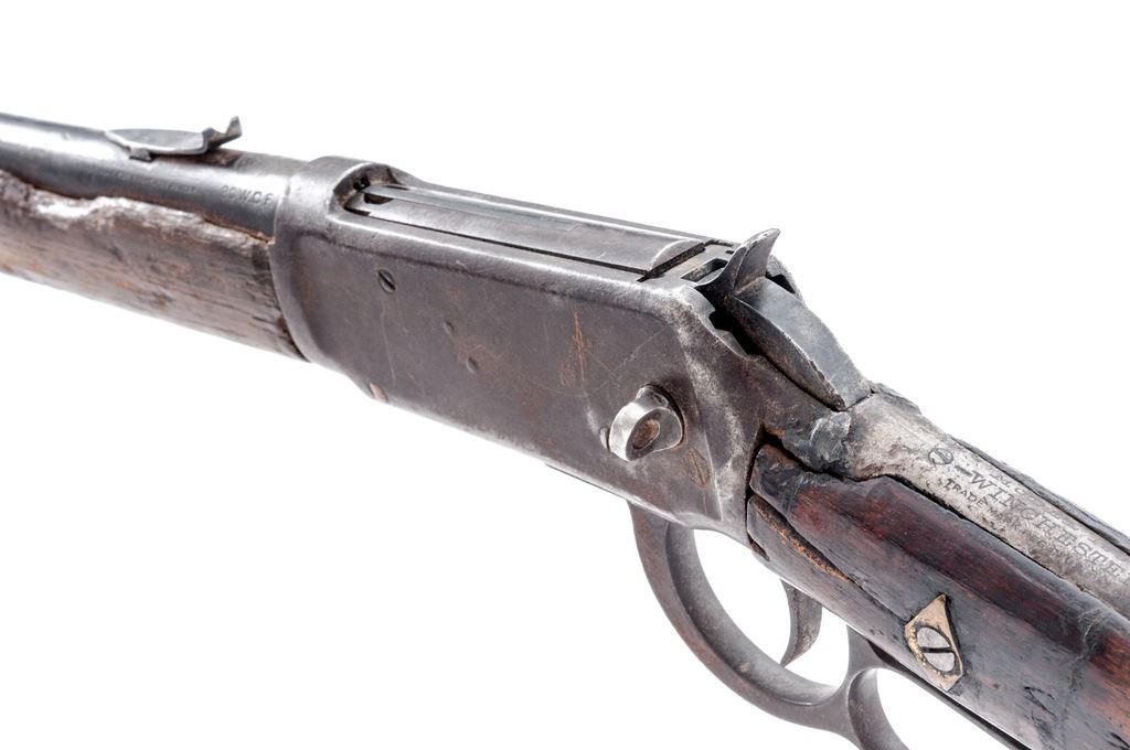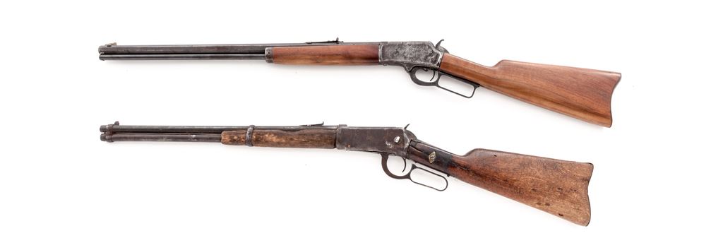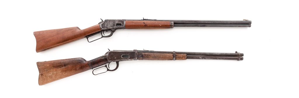Lot of Two (2) American Lever Action Longarms: (1) Winchester Model 1894 Saddle-Ring Carbine, #533803, .30 WCF (.30-30) cal., 20'' round barrel marked with maker's name, address, patent dates, nickel steel/smokeless powder info, and ''30 W.C.F.'' at left; receiver has right loading gate, left saddle-ring stud (ring missing), marked ''Model 1894/Winchester'' on top tang, ser. no. bottom front; two-piece oil-stained walnut stocks, forend with single barrel band, matching buttstock with carbine buttplate. Mfg'd ca. 1910. Condition is good, metal retains no original finish but an overall dark brown, pitted surface, mostly clear markings. Wood shows hard use with scattered cracks and losses, top tang was broken and welded, stock wrist with wood screw reinforcement. Action functions; bore is surprising good showing light frosting and sharp rifling. (C&R) (2) Marlin Model 1889 Rifle, #24360, .32 WCF cal., 24'' octagonal barrel with buckhorn sights, marked with maker's name, address, 1887 patent date and ''32W'' on top flat; receiver has right loading gate, ser. no. bottom front; two-piece oil-finished walnut stocks, the forend with steel nosecap, the buttstock with curved steel buttplate. Mfg'd ca. 1889. Condition is good to very good, the barrel and tube are a smooth blue-brown with traces of original blue, balance of the metal is gunmetal gray with scattered light-to-medium pitting. Stocks are replacements with two gouges at right side forearm and most of a smooth finish. Action functions; bore shows overall moderate etching and good rifling. (Antique) Est.: $500-$900/lot. (C&R/Antique)