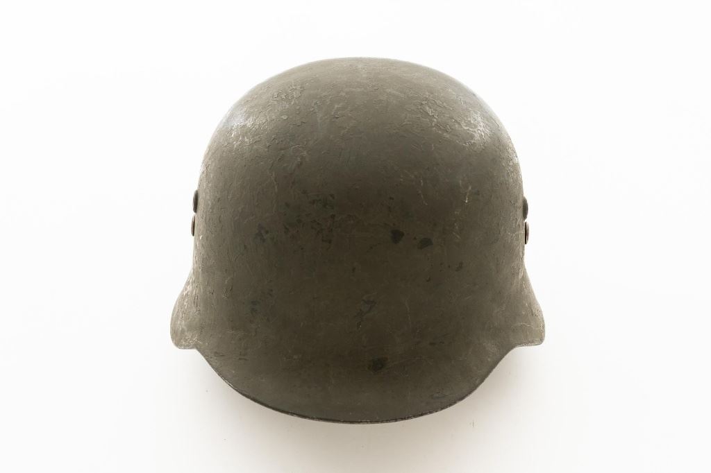 Lot of Two (2) Spanish and Hungarian Military Helmets: 1.) Spanish M1942 steel helmet with tan leather liner and chin strap, and bracket riveted to front for attachment of parade insignia. Shell is painted a light green color and there is a illegible penned name written on the liner. Condition is very good, showing light scratches and wear to the shell. There is light wear and darkening to the liner, with paint over spray to the chin strap. 2.)Hungarian M38 steel helmet with chin strap and tan leather liner. A square bracket is riveted to the rear of the shell. Painted a light green color with the manufacturer and size markings painted over and no longer visible. Liner is made from three pads with two lower tongues attached to a steel band. Condition is very good with wear and handling marks to the shell and wear, scuffs, and darkening to the liner. Black leather chin strap is dry and stiff. Est.: $150-$250/lot.