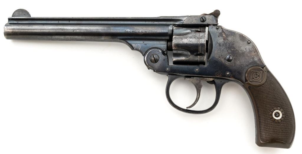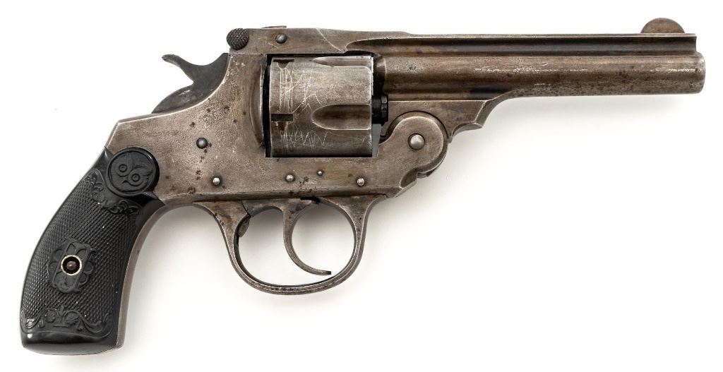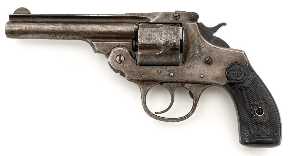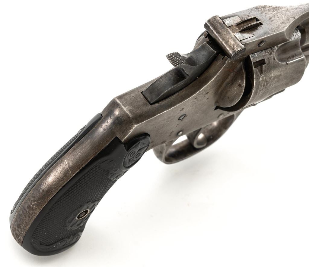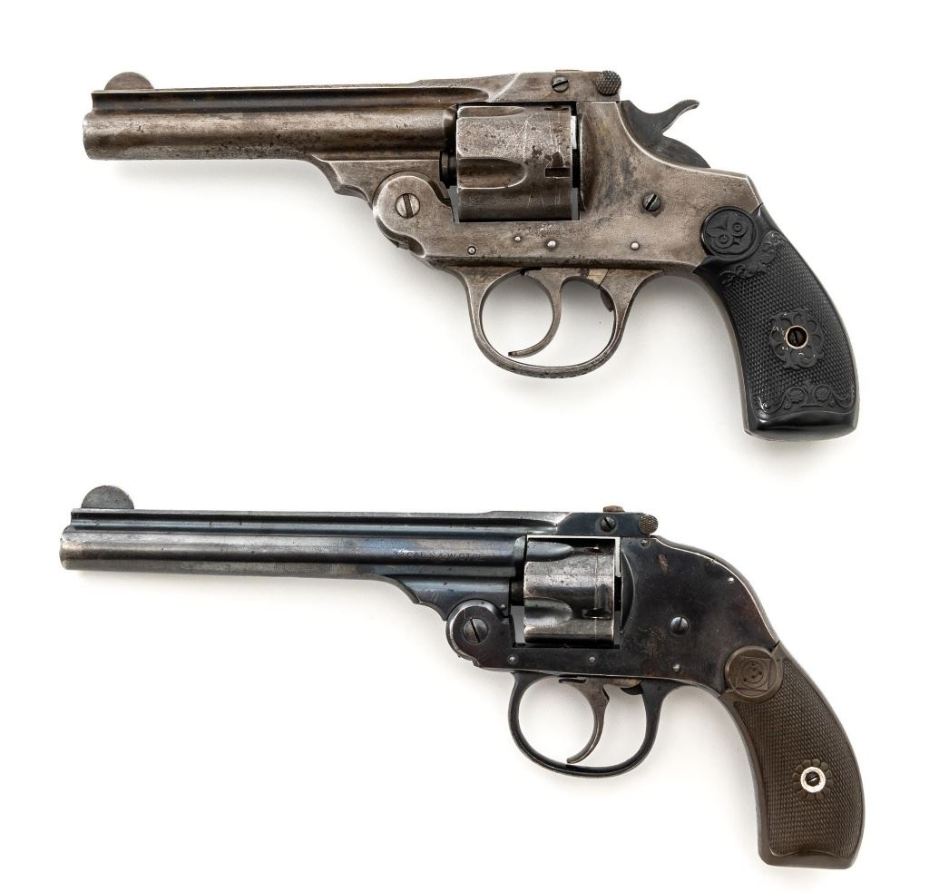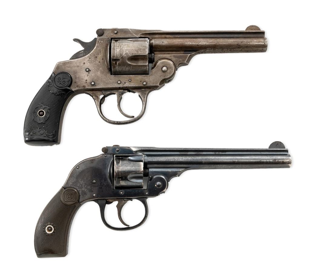 Lot of Two (2) Top-Break Double Action Revolvers by Iver Johnson & H&R: 1.) Iver Johnson 3rd Model Safety Automatic Revolver, #25186, .38 S&W cal., 4" barrel, nickel finish, checkered hard rubber two-piece grips, blade front sight and fixed "U"-notch rear sight. Revolver is in good overall condition, showing considerable thinning finish drifting to gray patina, with scattered spots of erosion and lighter pin prick pitting on the frame. Grips with fine checkering detail. Action functions and locks up securely. Bore is fair with moderate erosion and scattered lighter spots of pitting, showing defined rifling. 2.) Harrington & Richardson Hammerless Top-Break Double Action Revolver, #92503, .32 S&W cal., 5" ribbed barrel, blue finish, checkered hard rubber two-piece grips, blade front sight, fixed "U"-notch rear sight, and color case hardened trigger. Revolver is in near fine overall condition, retaining approx. 90%-92% thinning factory finish, with wear at the muzzle, erosion, and thinning finish. Front and backstrap have spots of light surface rust and edgewear. Grips are fine with good checkering detail and small handling marks. Action functions well. Bore is fair, with spots of light erosion, displaying defined rifling. Est.: $200-$400/lot. (C&R)