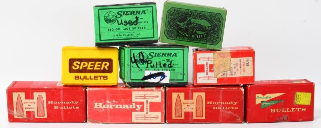 Box Hornady Bullet appears full (taped) .30 cal .308 round nose Box Hornady Bullet 30 cal .308 Spire Point appears full (taped) Box Horn Hornady 30 cal .308 Round nose 1/4 full Box Speer Bullets 30 cal 110 gr .308 hp varminter 1/2 full Box Sierra Bullets 30 cal .308 DIA 150 gr spitzer boat tail 20 qty Box Sierra 30 cal someone wrote 42 pulled 125 grain .308 spitzer was 100 full box Sierra 30 cal 180 grain .308 spitzer someone wrote USED on box 1/2 full box vintage Remington bullets 30 cal 125 grain .308 diam full box Hornady 30 cal 110 grain .308 spire point