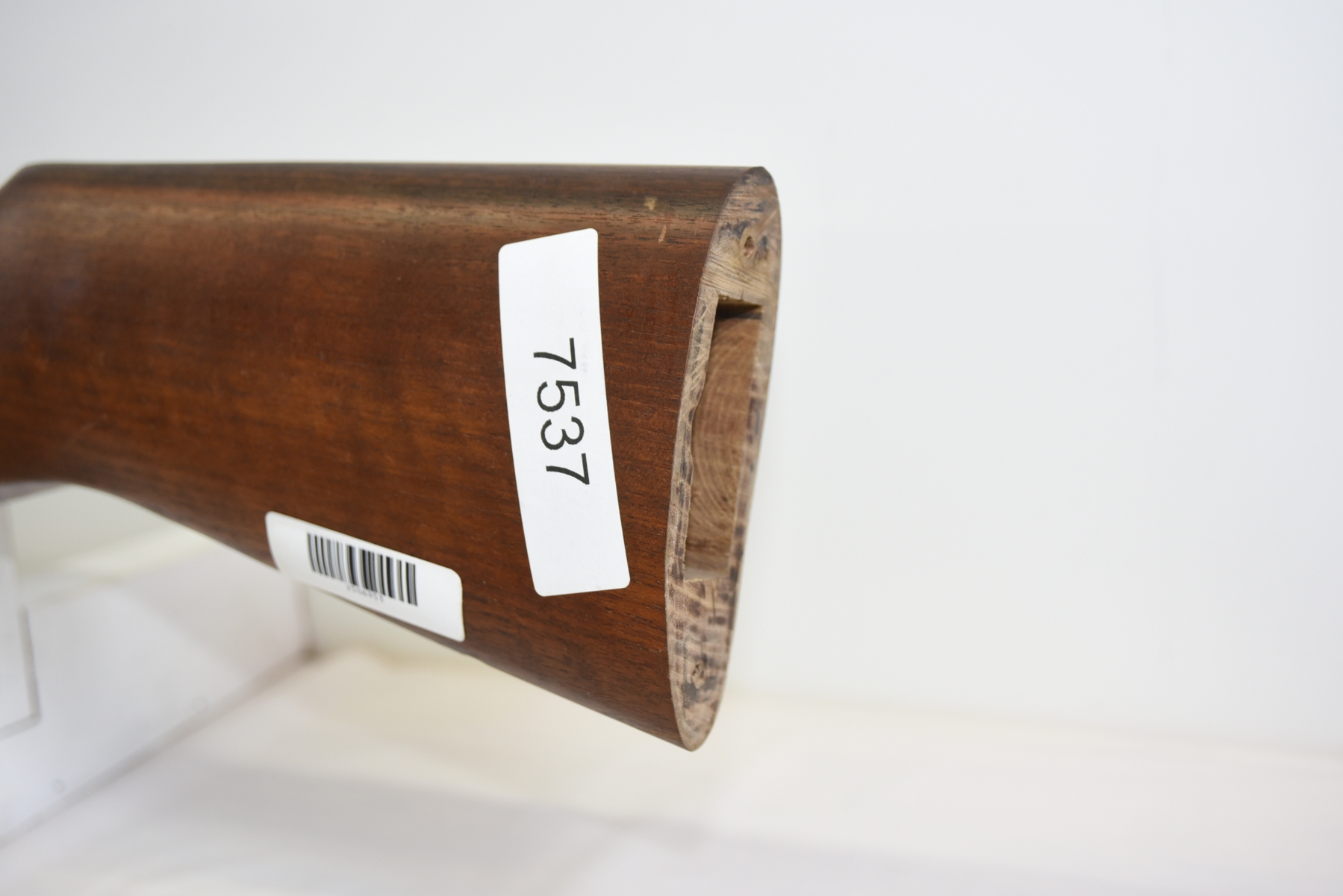 Wood stock shows forearm is not staying locked on barrel, rear sling mount is missing, butt plate is missing, there are scratches, scuffs, dents; condition is fair.