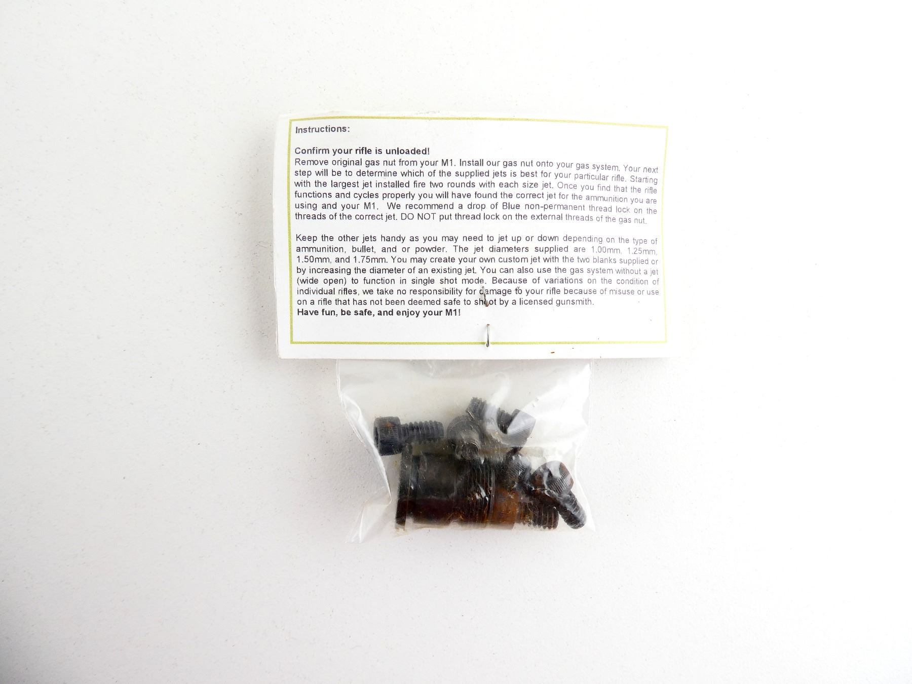 (1) GAS SYSTEM INCLUDES; GAS PLUG, (5) VARIOUS SIZE SCREWS, APPEARS NEW OLD STOCK IN ORIGINAL PACKAGING. MAY REQUIRE FITTING. SEE PHOTOS.