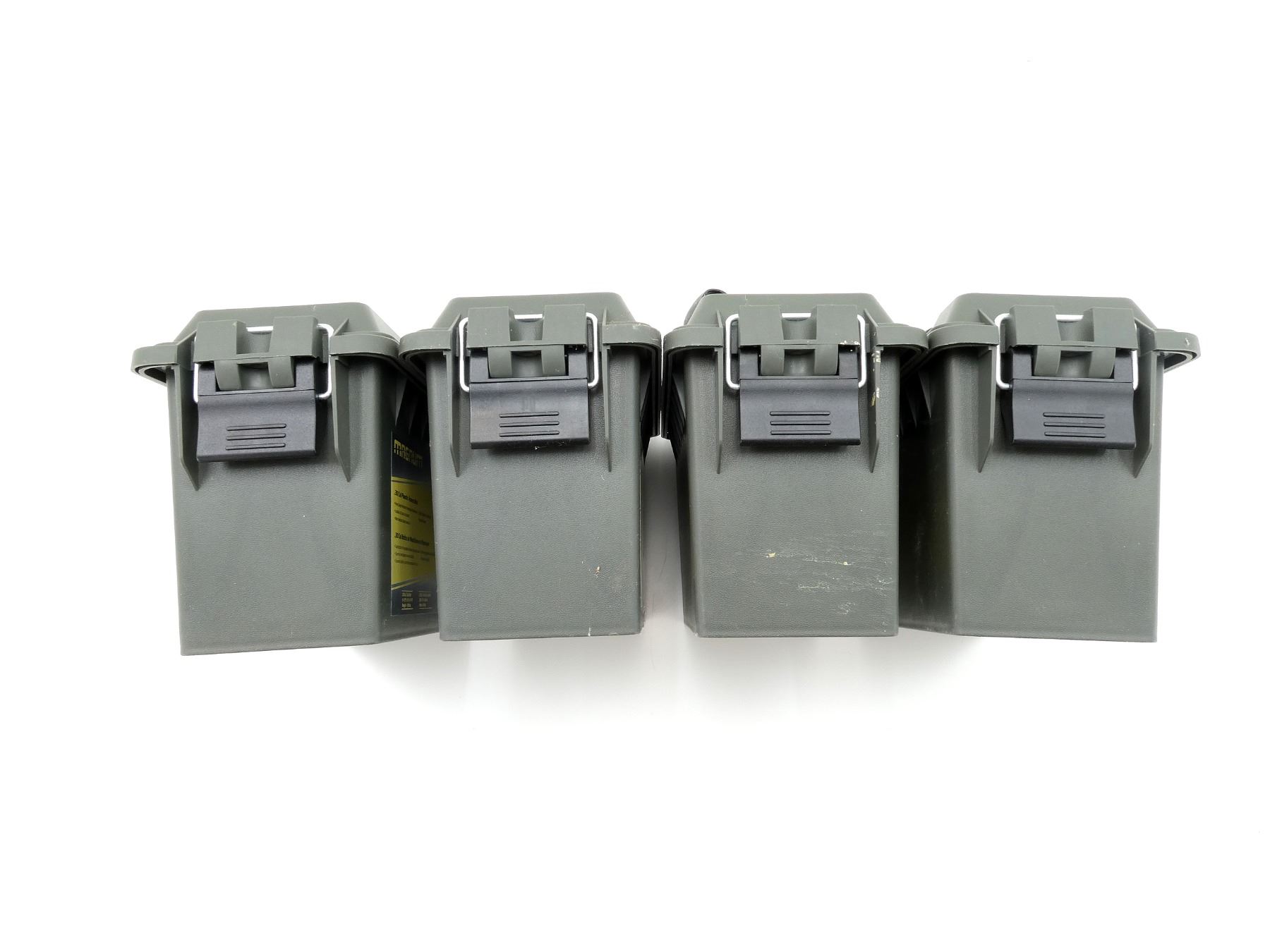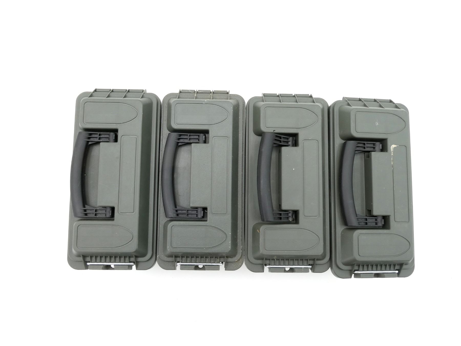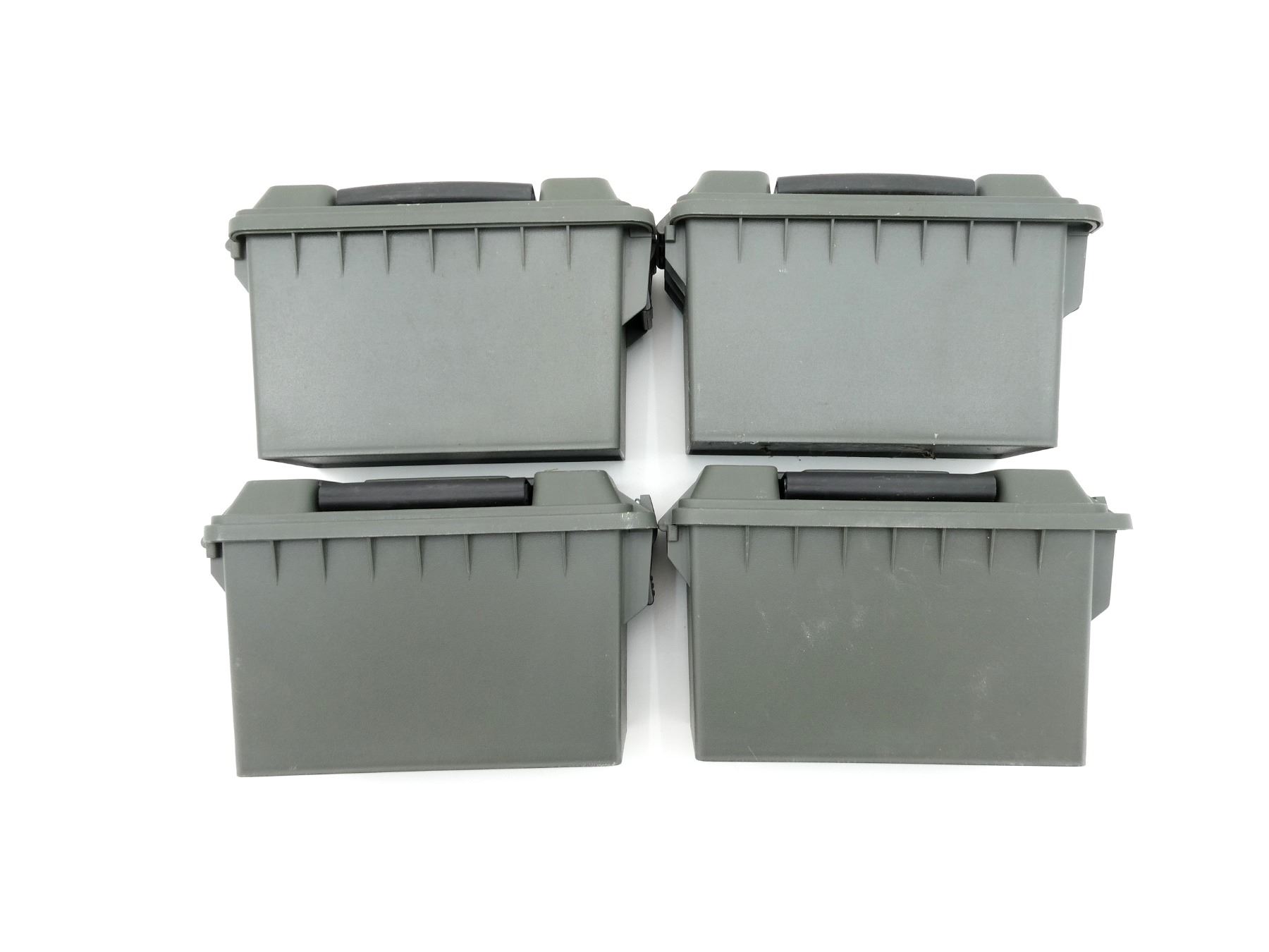 LOT INCLUDES; (4) GREEN POLYMER DRY AMMO / STORAGE BOXES, WITH CARRY HANDLE & LATCH, FITS .30 CAL., ETC. OVERALL LENGTH APPROX. 11.5" X 5" X 7.25". SEE PHOTOS.