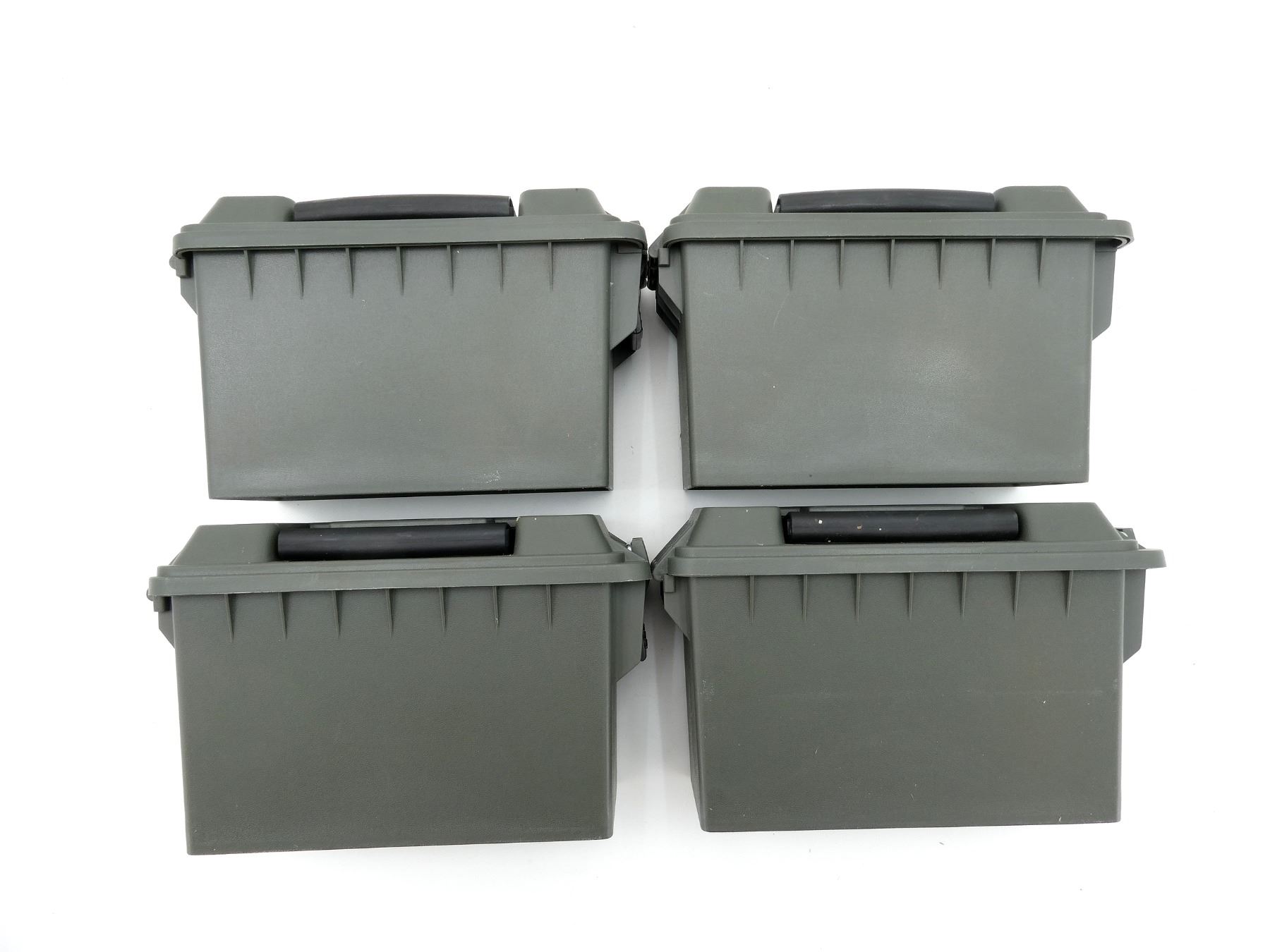 LOT INCLUDES; (4) GREEN POLYMER DRY AMMO / STORAGE BOXES, WITH CARRY HANDLE & LATCH, FITS .30 CAL., ETC. OVERALL LENGTH APPROX. 11.5" X 5" X 7.25". SEE PHOTOS.