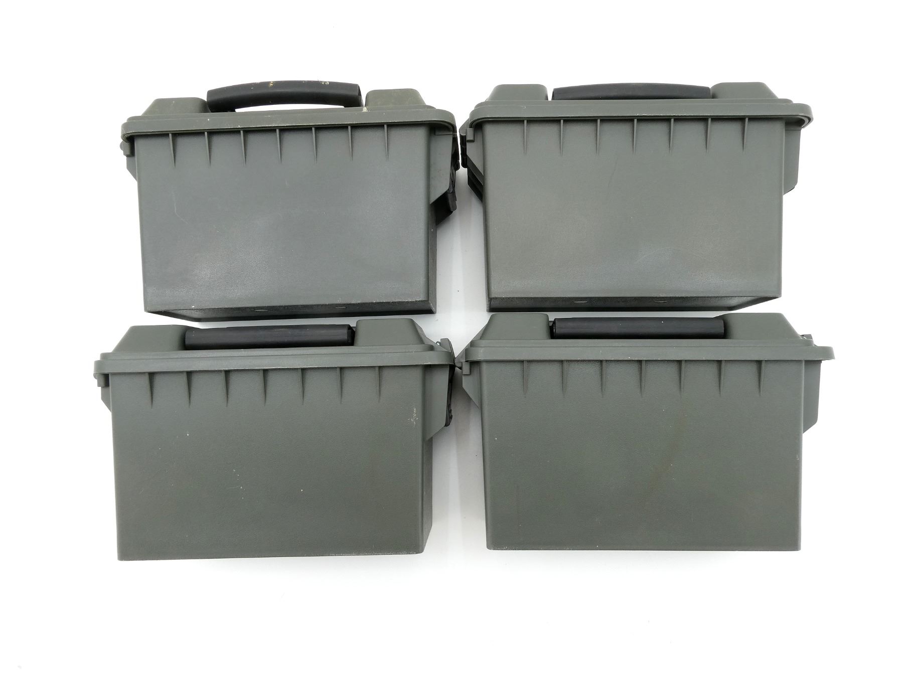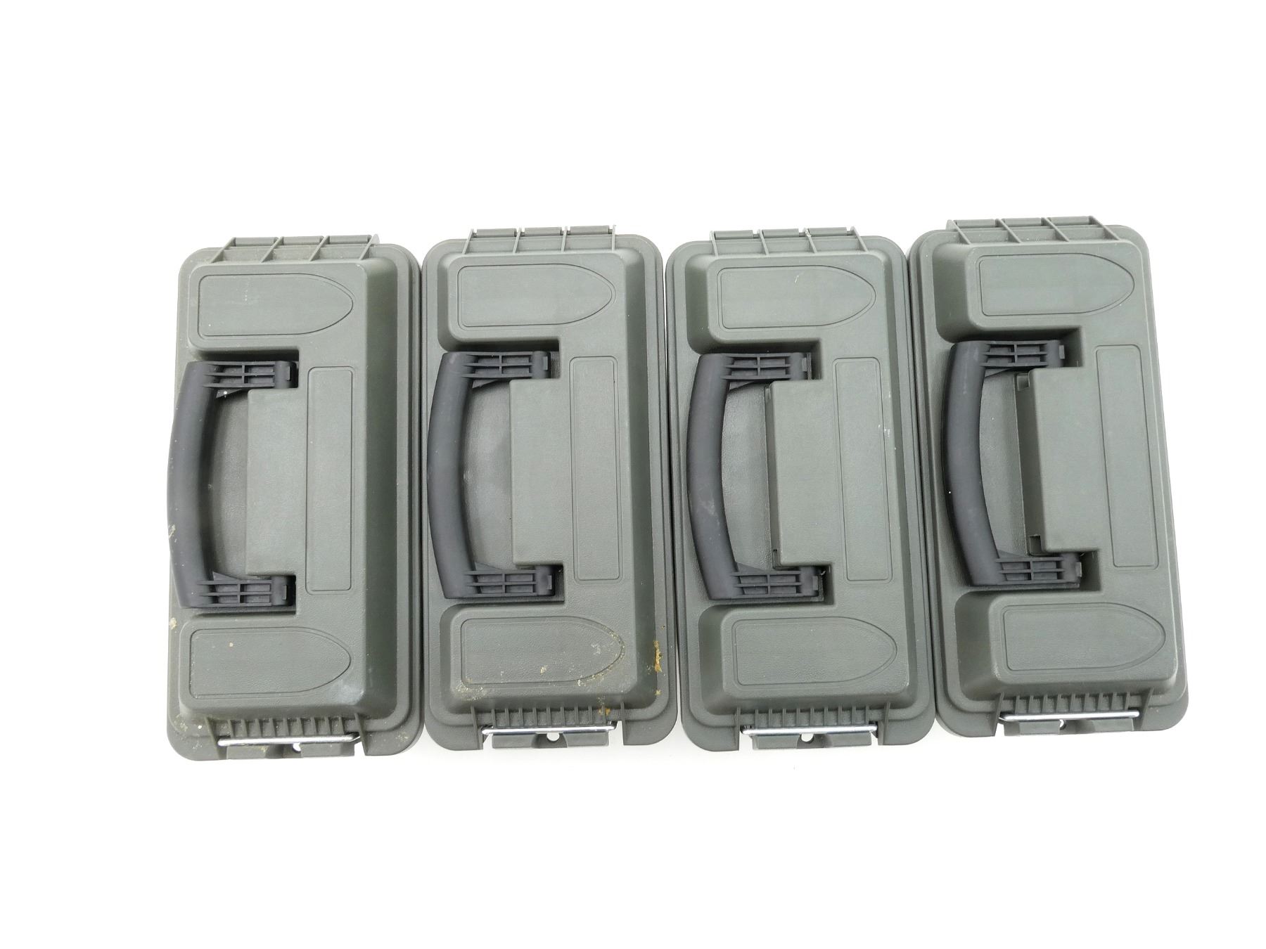 LOT INCLUDES; (4) GREEN POLYMER DRY AMMO / STORAGE BOXES, WITH CARRY HANDLE & LATCH, FITS .30 CAL., ETC. OVERALL LENGTH APPROX. 11.5" X 5" X 7.25". SEE PHOTOS.