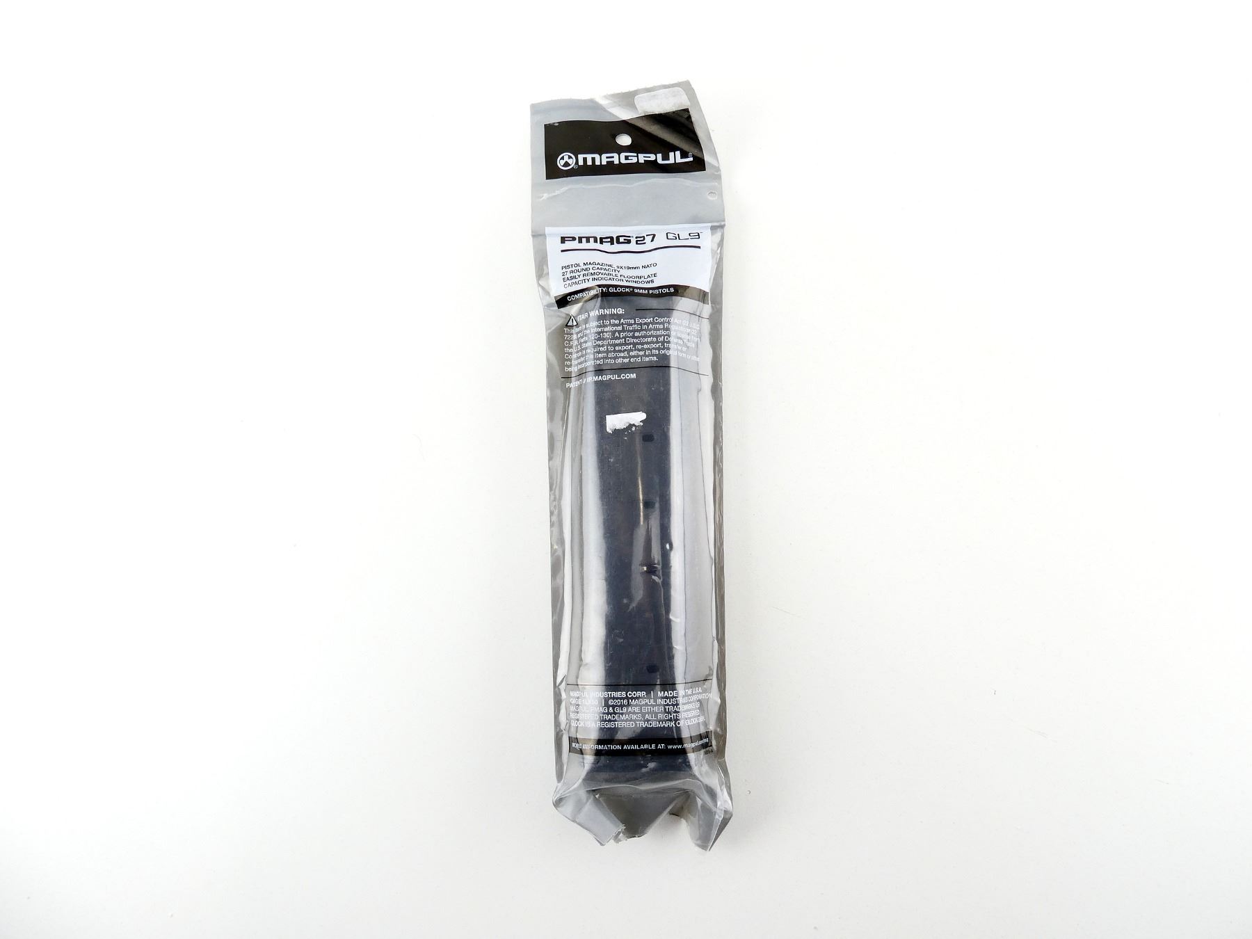(1) 9X19MM NATO MAG, 10/27 ROUND PINNED MAG, BLACK POLYMER CONSTRUCTION, BASE MARKED: "PMAG 27 GL 9", ETC. SEE PHOTOS. PAL REQUIRED.