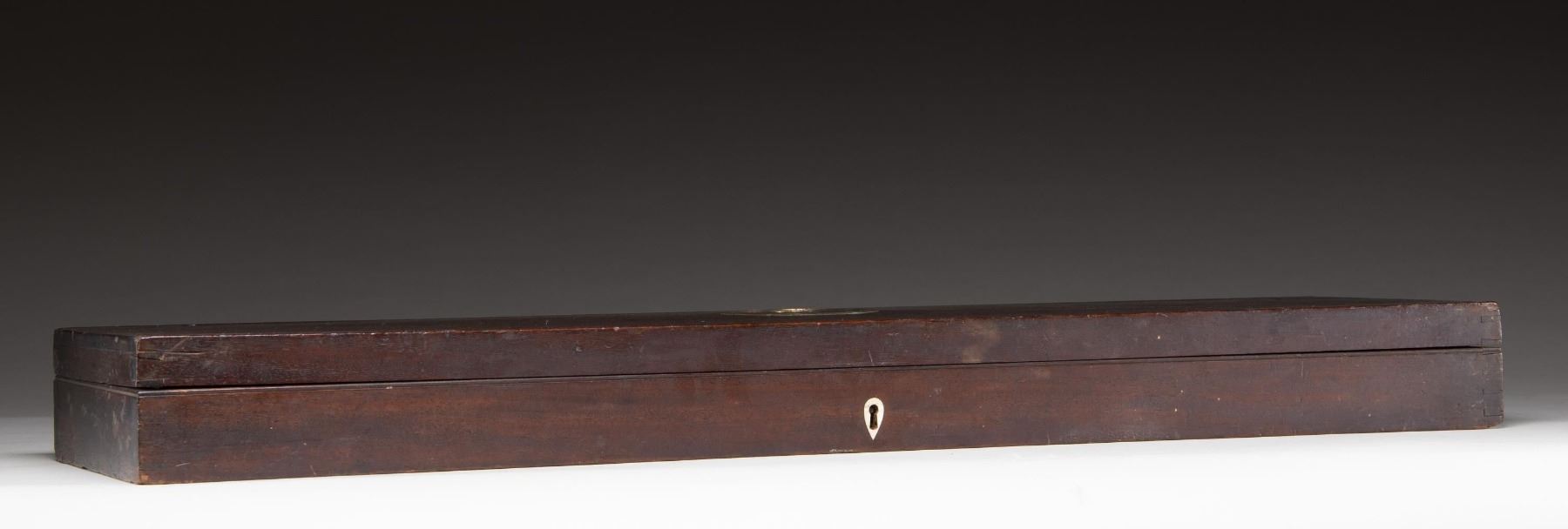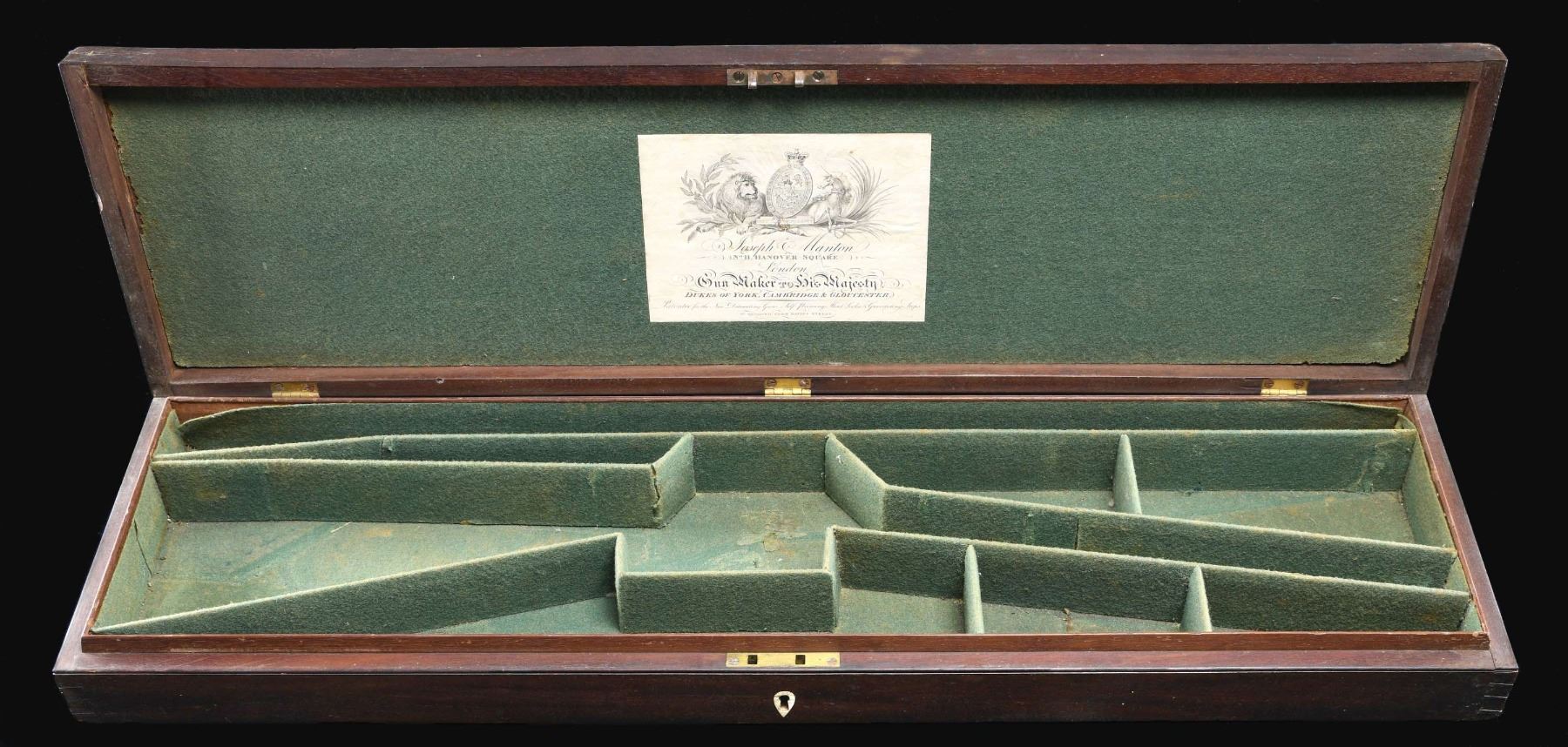 MANTON LABEL. Case measures approx. 34.5" x 9.5" x 3.5". Case has green cloth compartmentalized interior. Lid has Joseph Manton label. Case able to hold 32" barrel. CONDITION: Case has good exterior finish showing light marks & mildew stains; lid has circular black marker stain & large crack near right corner. Green cloth interior has fair overall appearance with portions peeling off, scrapes & marks. PROVENANCE: from the renowned collection of quality sporting arms from Lewis Drake together with inventory of Lewis Drake Associates. (02-23961/MD). $500-1,000.