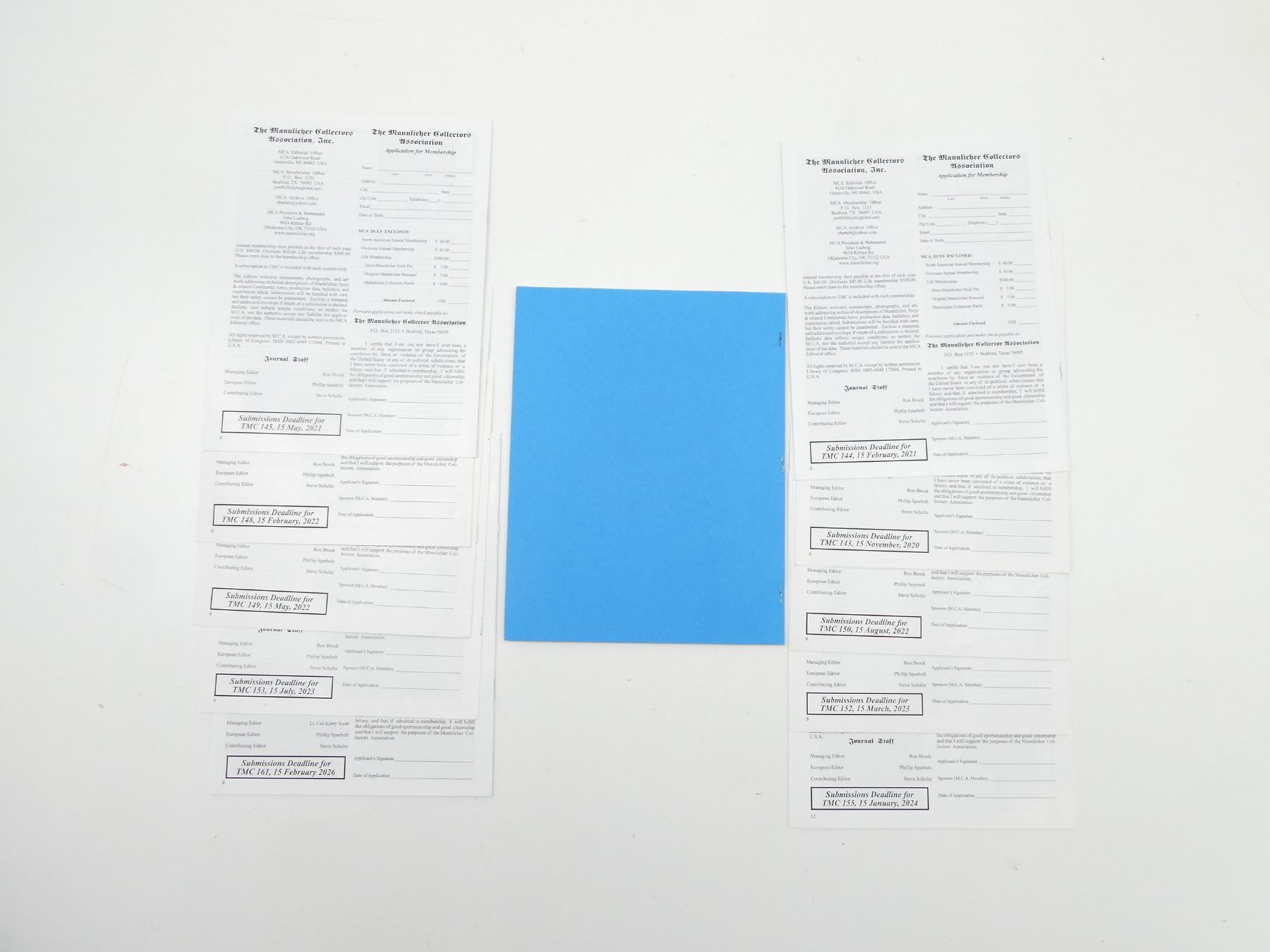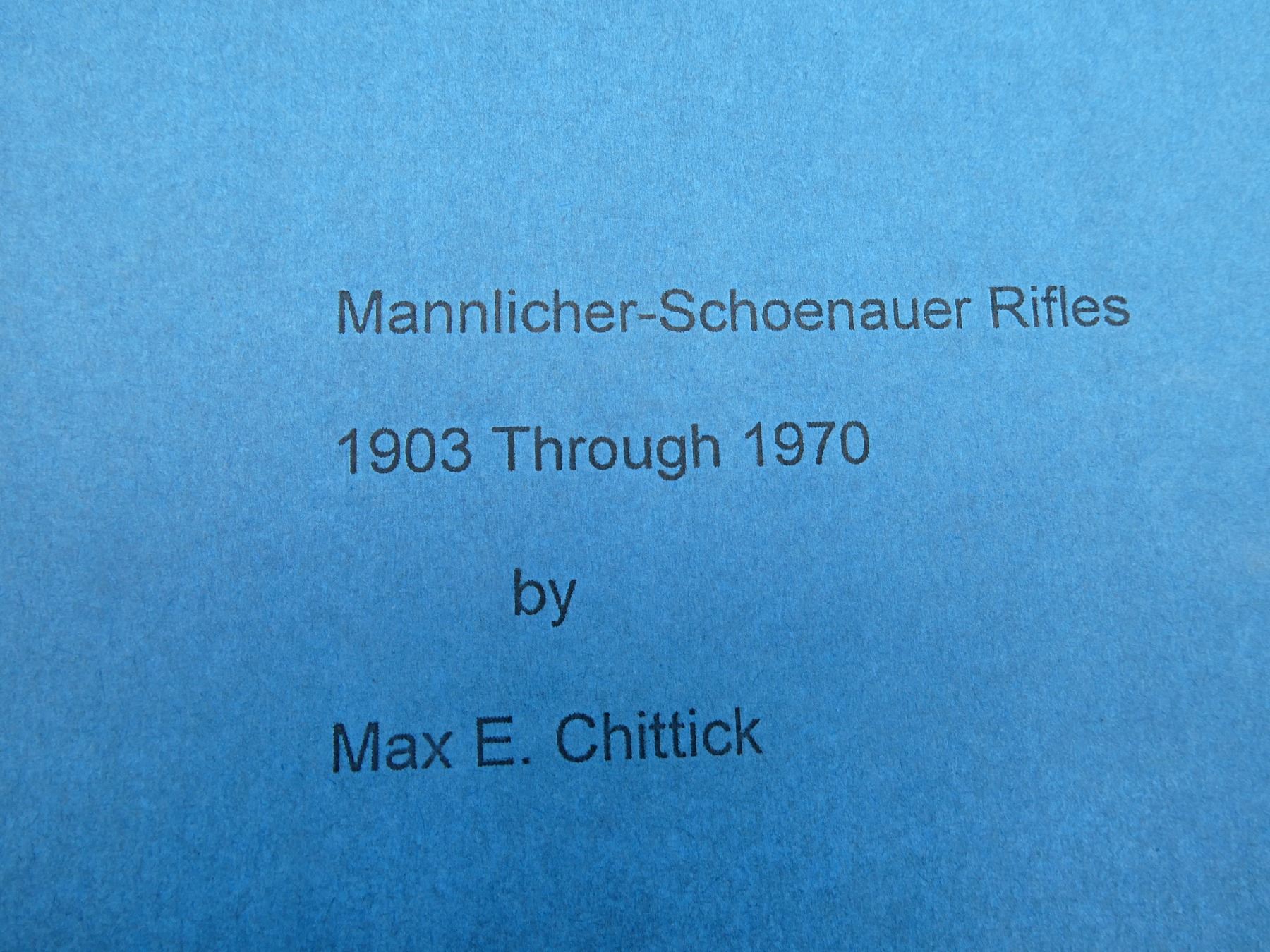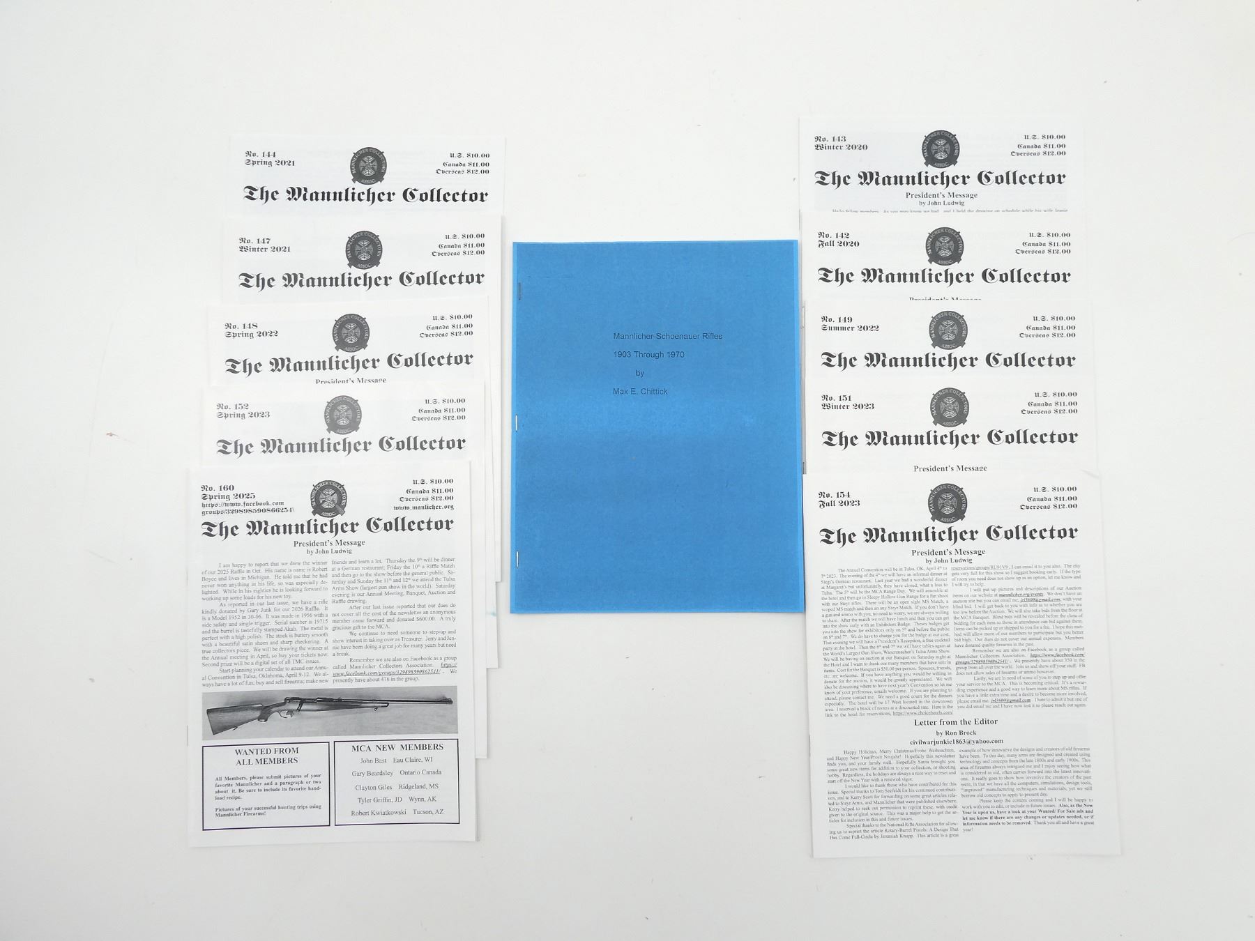 LOT INCLUDES; (1) "MANNLICHER-SCHOENAUER RIFLES 1903 THROUGH 1970", BY MAX E. CHITTICK, STAPLED SOFT COVER & APPROX. (10) "THE MANNLICHER COLLECTOR" MAGAZINES, ISSUES 142-160, ASSORTED DATES, SERIES NOT COMPLETE / SOME ISSUES MISSING / MAY CONTAIN DUPLICATES. SEE PHOTOS.