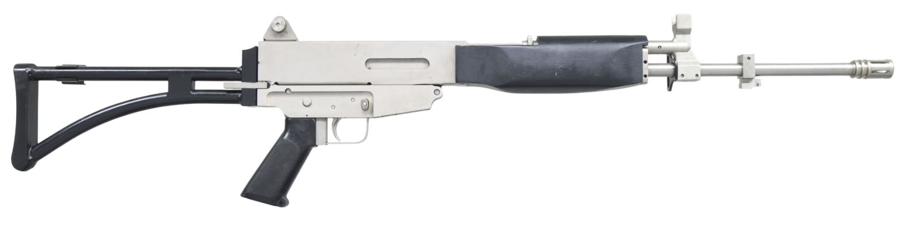 WITH SIDE FOLDING STOCK. Cal. 5.56mm. S# R00889. Bbl.18". A rare, marine finish Bushmaster Rifle from the Portland Maine location. Threaded barrel. terminated w/ A1 flash hider. Protected post front sight. Left side mounted charging handle. Steel upper & aluminum lower receivers. Left side safety / selector. Dual aperture rear protected peep sight. Black plastic pistol grip. Matching hardwood forend & shoulder stock. Satin Marine finish on all exterior metal surfaces. Sling swivels at front. CONDITION: Finish on receivers complete & consistent w/ full coverage. Some gentle thinning. Stock & forend in very nice condition. Left side folding stock locks correctly when extended. Magnet that typically holds stock when folded is absent. Bright bore w/ strong rifling. Fire control mechanism appears to function correctly when cycled by hand. (25-3330/JZ). MODERN. $700-1,100.