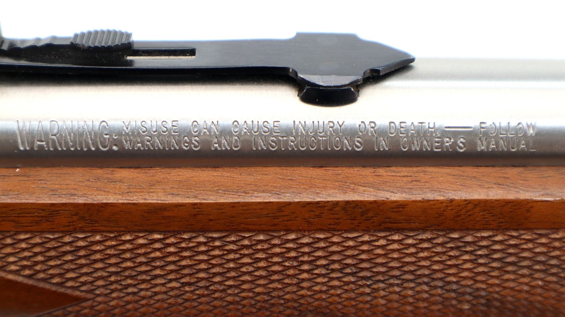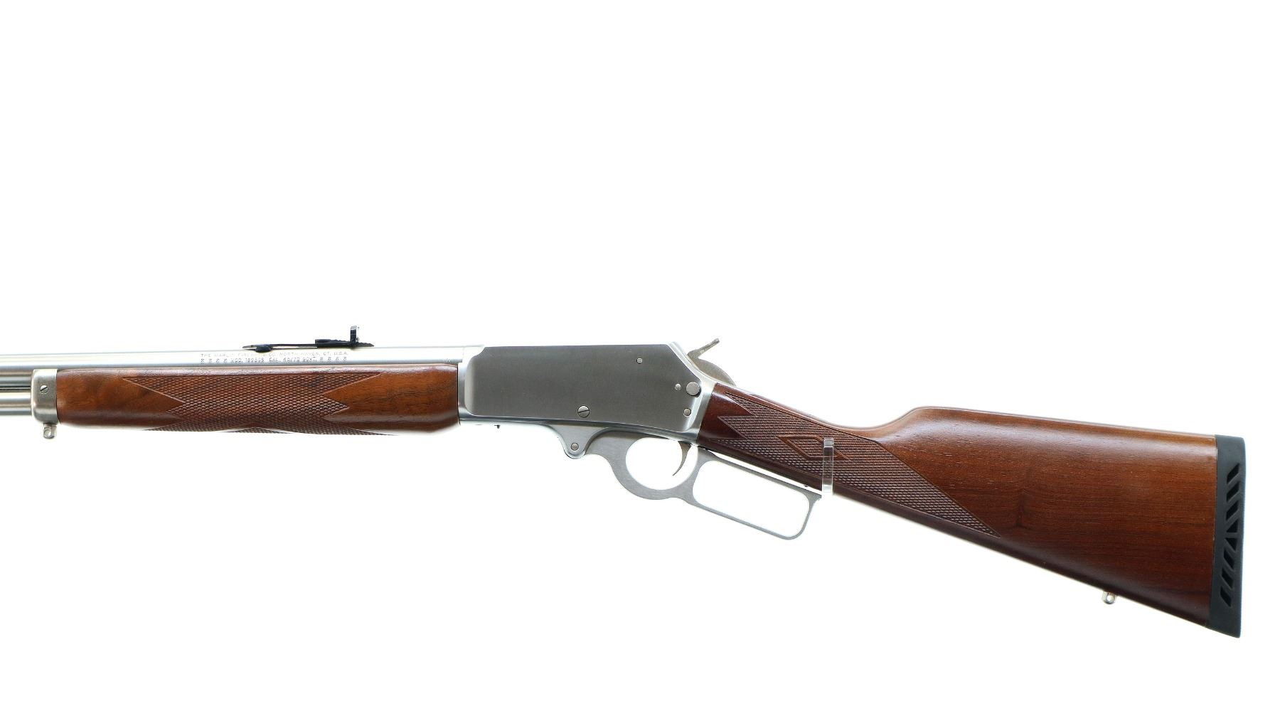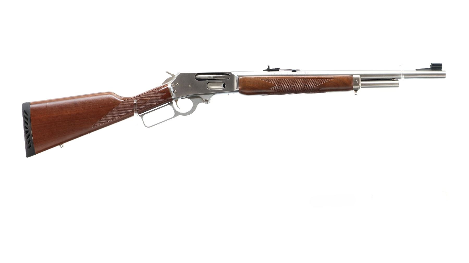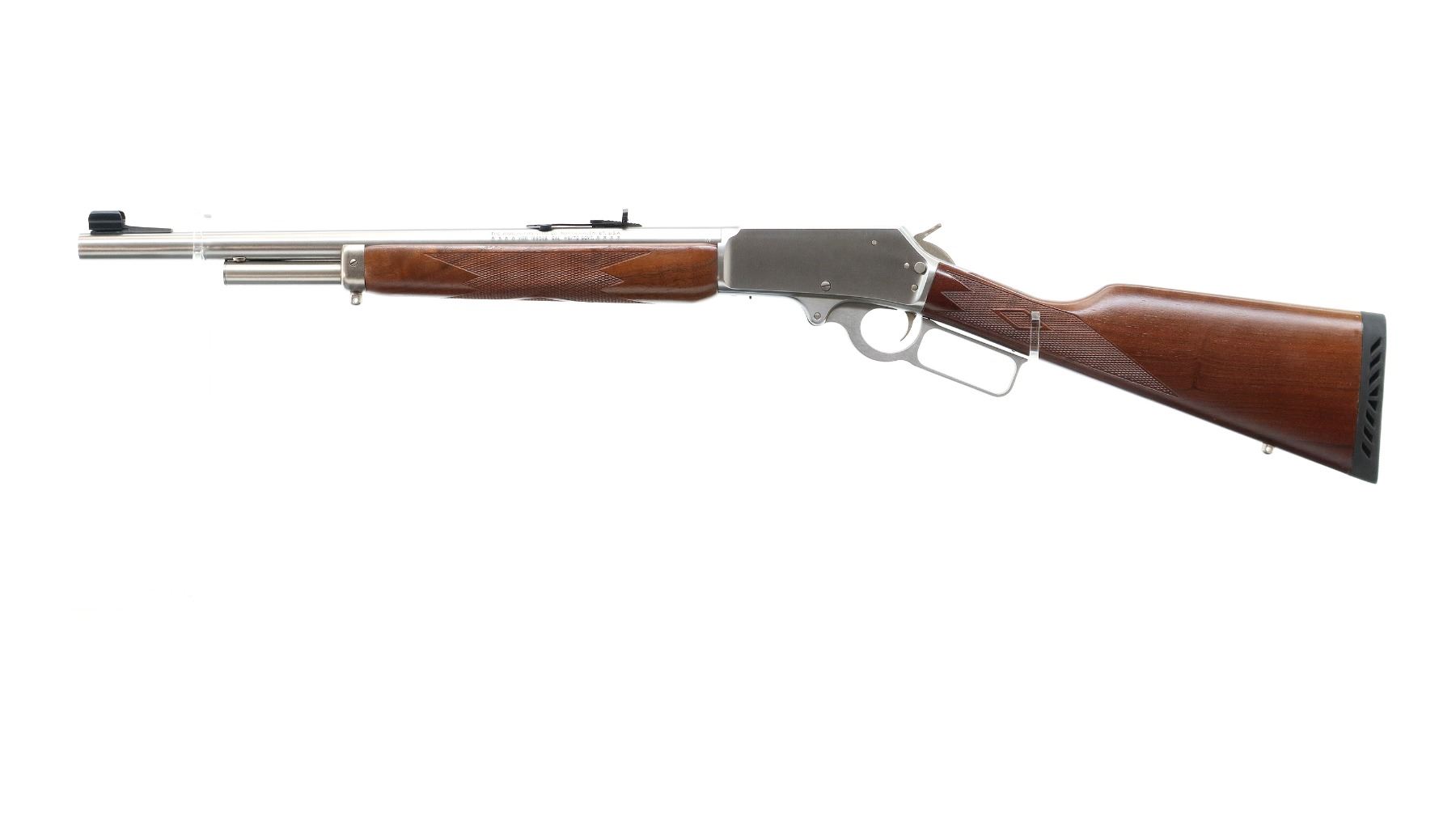 Main Description: Blade front sight with hood and ramp, adjustable folding u notched rear sight, stainless finish, receiver drilled and tapped with no plug screws installed, grooved spur hammer, crossbolt safety. Two piece Satin finish wood stocks, checkered forearm and straight grip, black vented rubber recoil pad, 3/4 length magtube, swivel studs.