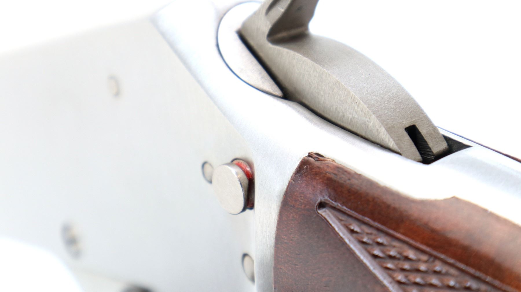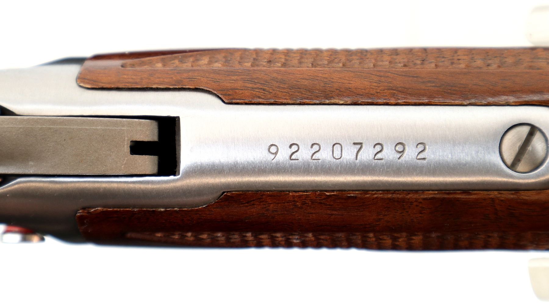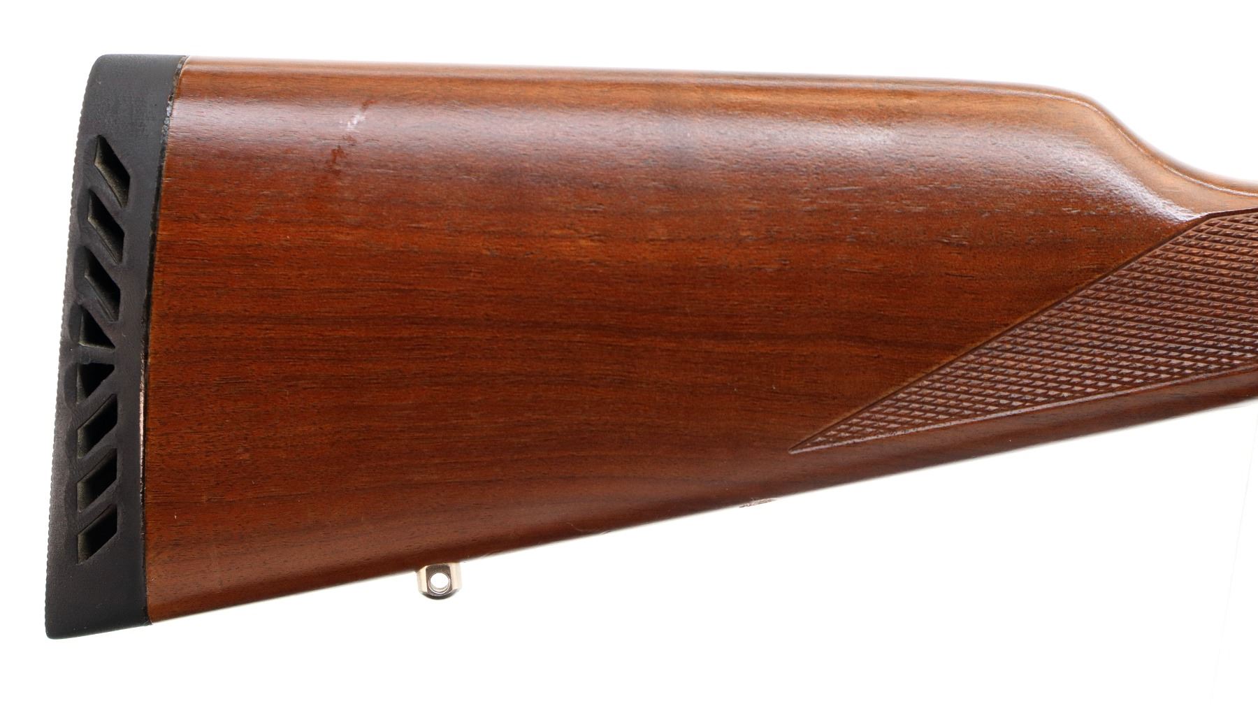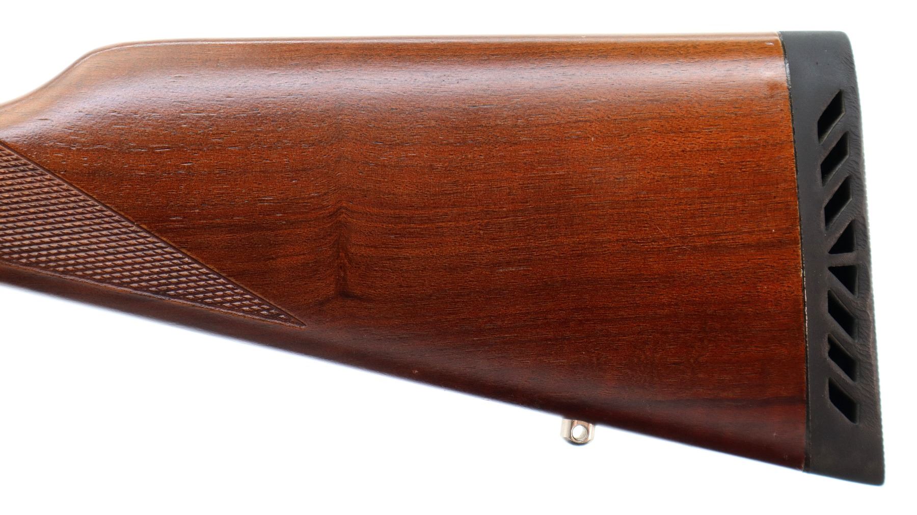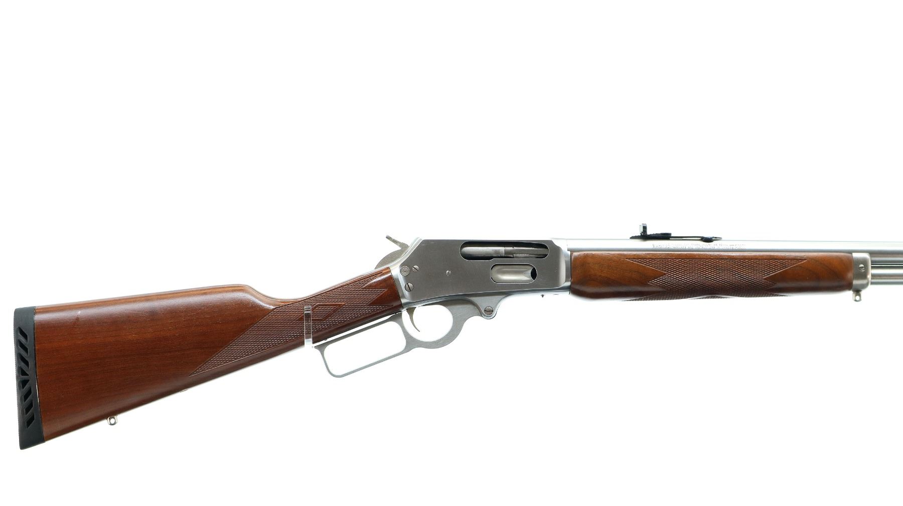 Main Description: Blade front sight with hood and ramp, adjustable folding u notched rear sight, stainless finish, receiver drilled and tapped with no plug screws installed, grooved spur hammer, crossbolt safety. Two piece Satin finish wood stocks, checkered forearm and straight grip, black vented rubber recoil pad, 3/4 length magtube, swivel studs.