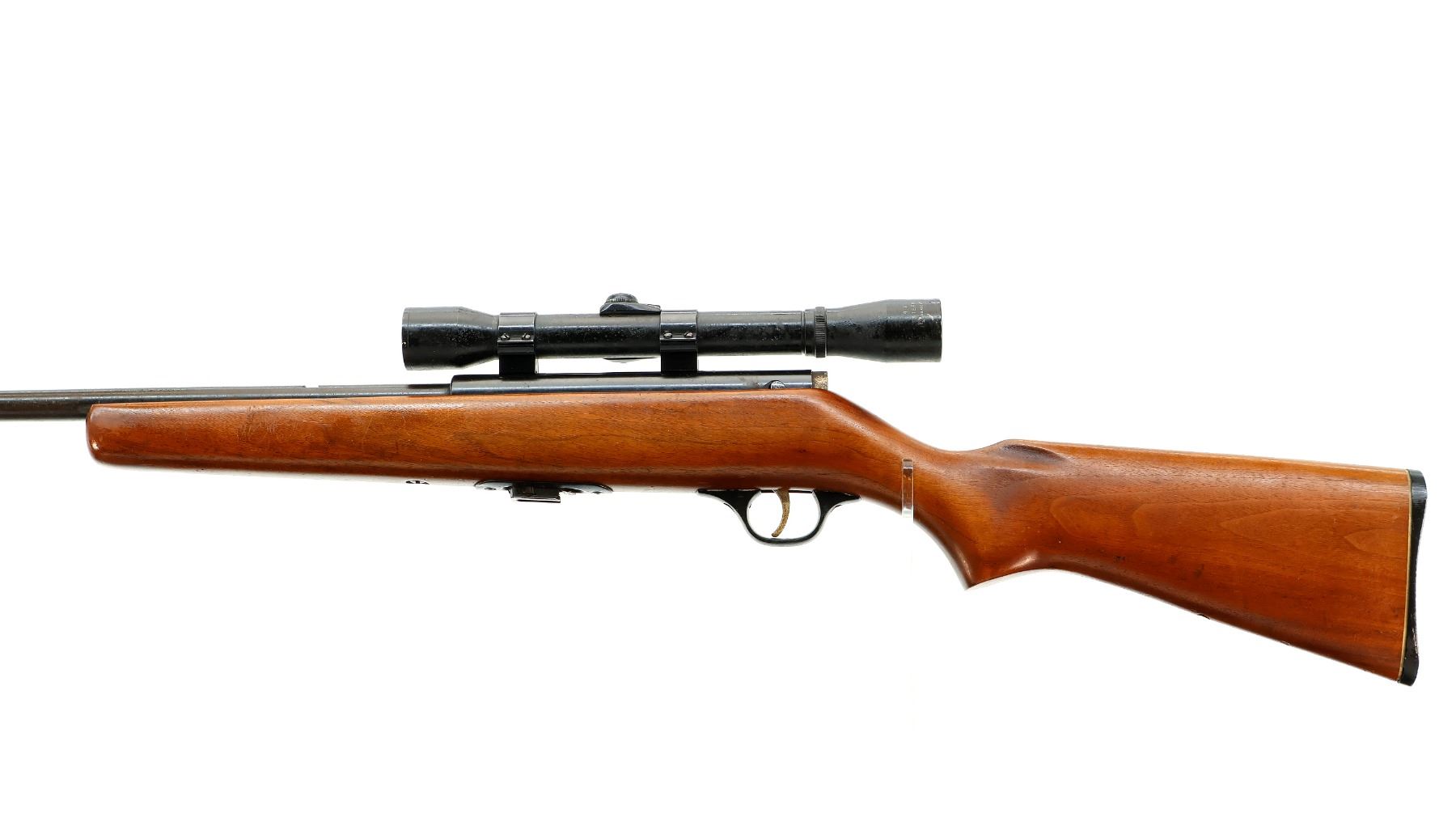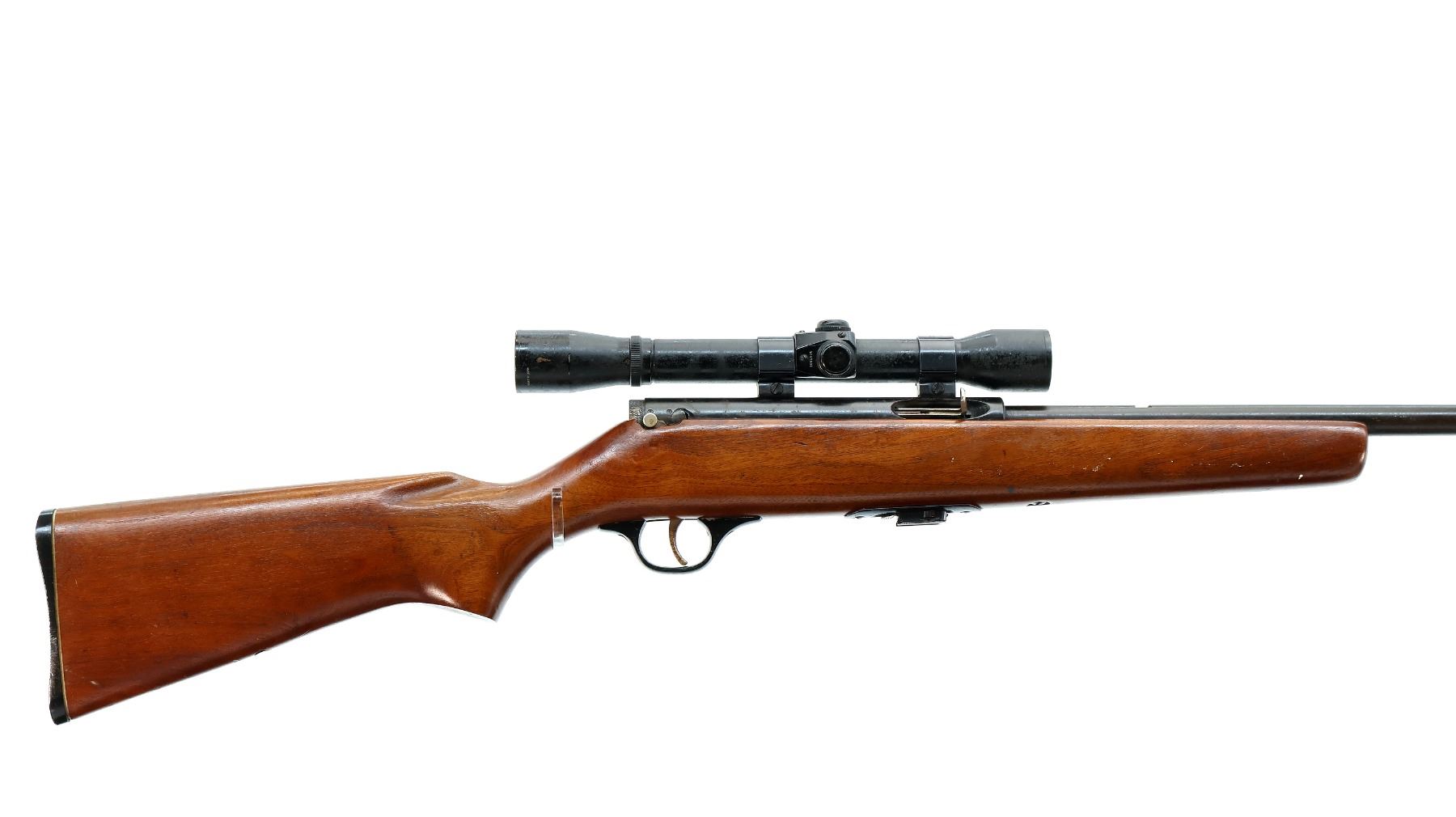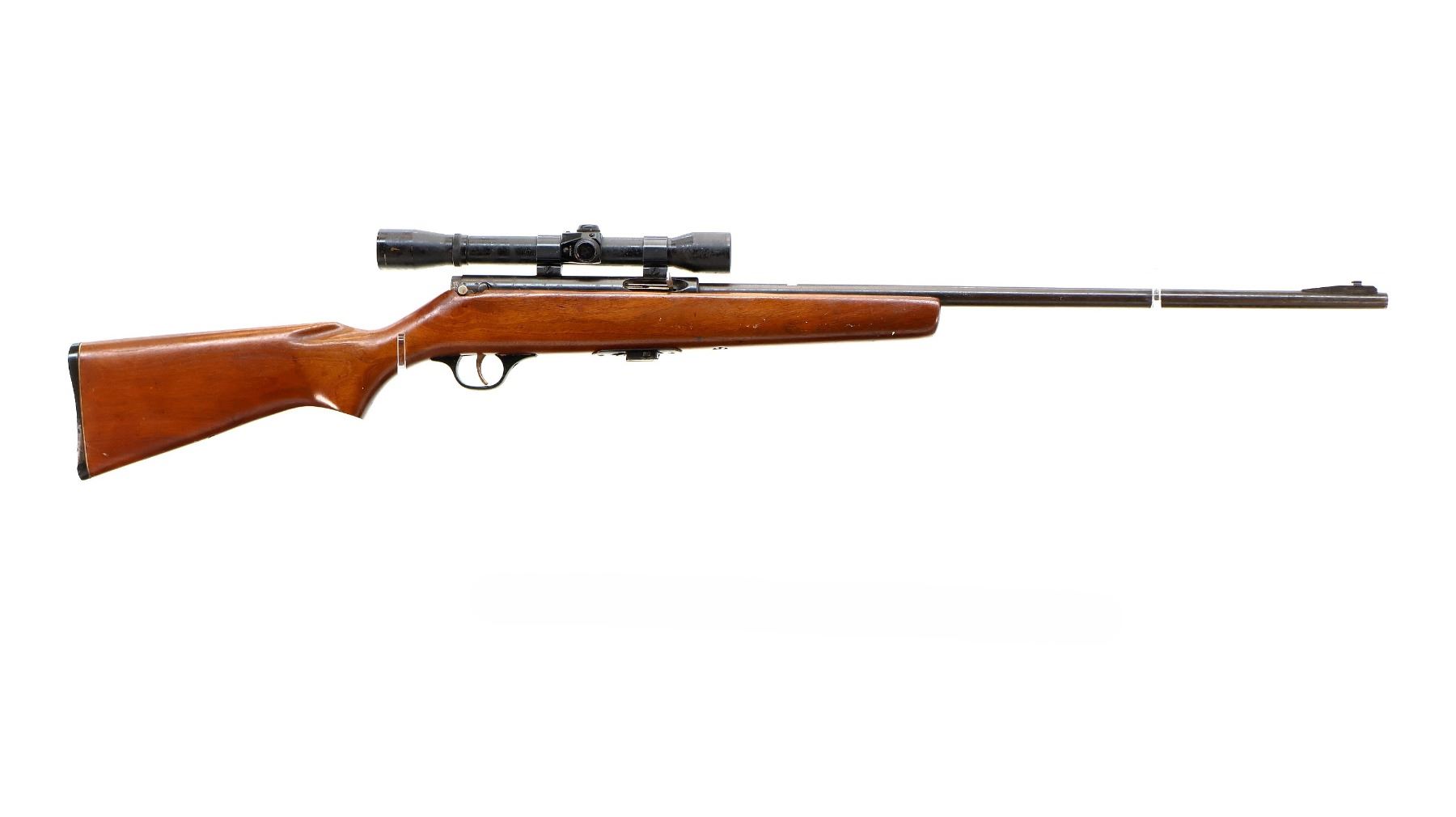 Main Description: Blade front sight with ramp, missing rear sight dovetail present, grooved receiver with Stern 4x scope exterior is corroded, hazy optics with fine crosshair. One piece wood stock, pistol grip, checkered black polymer butt plate, missing Marlin Bullseye
