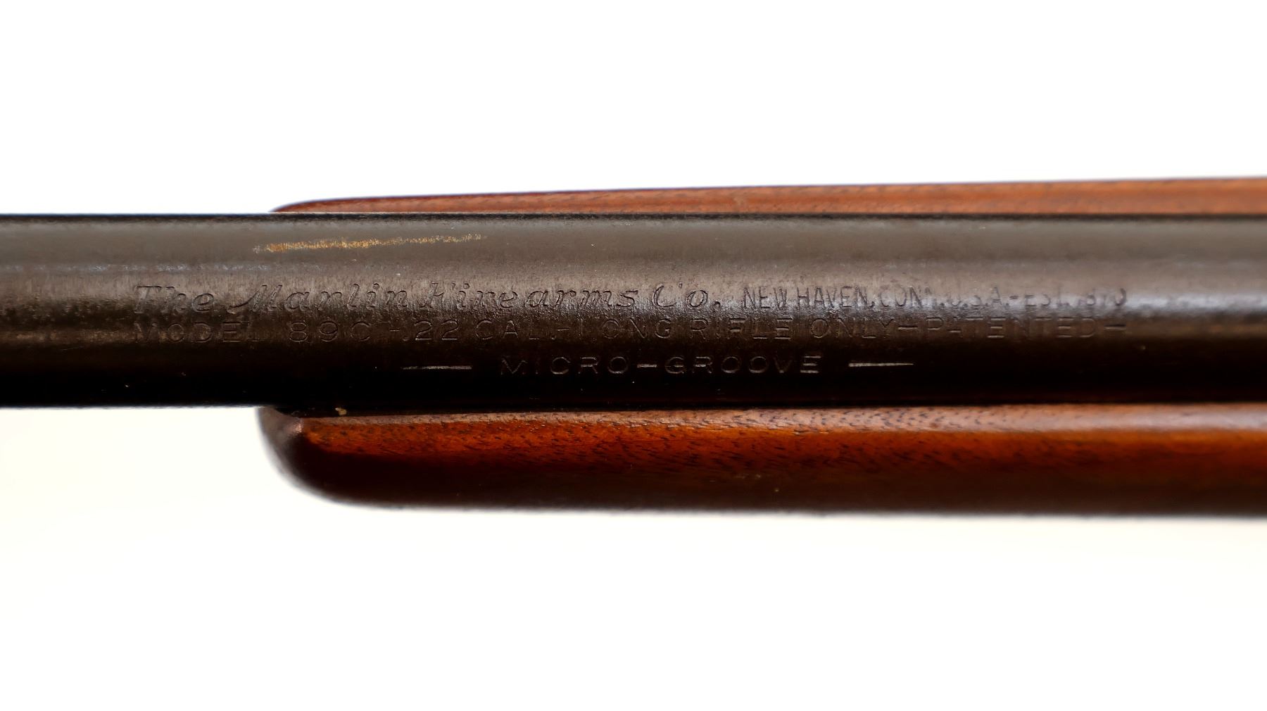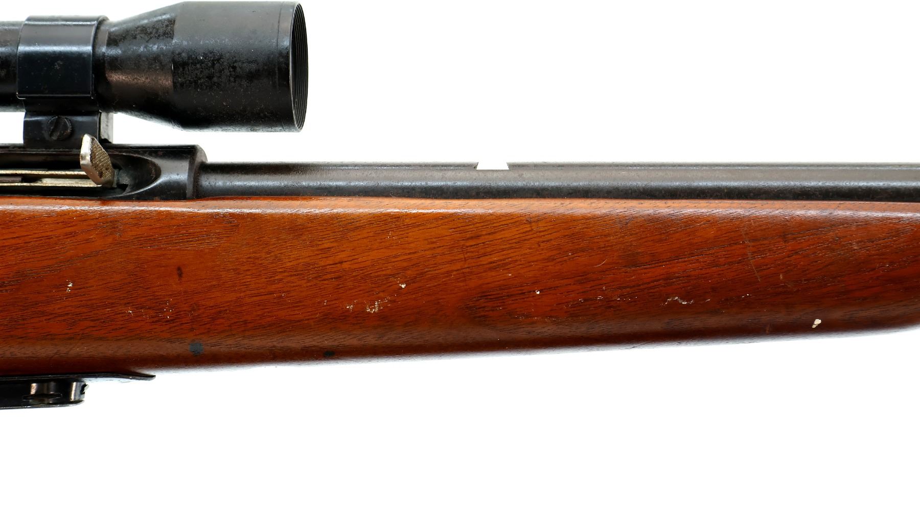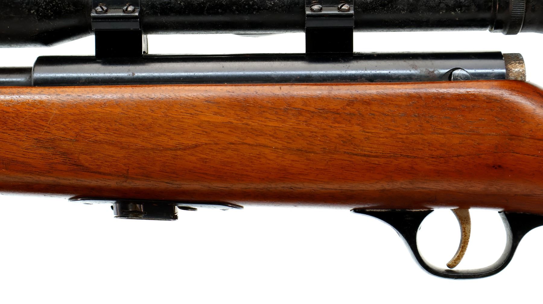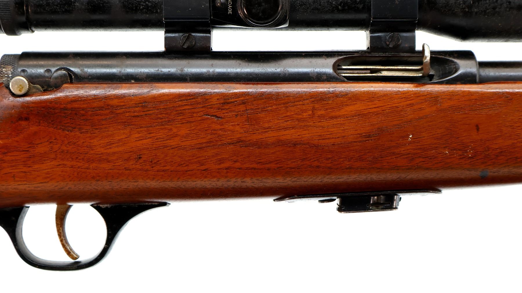 Main Description: Blade front sight with ramp, missing rear sight dovetail present, grooved receiver with Stern 4x scope exterior is corroded, hazy optics with fine crosshair. One piece wood stock, pistol grip, checkered black polymer butt plate, missing Marlin Bullseye