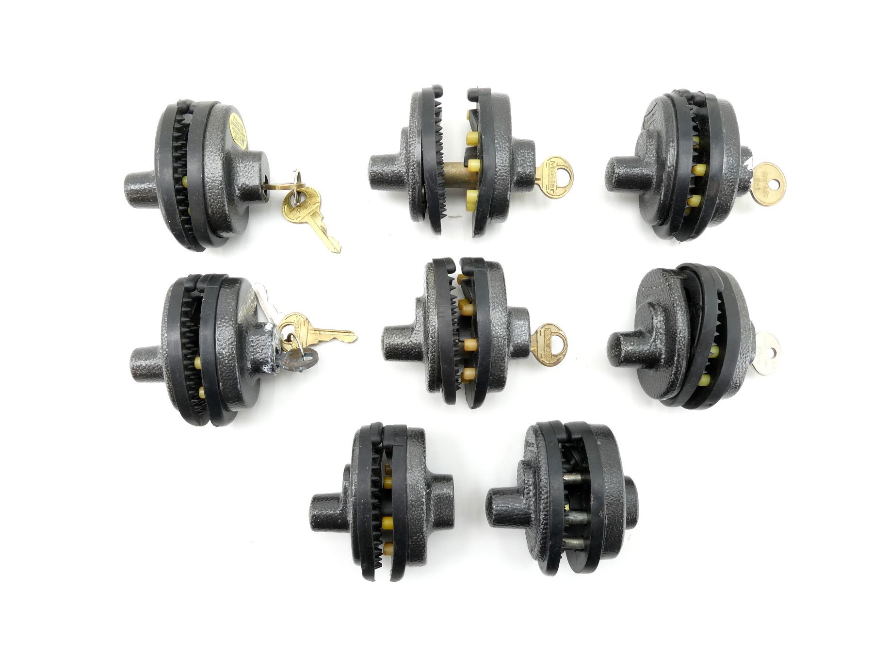 LOT INCLUDES; (8) KEYED TRIGGER LOCKS, WITH KEYS, BLACK, MARKED: "MASTER". SEE PHOTOS.
