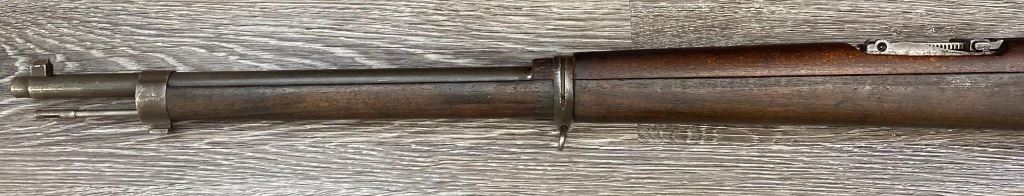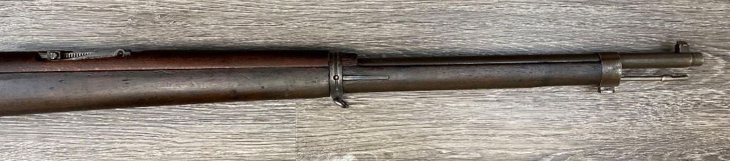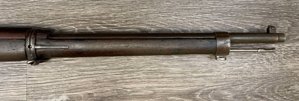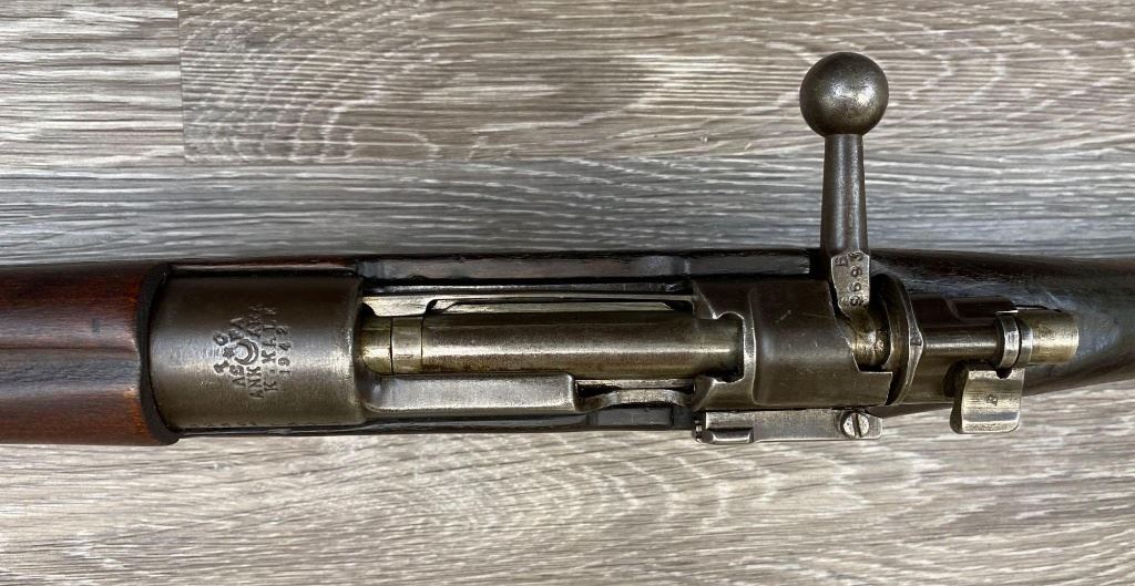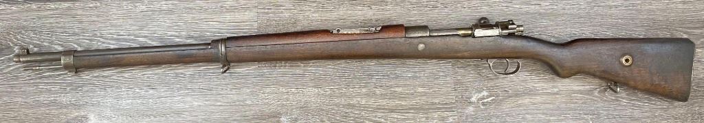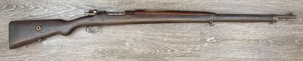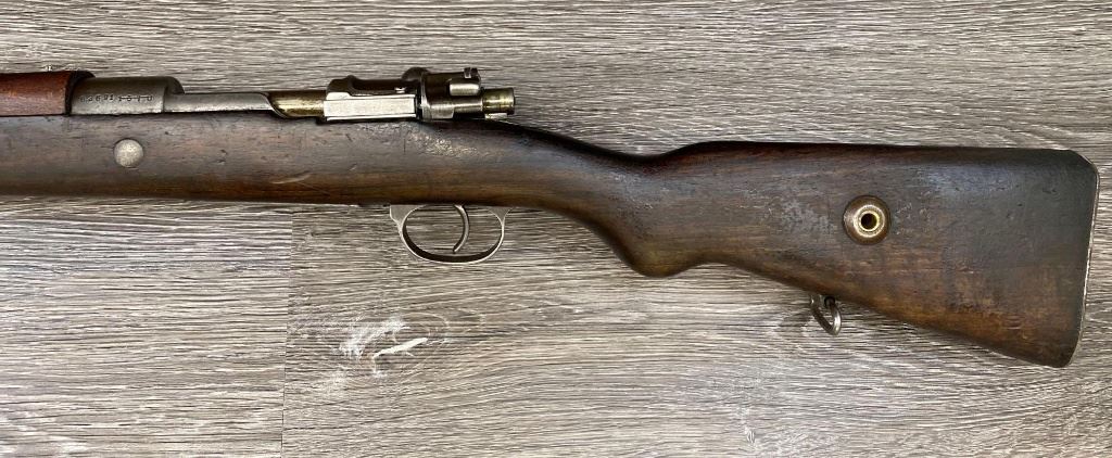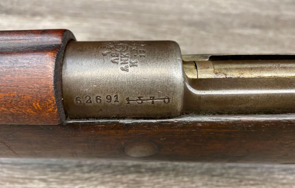 WW II era Turkish K98 Mauser bolt action rifle, 8mm cal., 29" barrel, blue finish, barrel is import marked on the right side of the barrel at the muzzle, smooth wood military stock with indentations, dents and dings consistent with service use.  The rifle is in very good overall condition, retaining traces of original finish drifting to an even gray patina.  The front ring is dated 1942 with a Turkish crescent moon emblem.  The stock is good and ends with a smooth steel butt plate.  The bore is good with scattered roughness and visible rifling.  The action functions well and contains old packing grease.  (C+R/PPT).