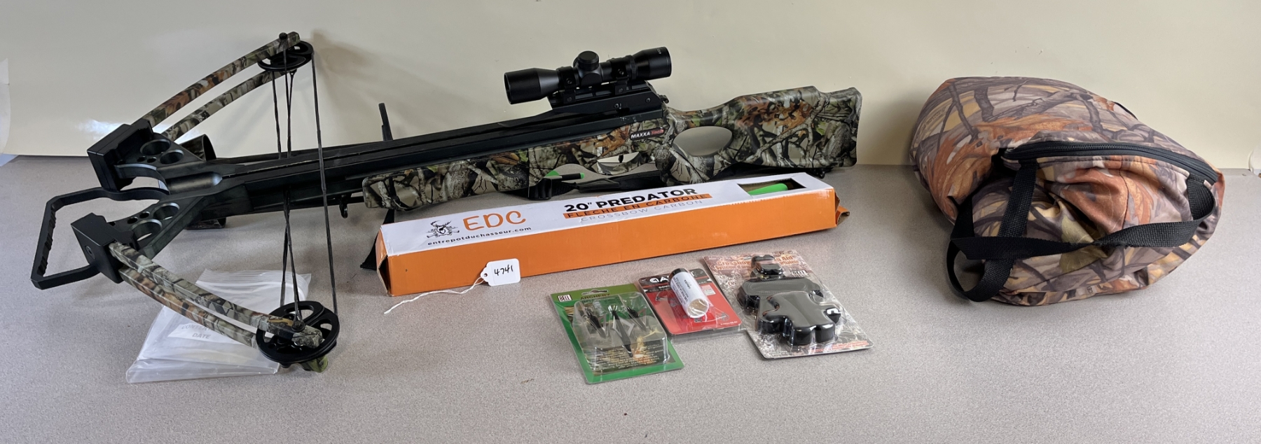 CONDITION: G OVERALL INCL STRING AND CABLES. SPECS: APPROX 42IN OVERALL, UNKNOWN DRAW WEIGHT. EXTRA: CAMOUFLAGE SOFTCASE, 8X 20IN BOLTS WITH FIELD TIPS, BELL COCKING AID, BOW STRING WAX, 3X 125 GR. BELL BROAD HEADS. S/N: NONE.